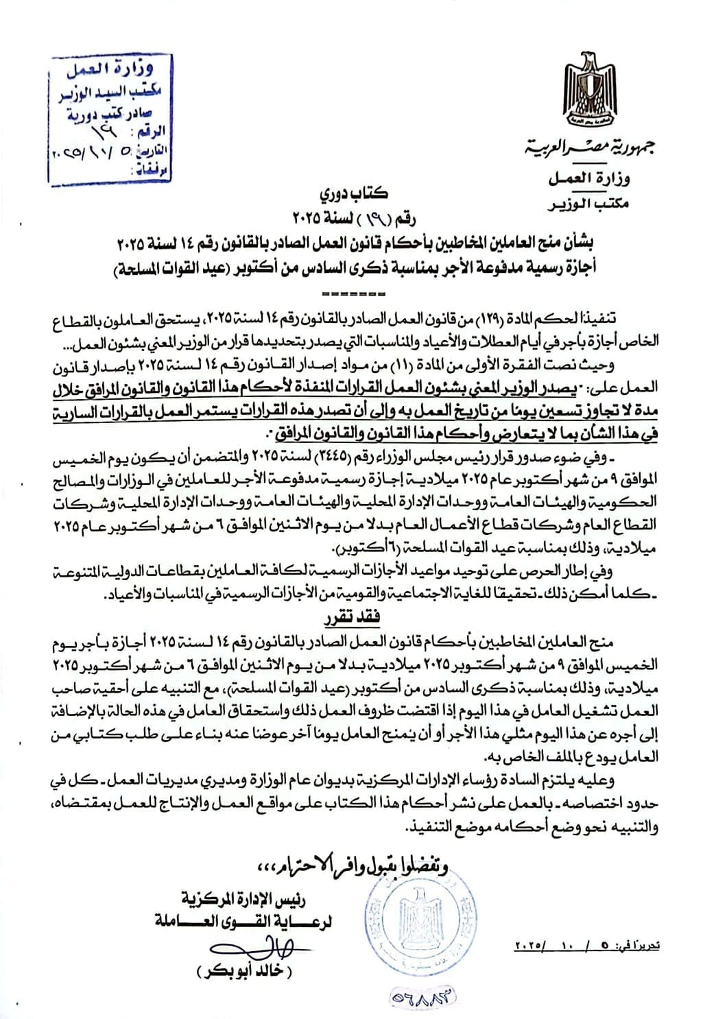 وأصدرت وزارة العمل، الكتاب الدوري رقم "19" لسنة 2025 بشأن منح العاملين الخاضعين لأحكام قانون العمل إجازة رسمية مدفوعة الأجر بهذه المناسبة، تنفيذًا لحكم المادة "129" من قانون العمل، وحرصًا على توحيد مواعيد الإجازات الرسمية لكافة قطاعات الدولة تحقيقًا للغاية الاجتماعية والقومية منها.