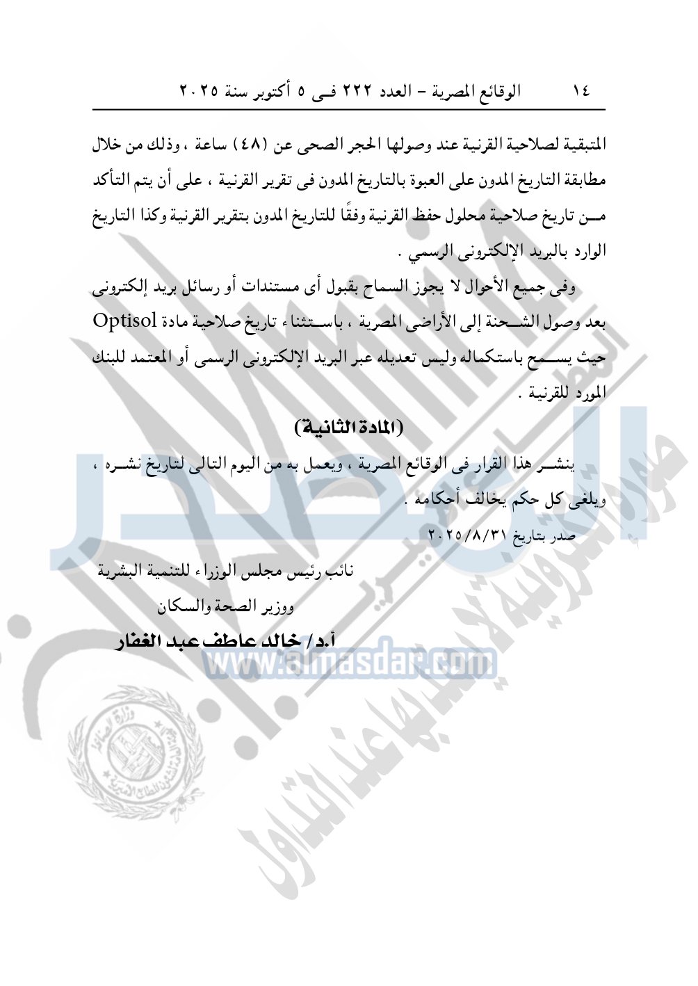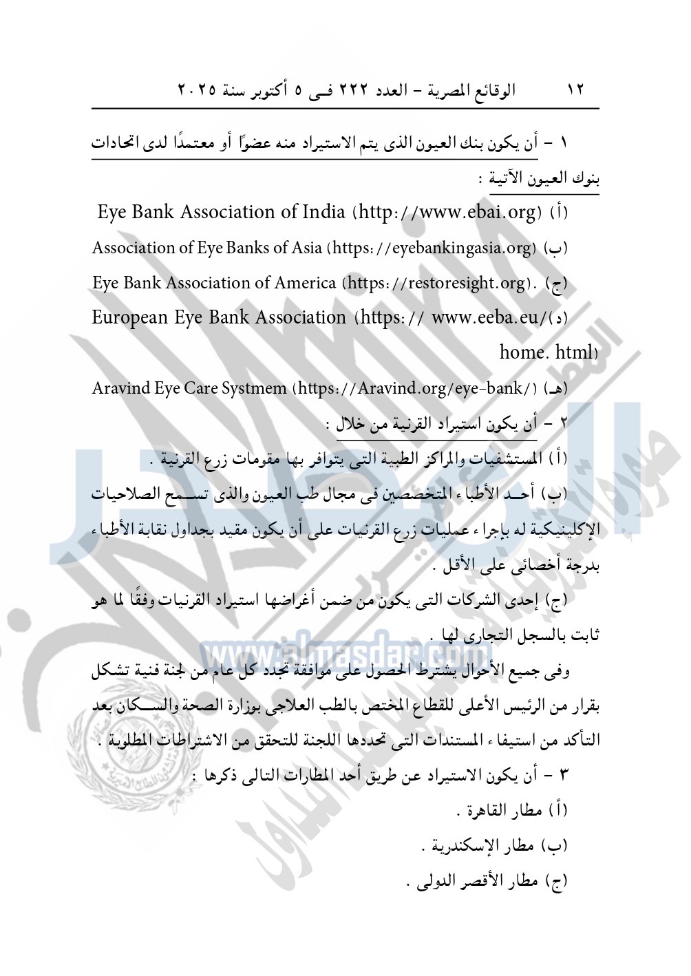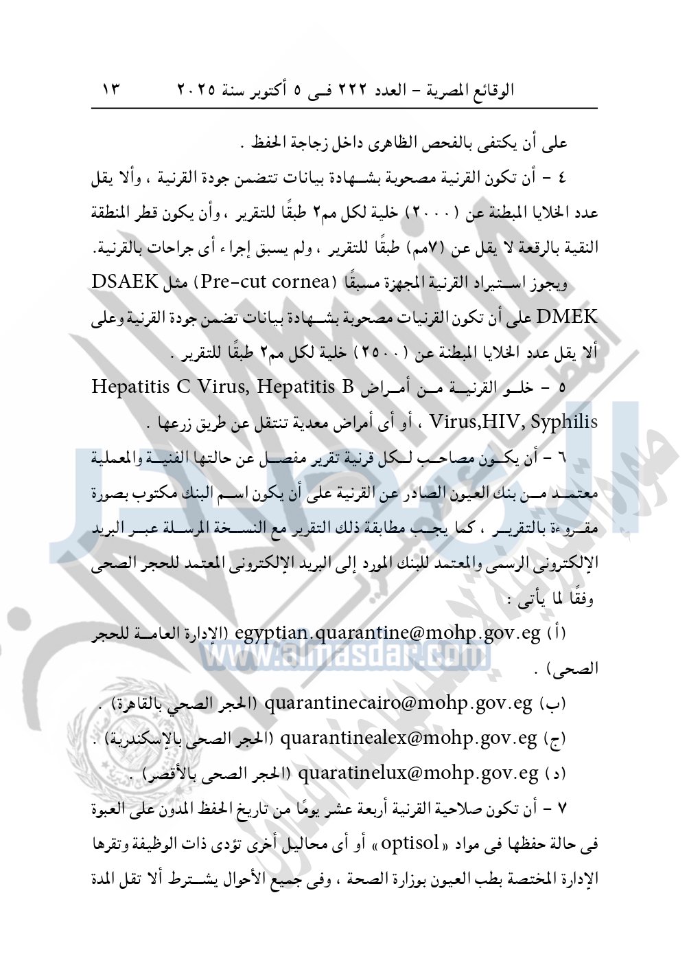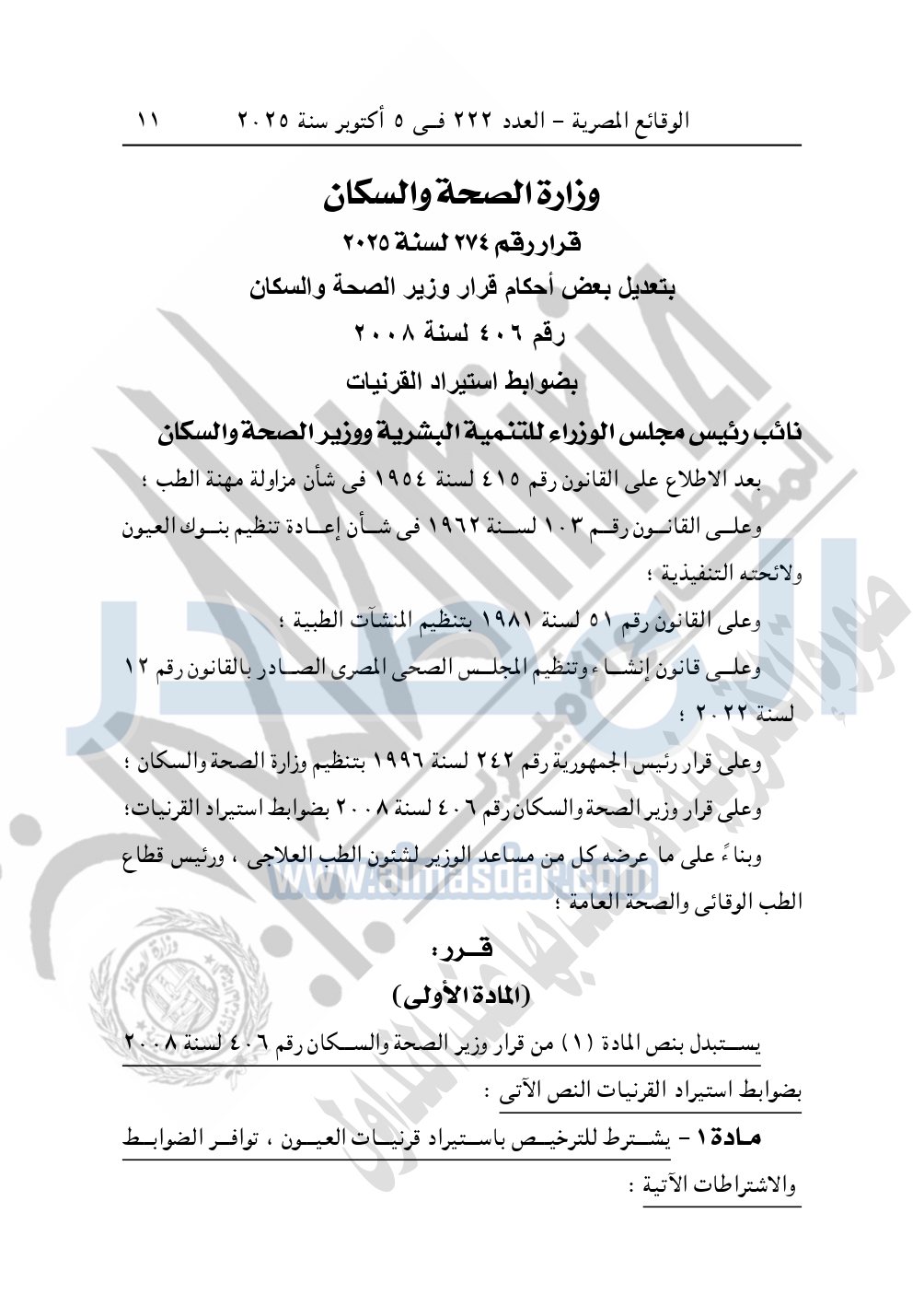 نشرت الوقائع المصرية في العدد 222، الصادر في 5 أكتوبر سنة 2025، قرار وزارة الصحة والسكان، رقم 274 لسنة 2025، بشأن تعديل بعض أحكام قرار وزير الصحة والسكان رقم 406 لسنة 2008 بضوابط استيراد القرنيات.
