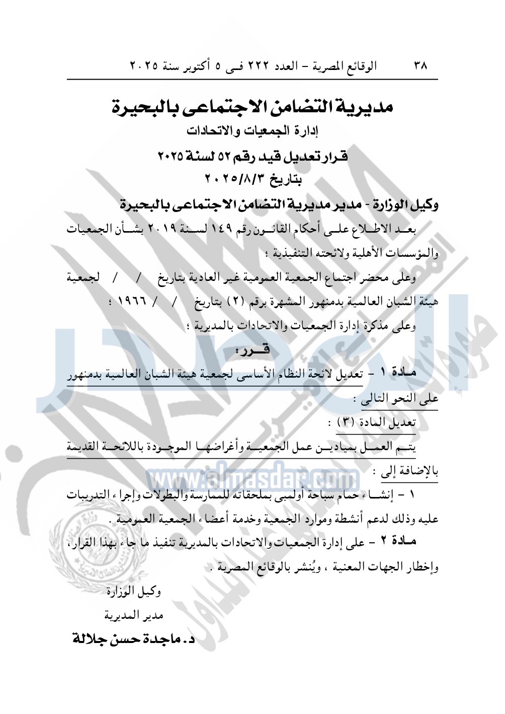 نشرت الوقائع المصرية في العدد 222، الصادر في 5 أكتوبر سنة 2025، قرار مديرية التضامن الاجتماعى بالبحيرة، تعديل قيد رقم 52 لسنة 2025، بتاريخ 3-8-2025، بشأن تعديل جمعية هيئة الشبان العالمية بدمنهور.
