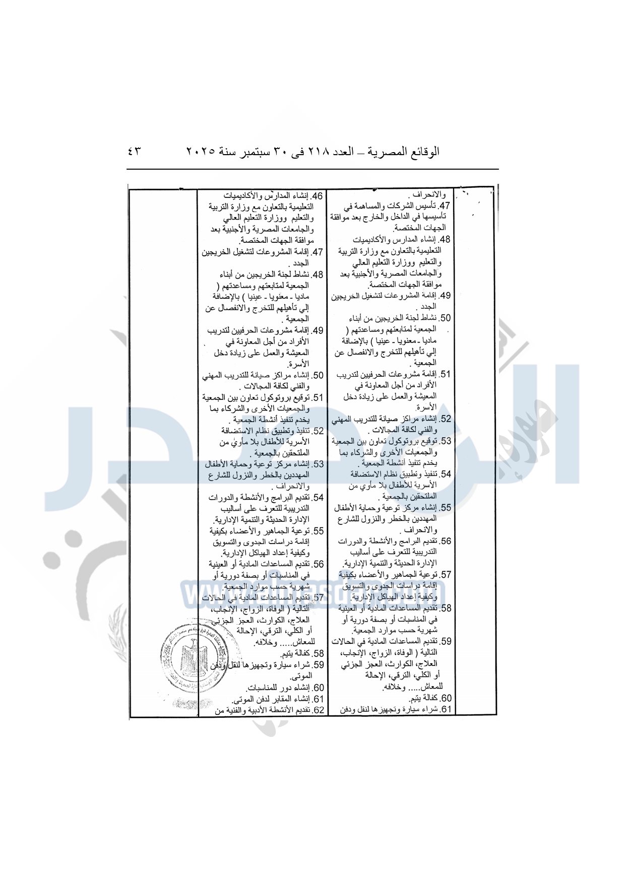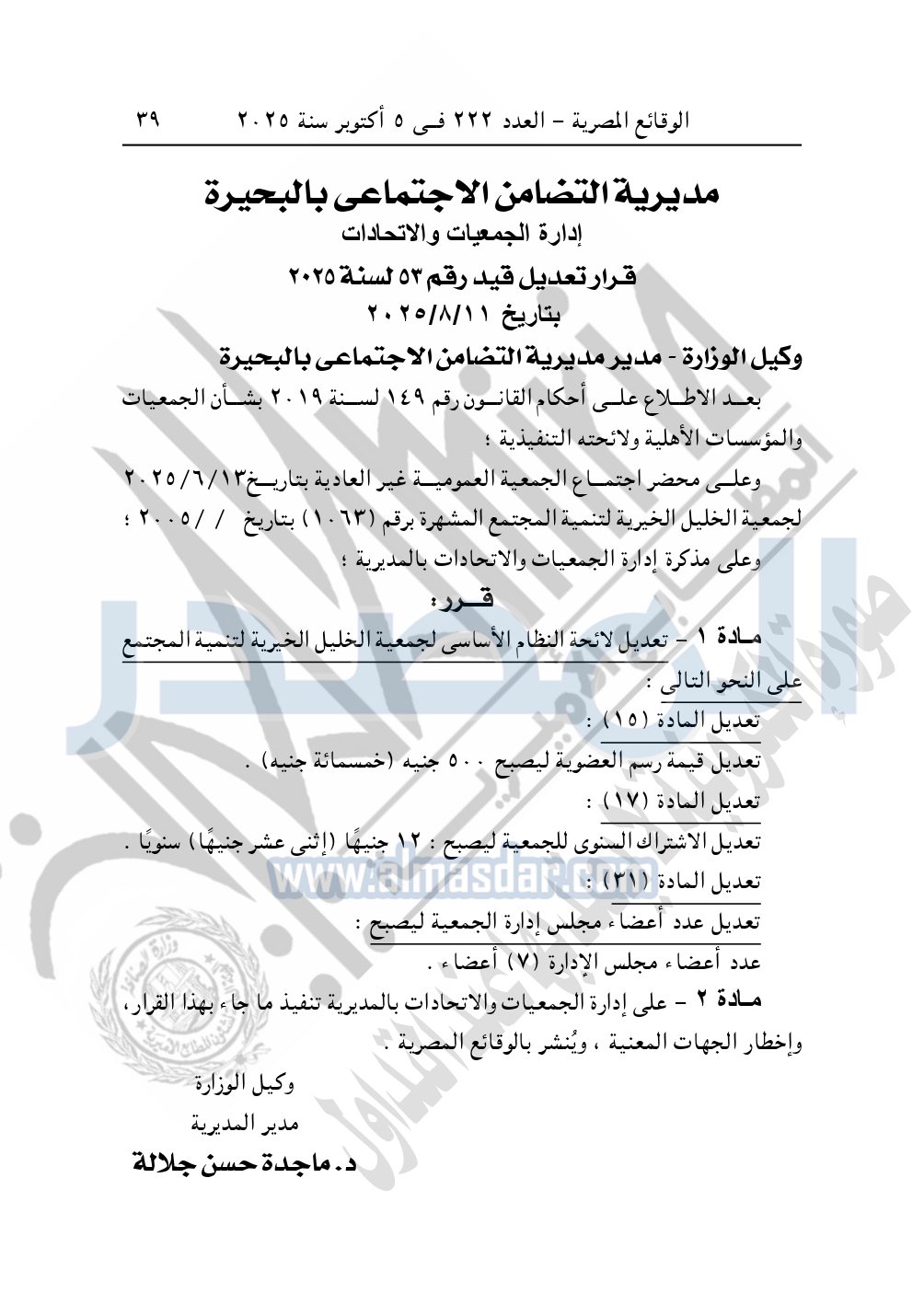 كما نشرت الوقائع المصرية في العدد 222، الصادر في 5 أكتوبر سنة 2025، قرار مديرية التضامن الاجتماعى بالبحيرة، تعديل قيد رقم 53 لسنة 2025، بتاريخ 11-8-2025، بشأن تعديل جمعية الخليل الخيرية لتنمية المجتمع.