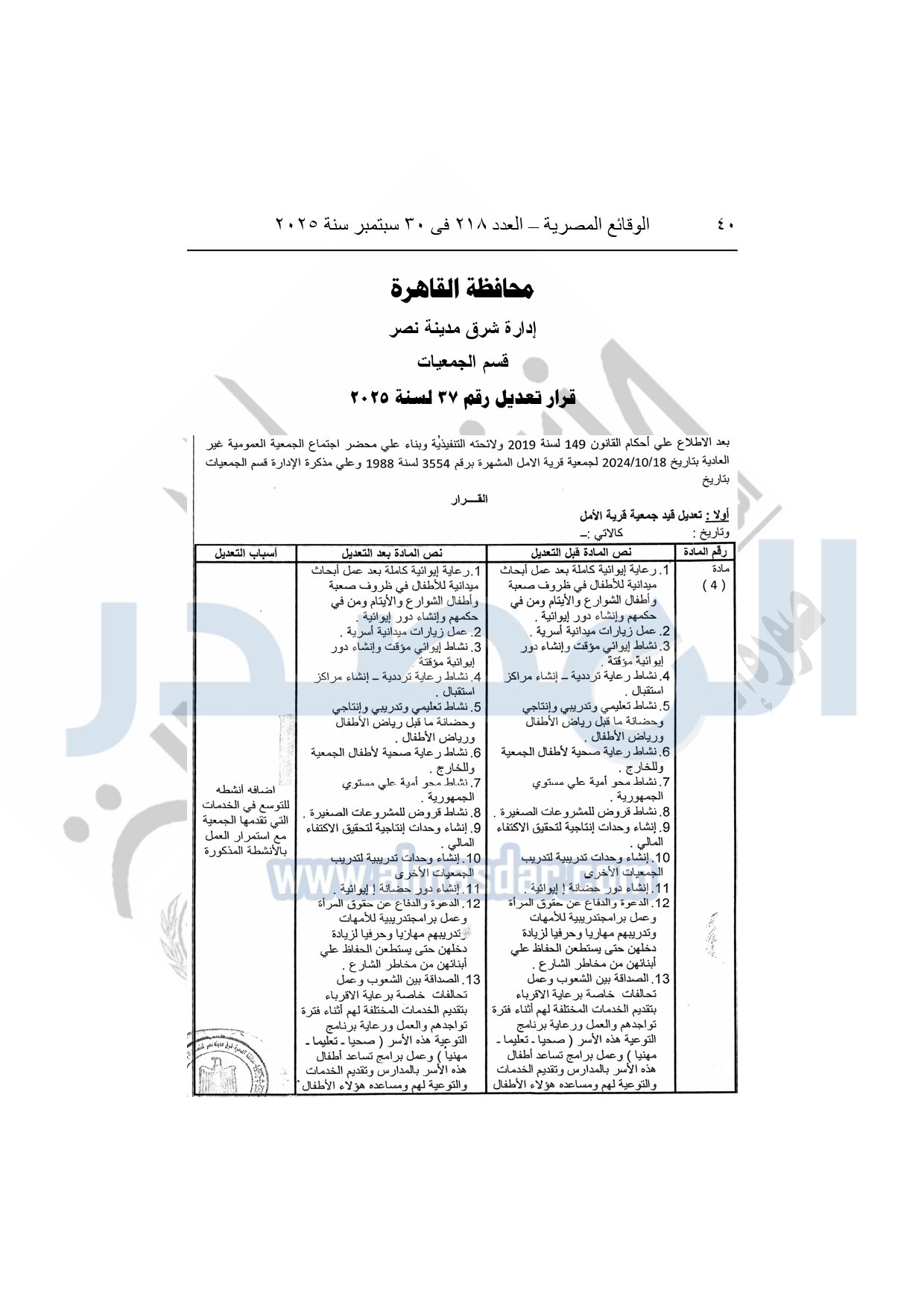وأيضا نشرت الوقائع المصرية في العدد 222، الصادر في 5 أكتوبر سنة 2025، قرار محافظة القاهرة، إدارة شرق مدينة نصر، قسم الجمعيات، قرار تعديل رقم 37 لسنة 2025، بشأن تعديل قيد جمعية قرية الأمل.