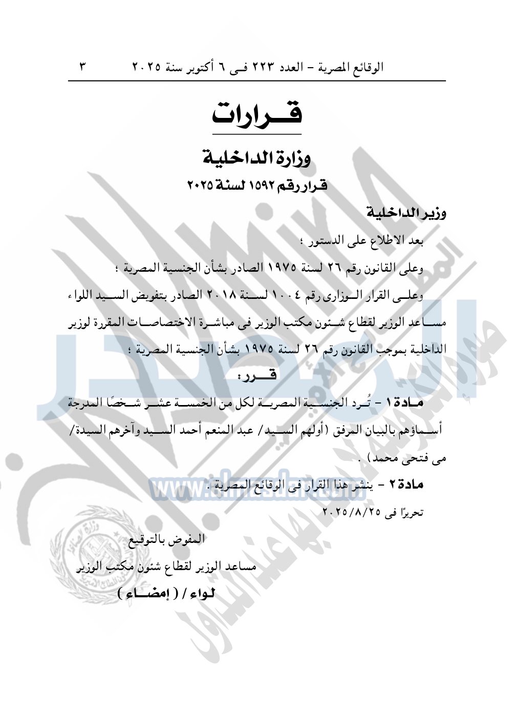 نشرت الوقائع المصرية في العدد 223 الصادر في 6 أكتوبر سنة 2025، قرار وزارة الداخلية، رقم 1592 لسنة 2025، بشأن رد الجنسية المصرية لـ15 شخص.