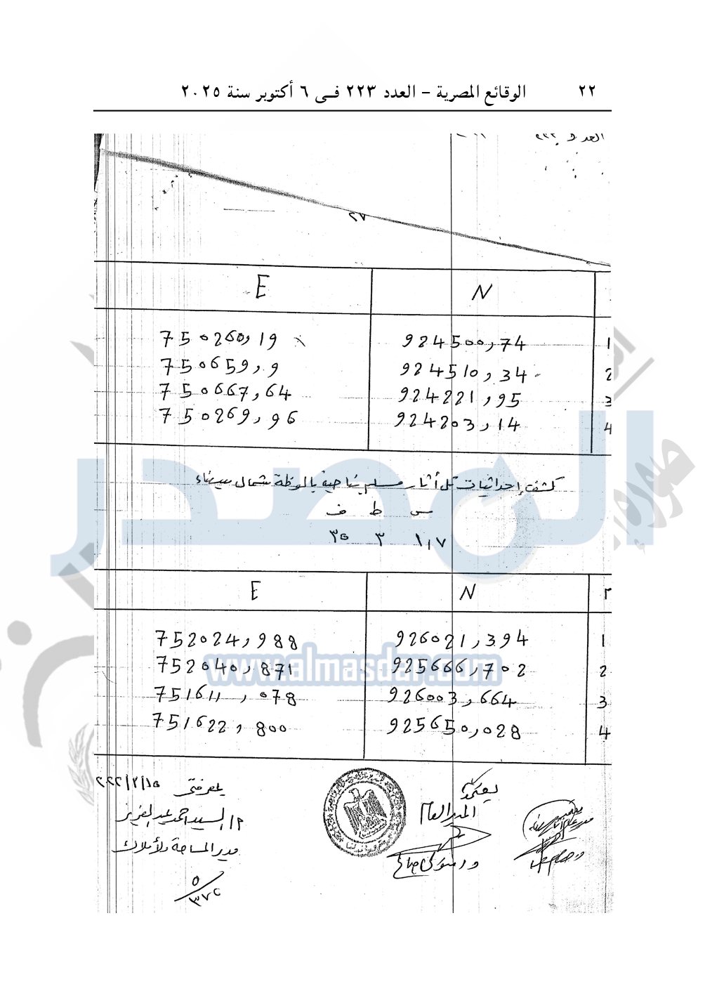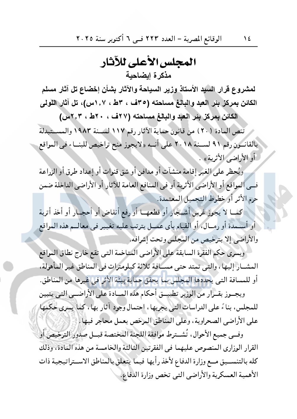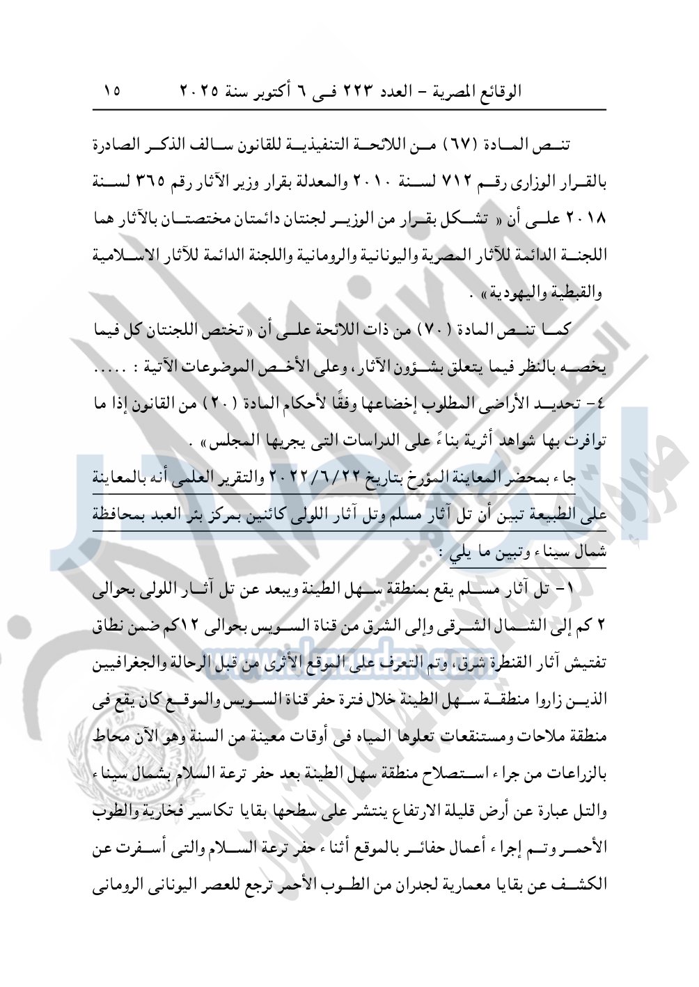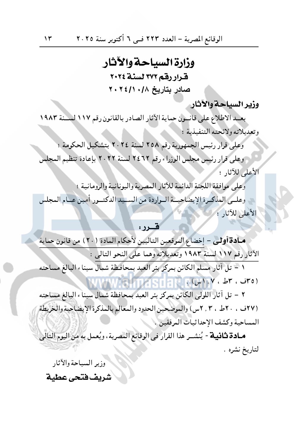 نشرت الوقائع المصرية في العدد 223 الصادر في 6 أكتوبر سنة 2025، قرار وزارة السياحة والآثار، رقم 372 لسنة 2024، صادر بتايخ 8-10-2024، بشأن إخضاع منطقتين لحماية «الآثار» في شمال سيناء.