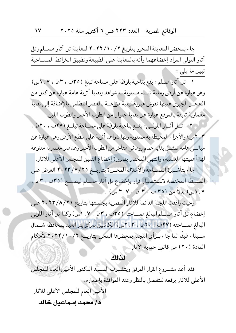1- تل آثار مسلم الكائن بمركز بئر العبد بمحافظة شمال سيناء البالغ مساحته "35ف ، 3ط، 7، 1س".
