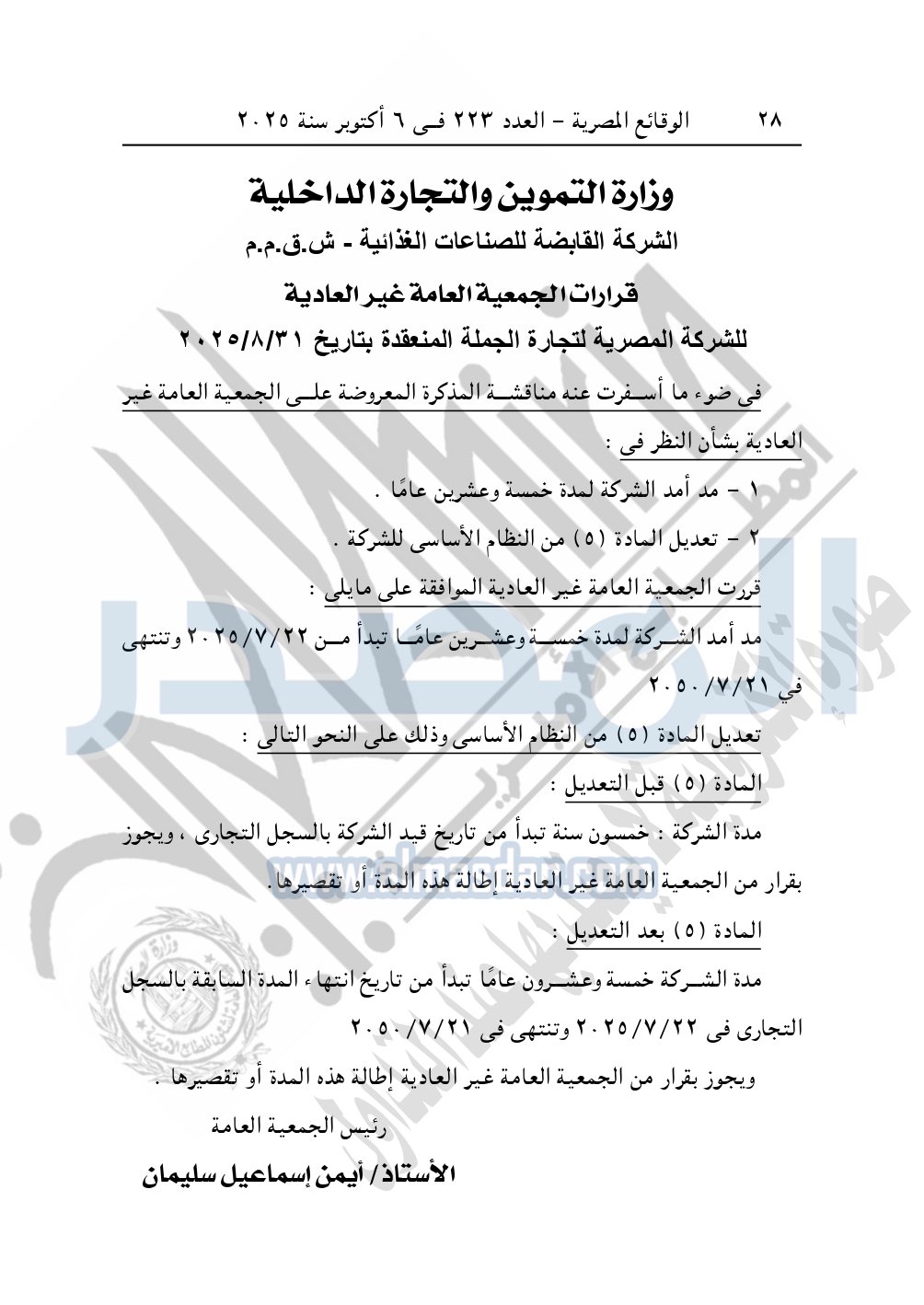 نشرت الوقائع المصرية في العدد 223 الصادر في 6 أكتوبر سنة 2025، قرار وزارة التموين والتجارة الداخلية، الشركة القابضة للصناعات الغذائية - ش.ق.م.م، قرارات الجمعية العامة غير العادية، للشركة المصرية لتجارة الجملة المنعقدة بتاريخ 31-8-2025.