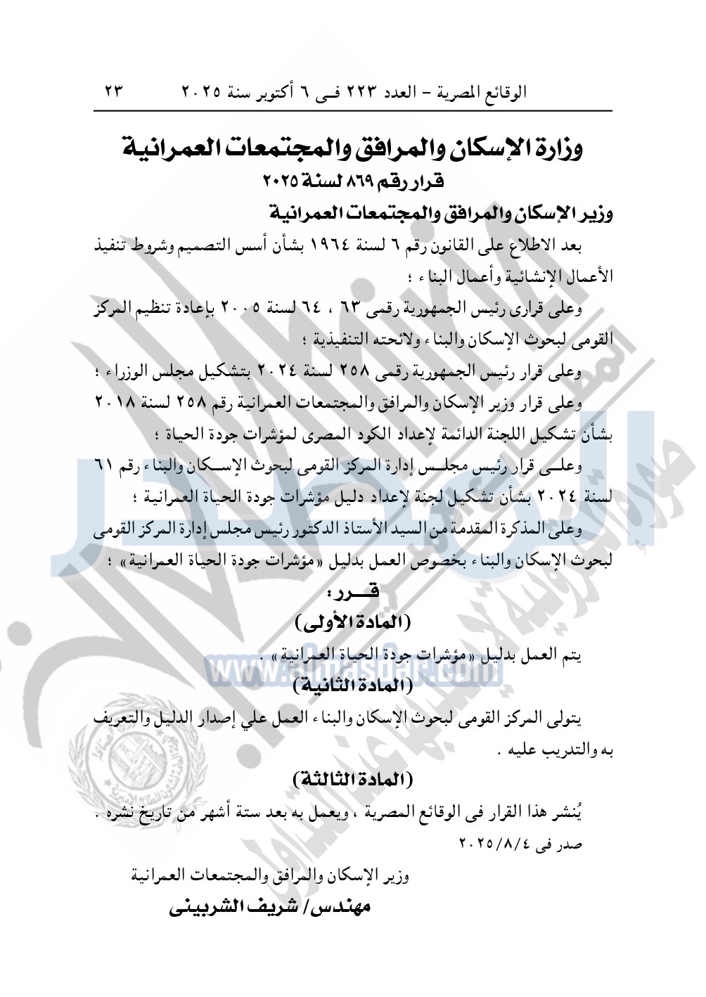 نشرت الوقائع المصرية في العدد 223 الصادر في 6 أكتوبر سنة 2025، قرار وزارة الإسكان والمرافق والمجتمعات العمرانية، رقم 869 لسنة 2025، بشأن العمل بدليل «مؤشرات جودة الحياة العمرانية».