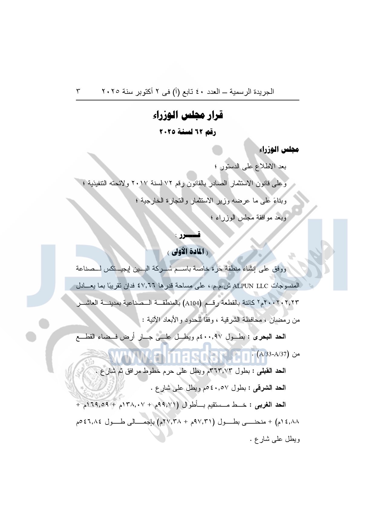 نشرت الجريدة الرسمية، في العدد 40 تابع "أ"، الصادر في 2 أكتوبر سنة 2025، قرار مجلس الوزراء، رقم 62 لسنة 2025، بشأن الموافقة على إنشاء منطقة حرة خاصة باسم شركة البين إيجيتكس لصناعة المنسوجات بمدينة العاشر من رمضان.