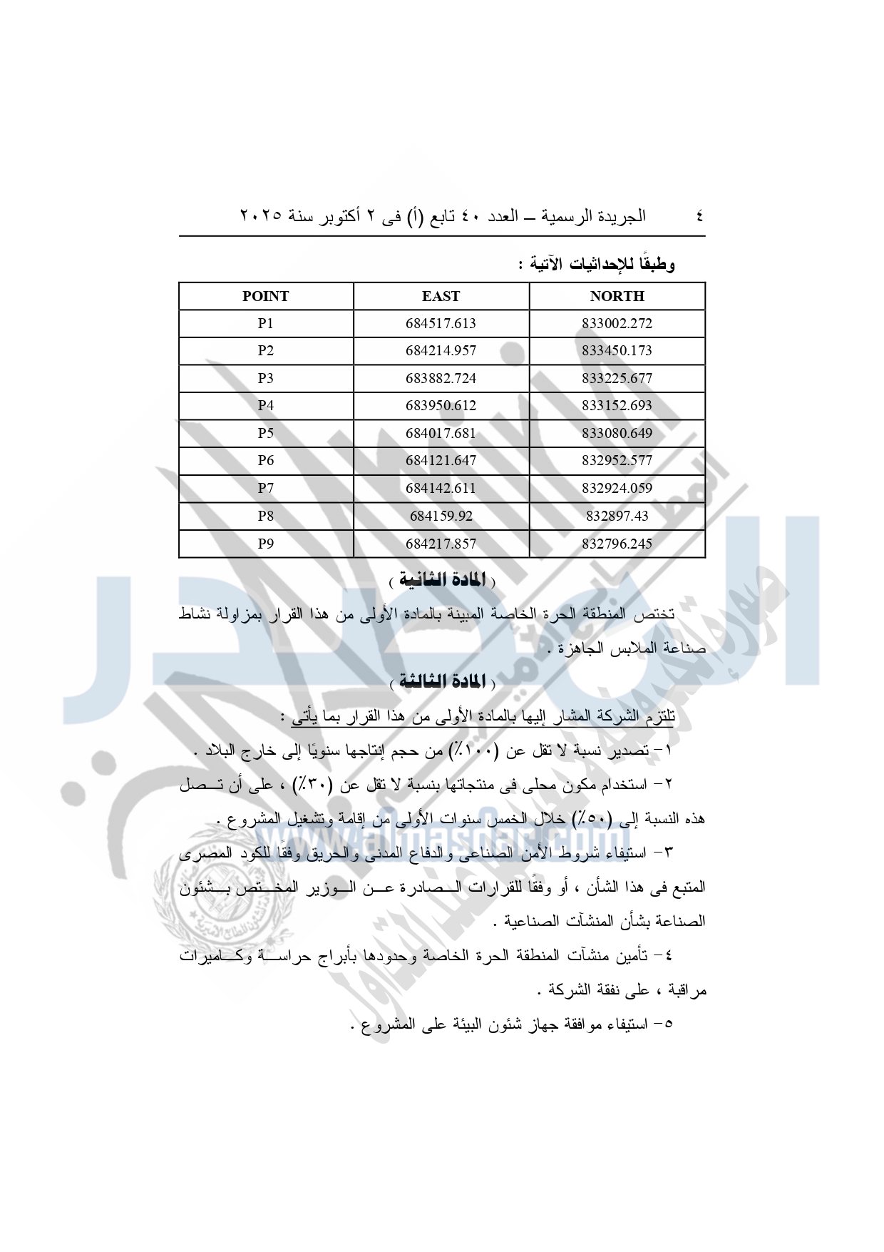 ووفق على إنشاء منطقة حرة خاصة باسم شركة البين إيجيتكس لصناعة المنسوجات ALPUN LLC ش.م.م ، على مساحة قدرها 47.66 فدان تقريبا بما يعادل كائنة بالقطعة رقم "A104" بالمنطقة الصناعية بمدينة العاشر من رمضان، محافظة الشرقية، وفقا للحدود والأبعاد الاتية: