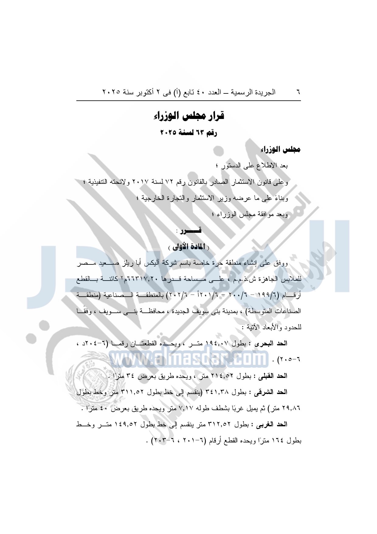 نشرت الجريدة الرسمية، في العدد 40 تابع "أ"، الصادر في 2 أكتوبر سنة 2025، قرار مجلس الوزراء، رقم 63 لسنة 2025، بشأن الموافقة على إنشاء منطقة حرة خاصة باسم شركة آليكس أبا ريلز صعيد مـصـر للملابس الجاهزة بمحافظة بنى سويف.