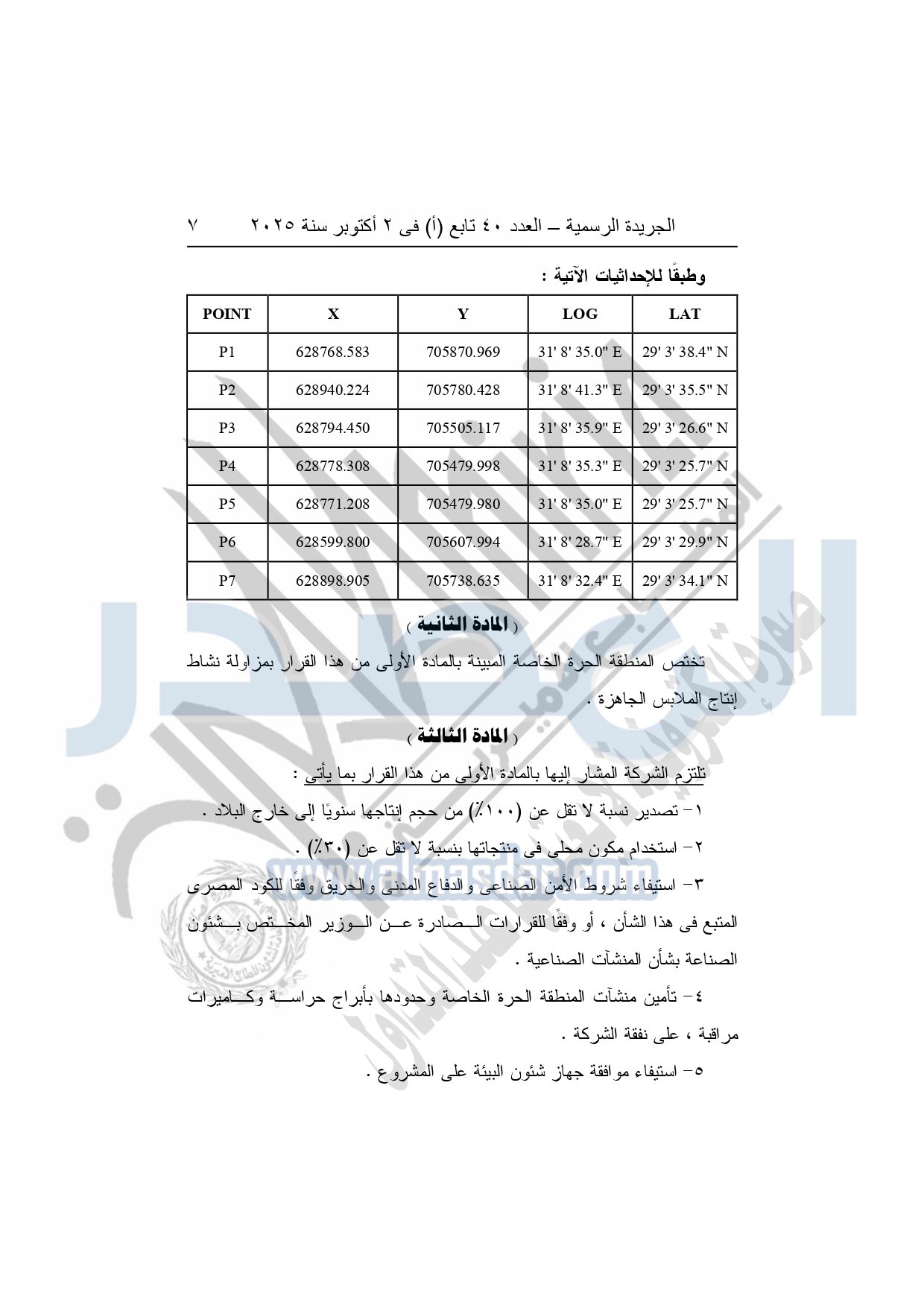 ووفق على إنشاء منطقة حرة خاصة باسم شركة آليكس أبا ريلز صعيد مصر للملابس الجاهزة ش.ذ.م.م، علـى مساحة قدرها 66317.20م2 كائنة بالقطع أرقام "6/ 199 – 6/ 200 – 6/ 201أ / 6/ 202" بالمنطقة الصناعية "منطقة الصناعات المتوسطة"، بمدينة بنى سويف الجديدة، محافظة بنى سويف، وفقـا للحدود والأبعاد الآتية: