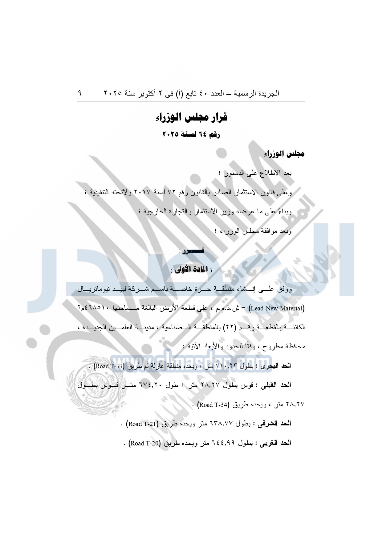 نشرت الجريدة الرسمية، في العدد 40 تابع "أ"، الصادر في 2 أكتوبر سنة 2025، قرار مجلس الوزراء، رقم 64 لسنة 2025، بشأن الموافقة على إنشاء منطقة حرة خاصة باسم شركة لييد نيوماتريال بمحافظة مطروح.