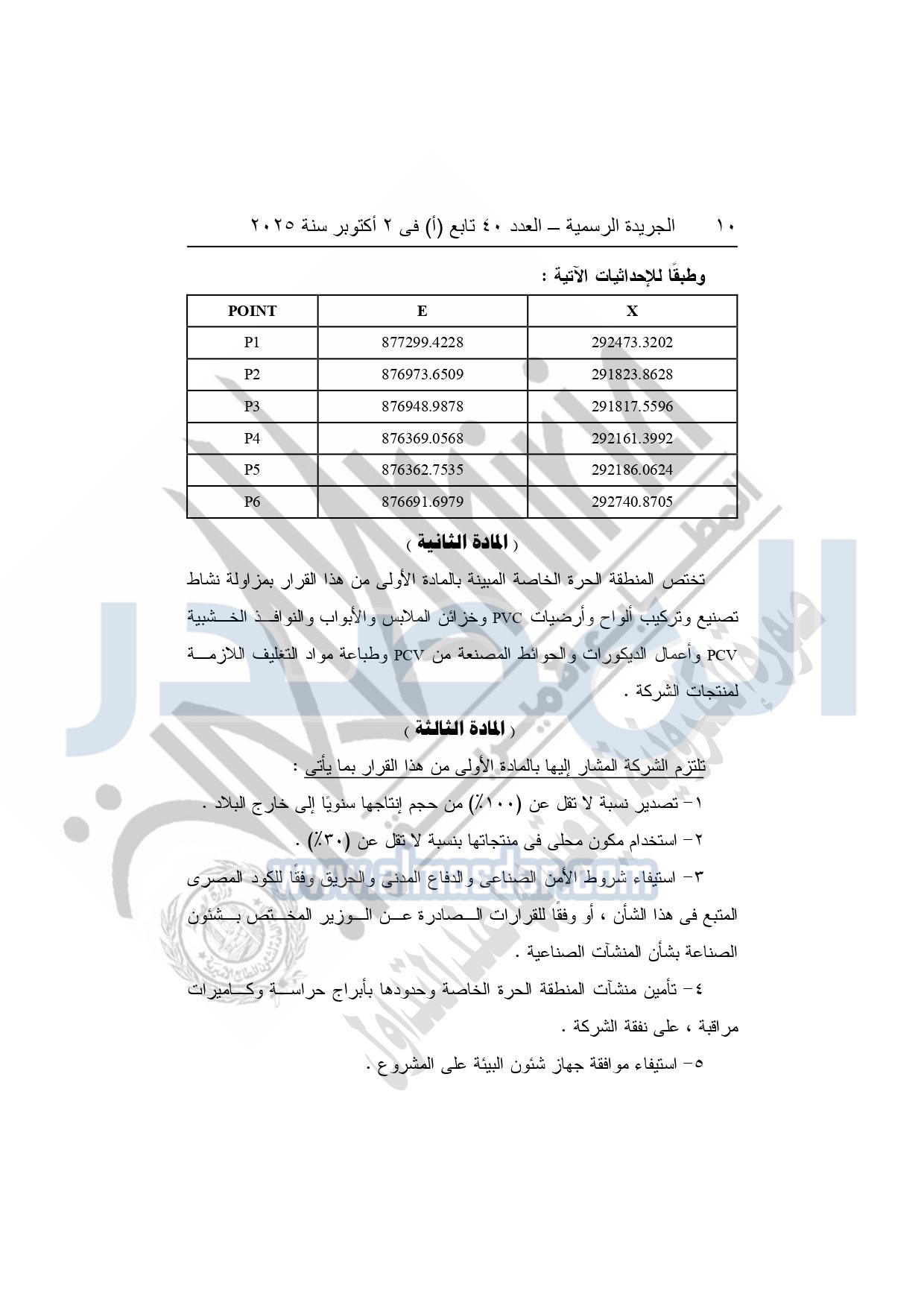 ووفق على إنشاء منطقة حرة خاصة باسم شركة لييد نيوماتريال "Lead New Material" - ش.ذ.م.م، على قطعة الأرض البالغة مساحتها 468510م2 الكائنة بالقطعة رقم "22" بالمنطقة الصناعية، مدينة العلمين الجديدة، محافظة مطروح، وفقا للحدود والأبعاد الآتية: