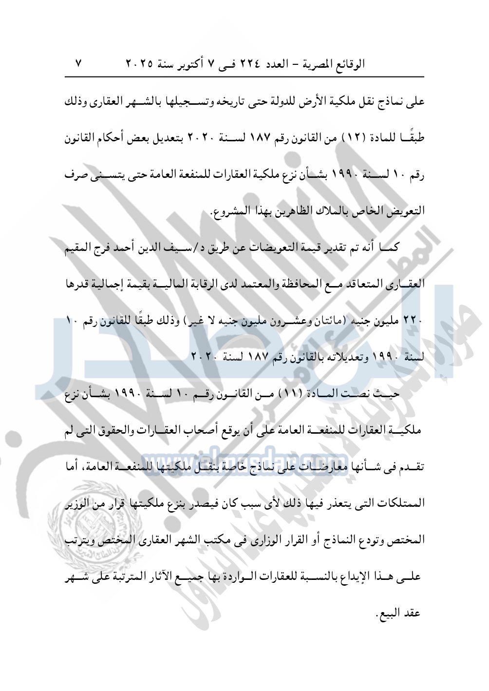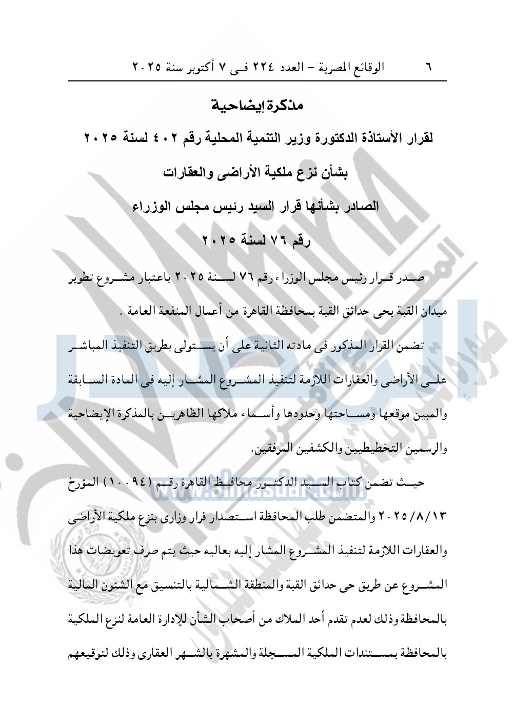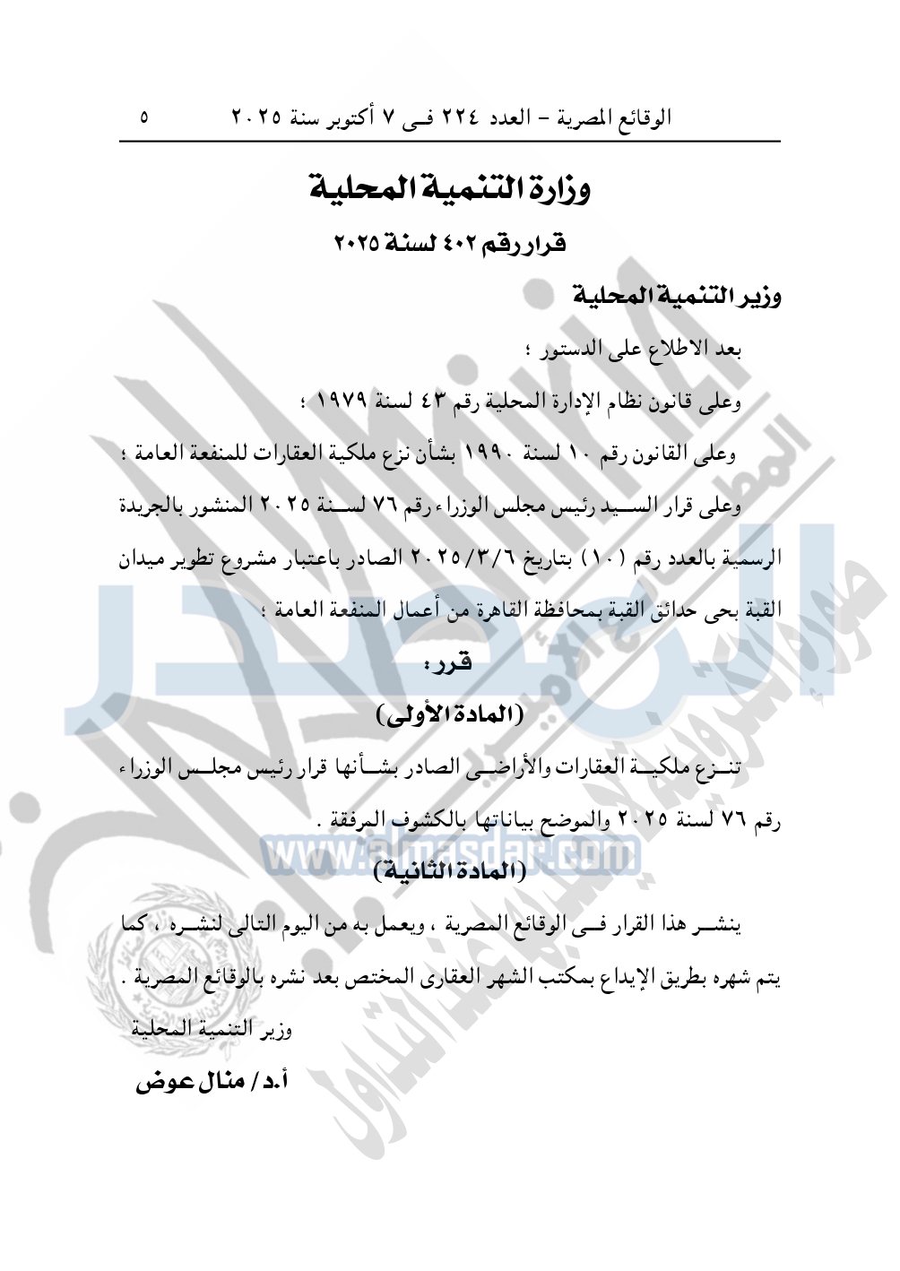 نشرت الوقائع المصرية في العدد 224 الصادر في 7 أكتوبر سنة 2025، قرار وزارة التنمية المحلية، رقم 402 لسنة 2025، بشأن نزع ملكية بعض العقارات والأراضي لإقامة مشروع تطوير میدان القبة بحى حدائق القبة بمحافظة القاهرة.