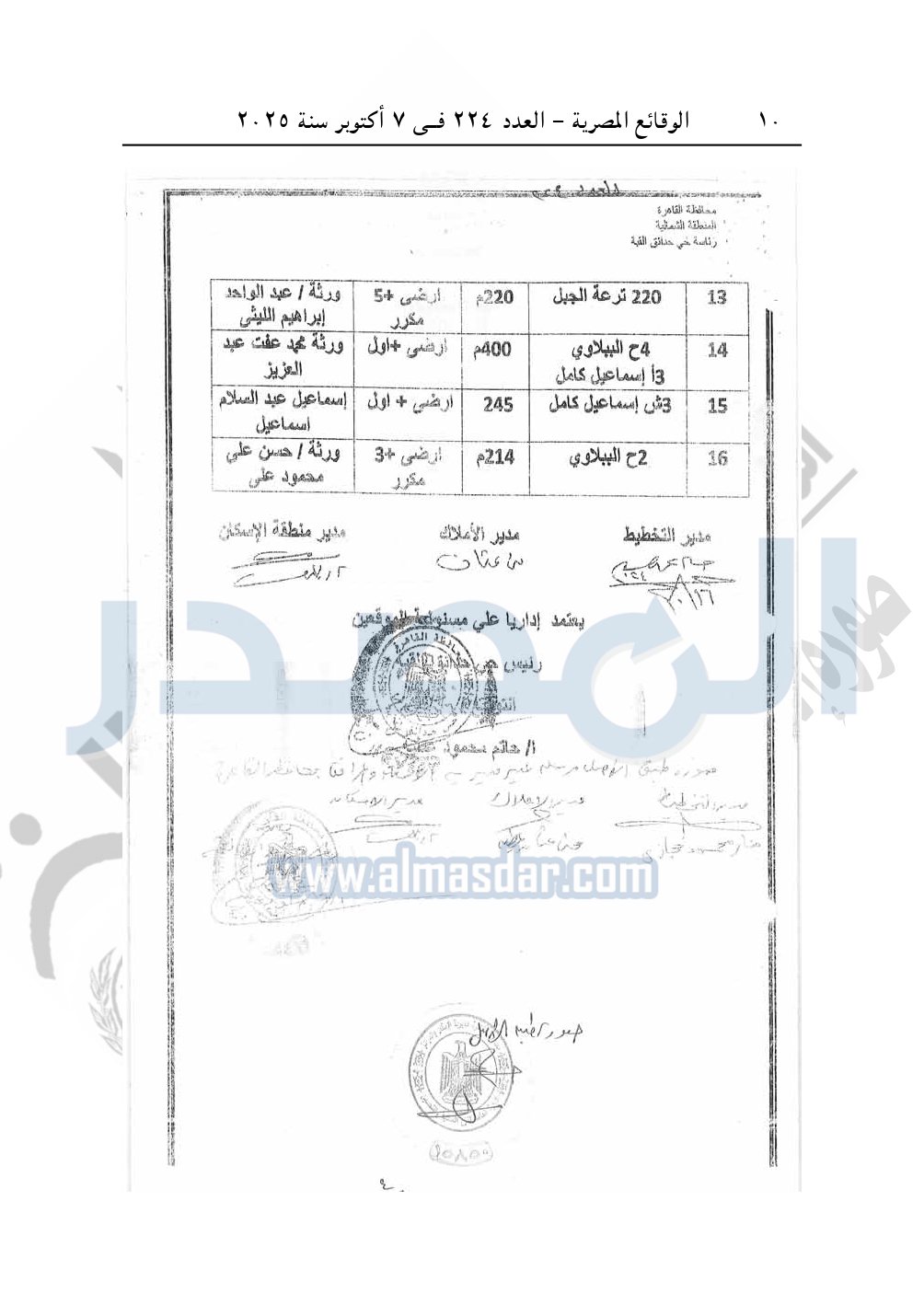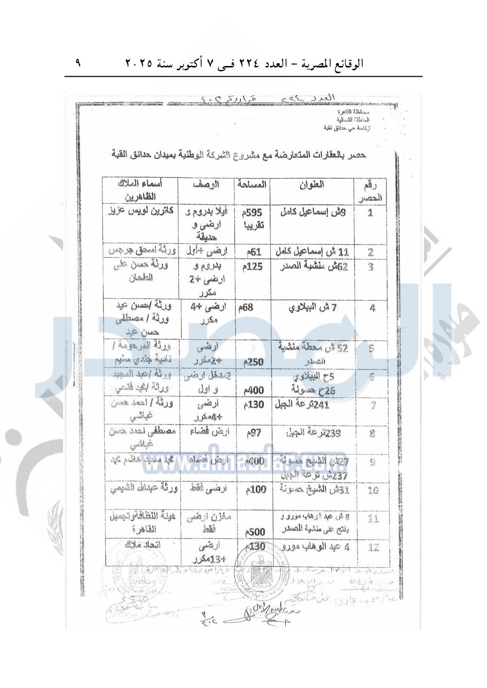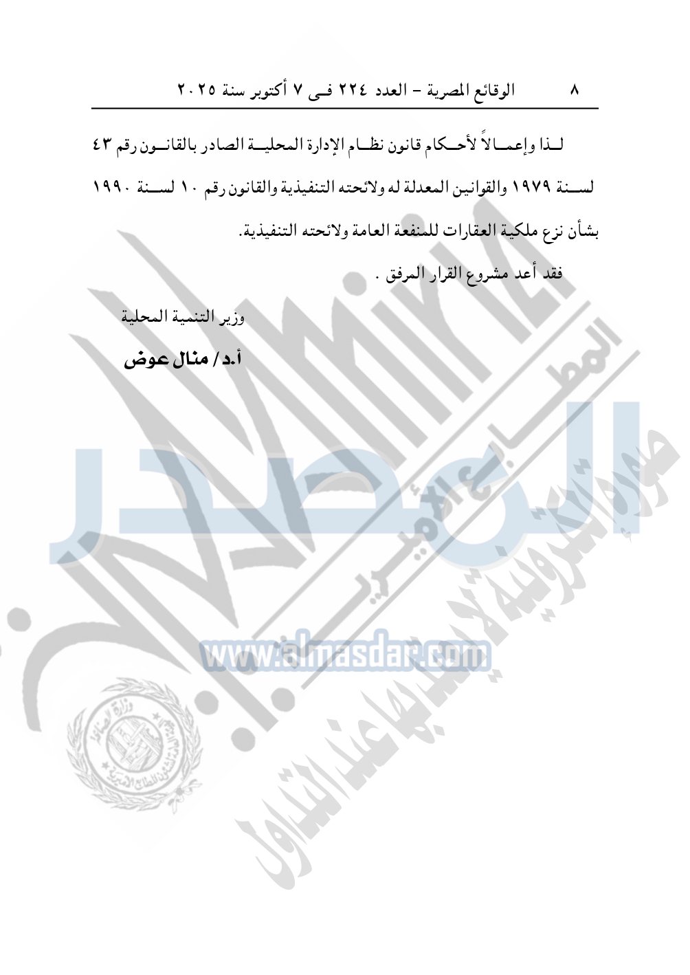 وأوضحت الوقائع أن القرار جاء بعد الاطلاع على الدستور؛ وعلى قانون نظام الإدارة المحلية رقم 43 لسنة 1979؛ وعلى القانون رقم 10 لسنة 1990 بشأن نزع ملكية العقارات للمنفعة العامة؛ وعلى قرار رئيس مجلس الوزراء رقم 76 لسنة 2025 المنشور بالجريدة الرسمية بالعدد رقم "10" بتاريخ 6-3-2025 الصادر باعتبار مشروع تطوير میدان القبة بحى حدائق القبة بمحافظة القاهرة من أعمال المنفعة العامة.