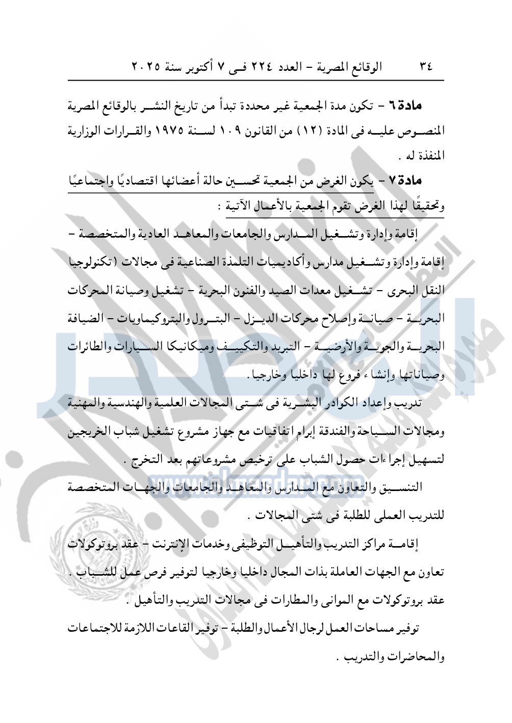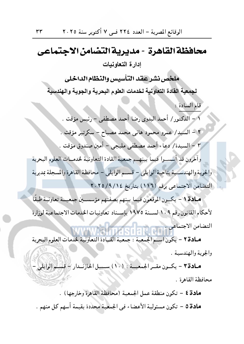 نشرت الوقائع المصرية في العدد 224، بتاريخ 7 أكتوبر 2025، قرار مديرية التضامن الاجتماعي بالقاهرة، إدارة التعاونيات، بشأن ملخص نشر عقد التأسيس والنظام الداخلى لجمعية القادة التعاونية لخدمات العلوم البحرية والجوية والهندسية.