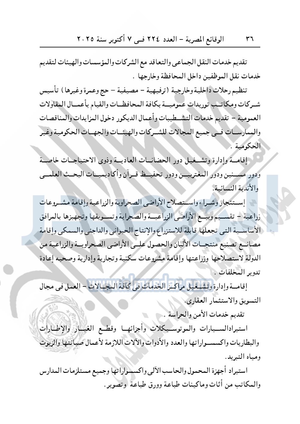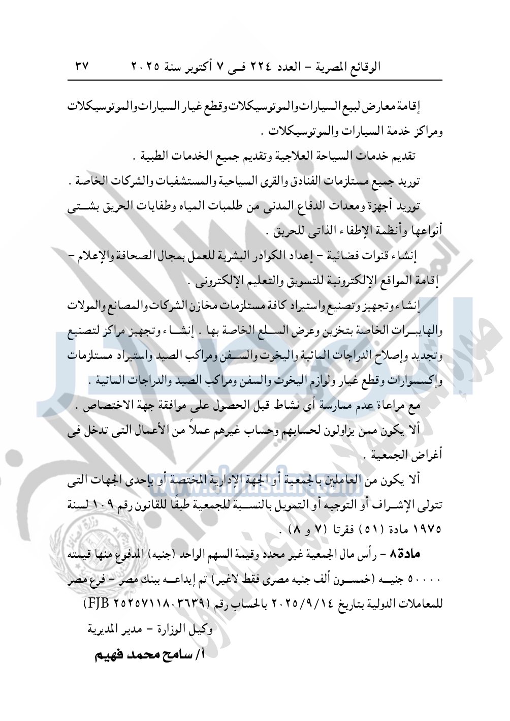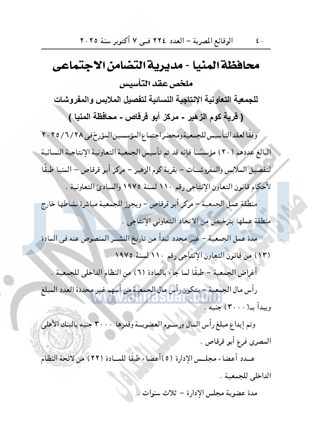 كما نشرت الوقائع المصرية في العدد 224، بتاريخ 7 أكتوبر 2025، قرار مديرية التضامن الاجتماعي بالمنيا، بشأن ملخص عقد التأسيس للجمعية التعاونية الإنتاجية النسائية لتفصيل الملابس والمفروشات "قرية كوم الزهير - مركز أبو قرقاص - محافظة المنيا".