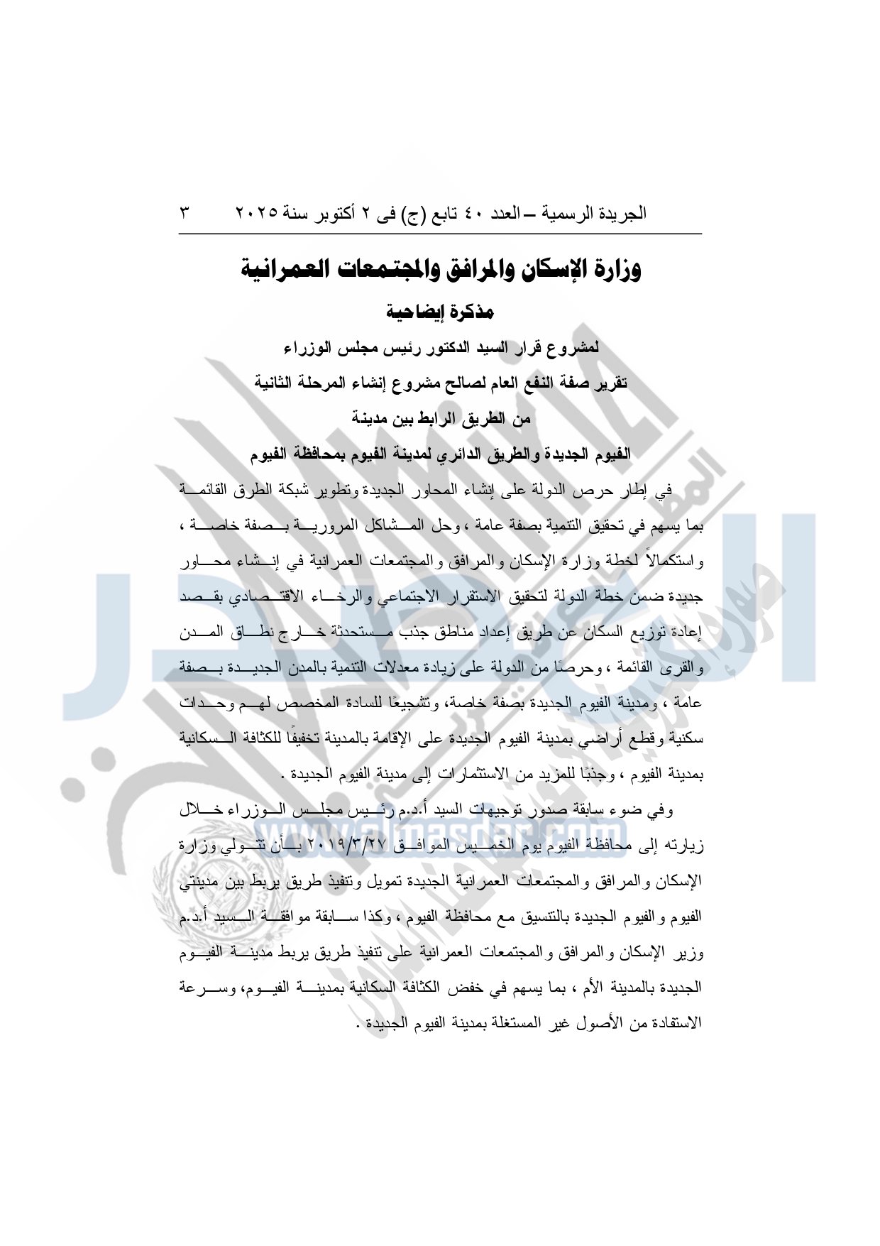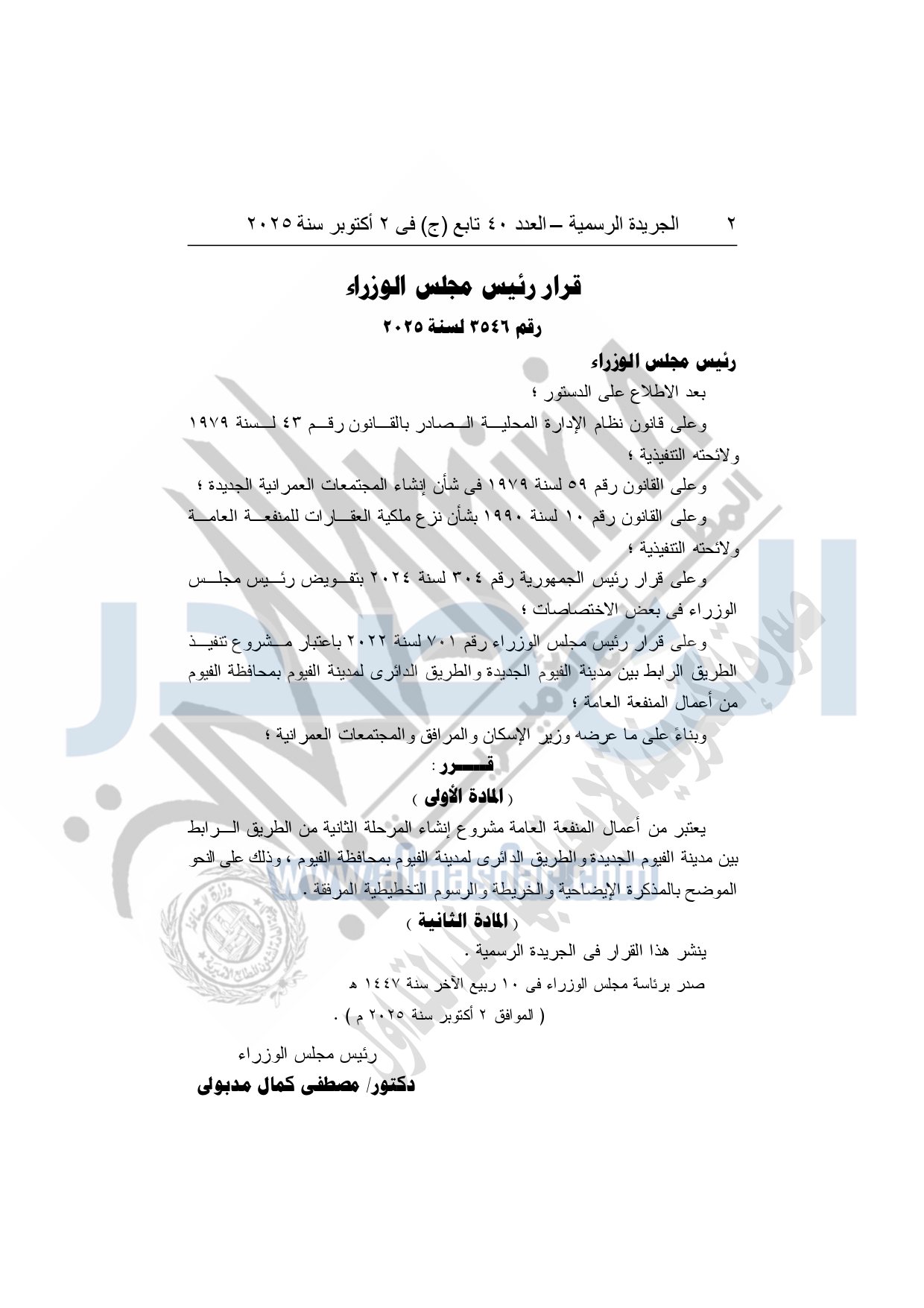 يعتبر من أعمال المنفعة العامة مشروع إنشاء المرحلة الثانية من الطريق الرابط بين مدينة الفيوم الجديدة والطريق الدائرى لمدينة الفيوم بمحافظة الفيوم، وذلك على النحو الموضح بالمذكرة الإيضاحية والخريطة والرسوم التخطيطية المرفقة.