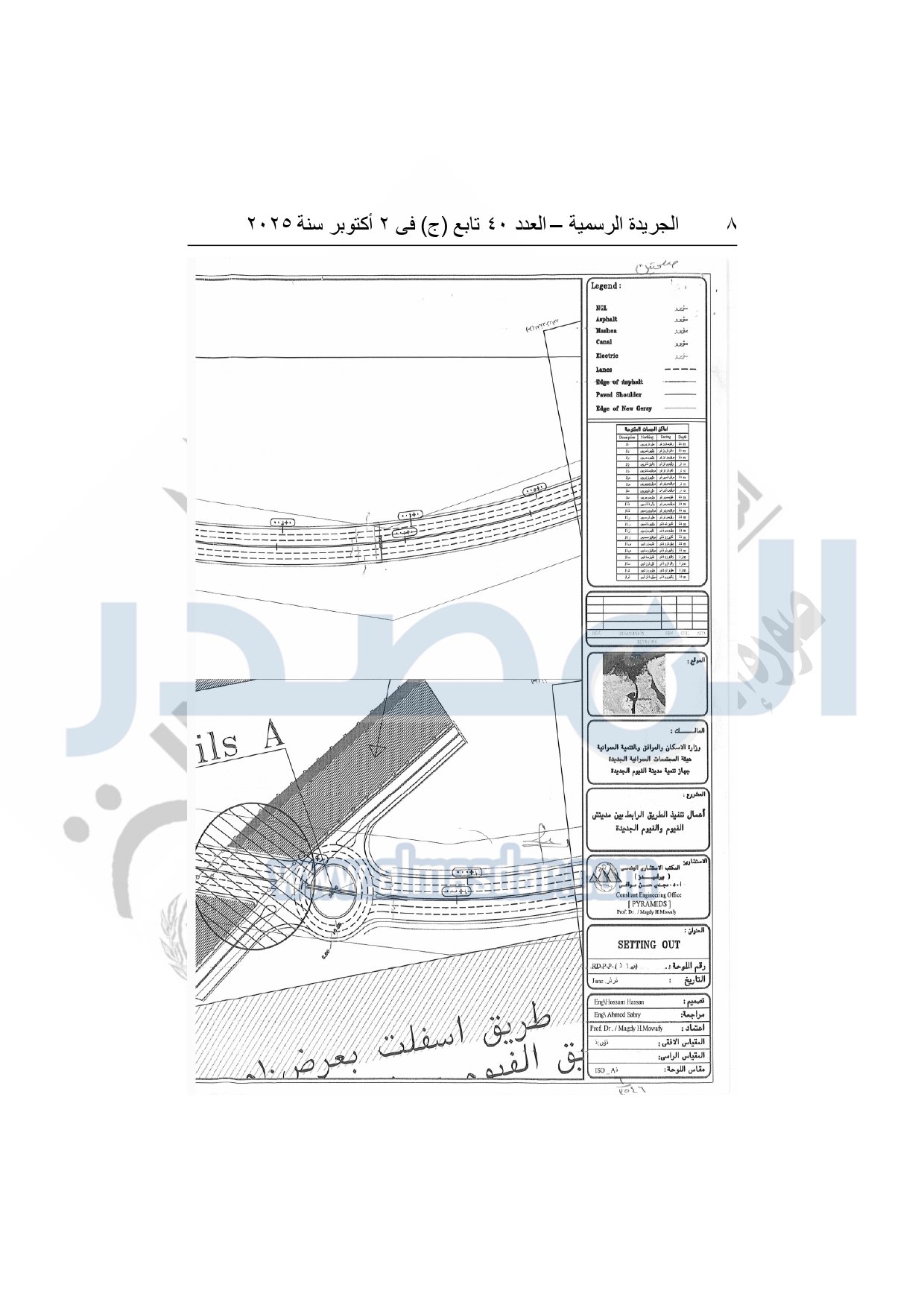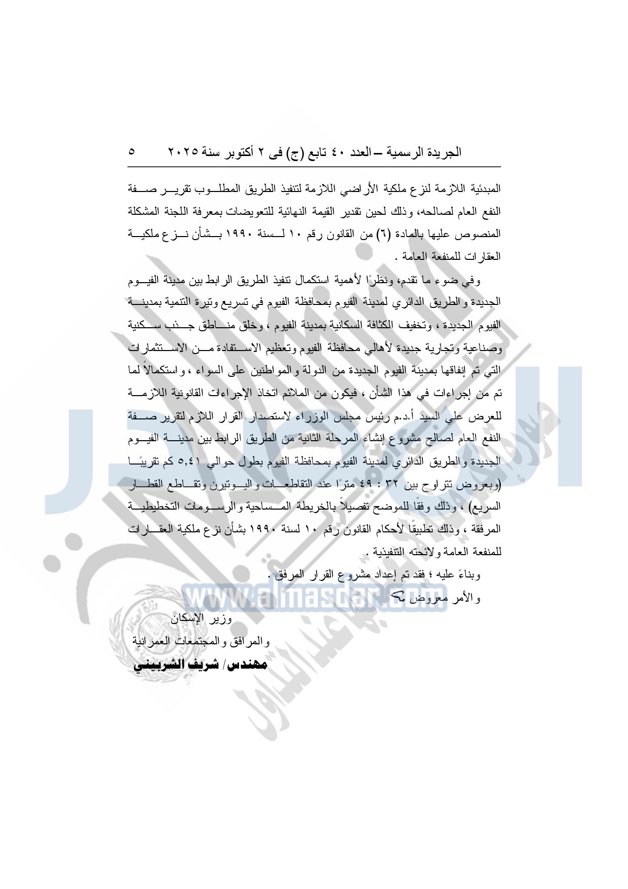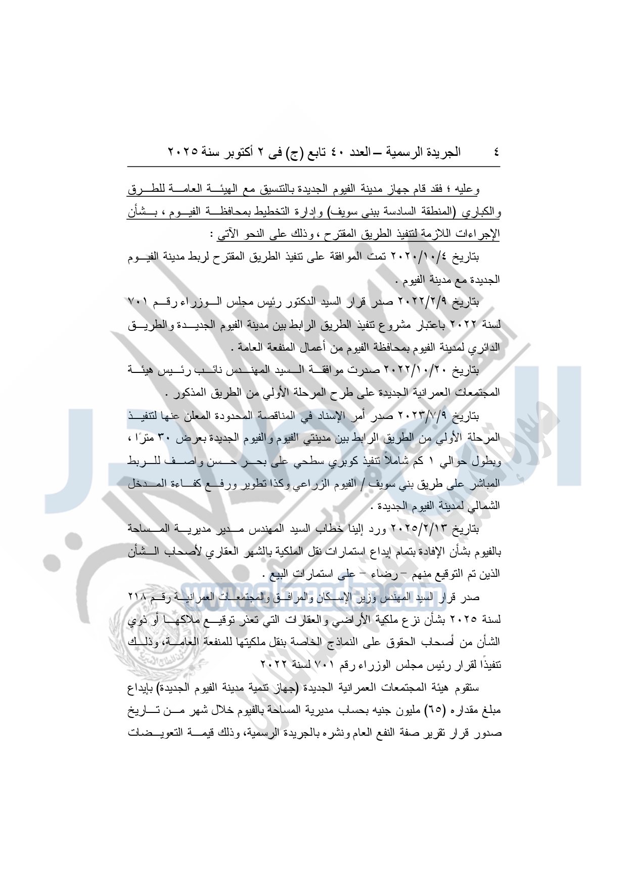 نشرت الجريدة الرسمية في العدد 40 تابع "ج"، بتاريخ 2 أكتوبر 2025، قرار رئيس مجلس الوزراء، رقم 3546 لسنة 2025، بشأن نزع ملكية بعض الأراضي لإقامة مشروع إنشاء المرحلة الثانية من الطريق الرابط بين مدينة الفيوم الجديدة والطريق الدائرى لمدينة الفيوم بمحافظة الفيوم.