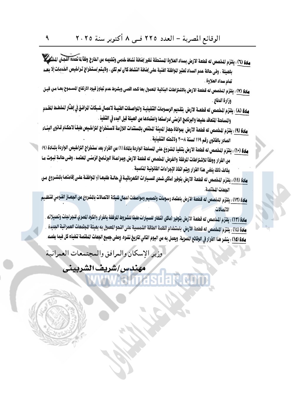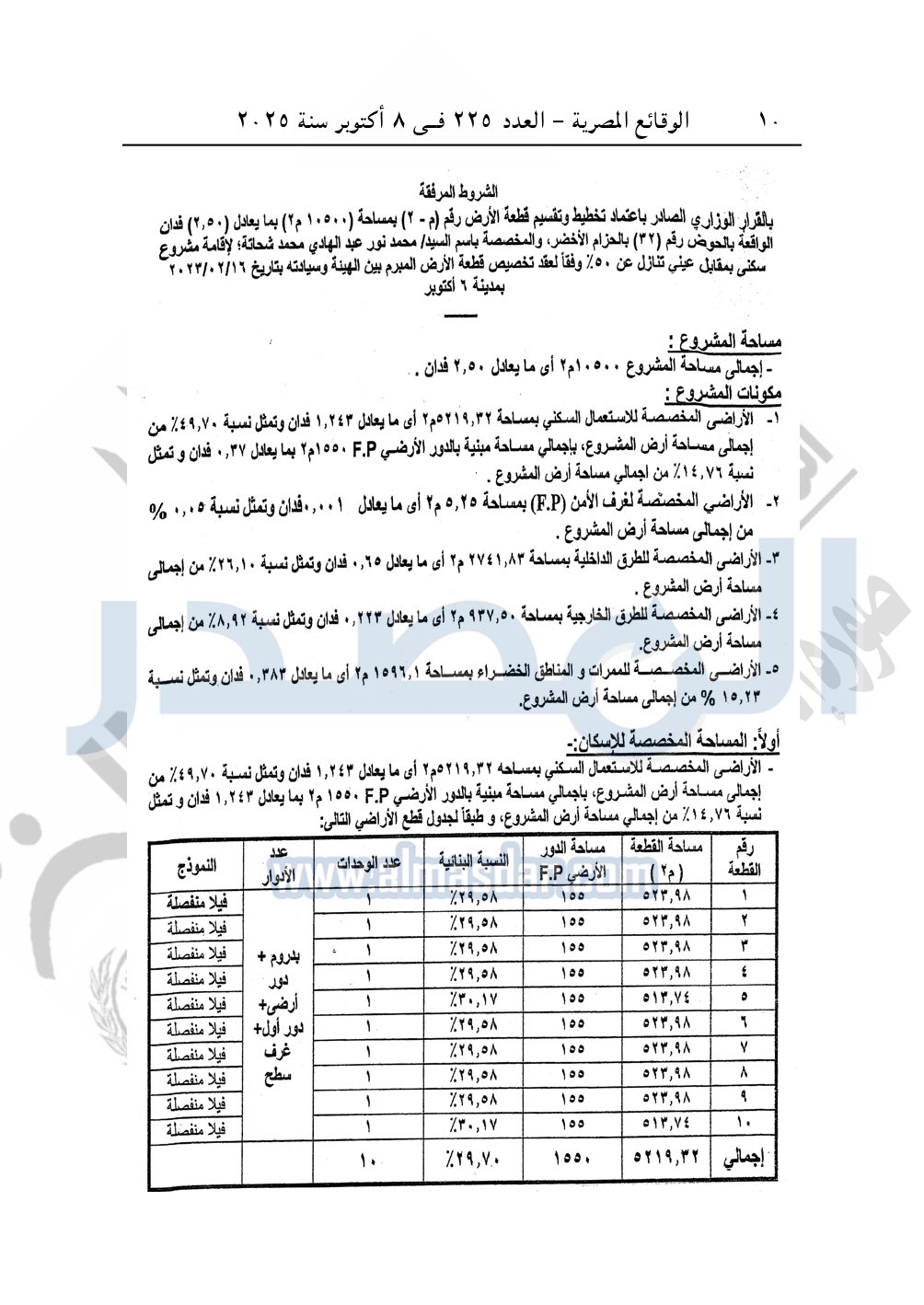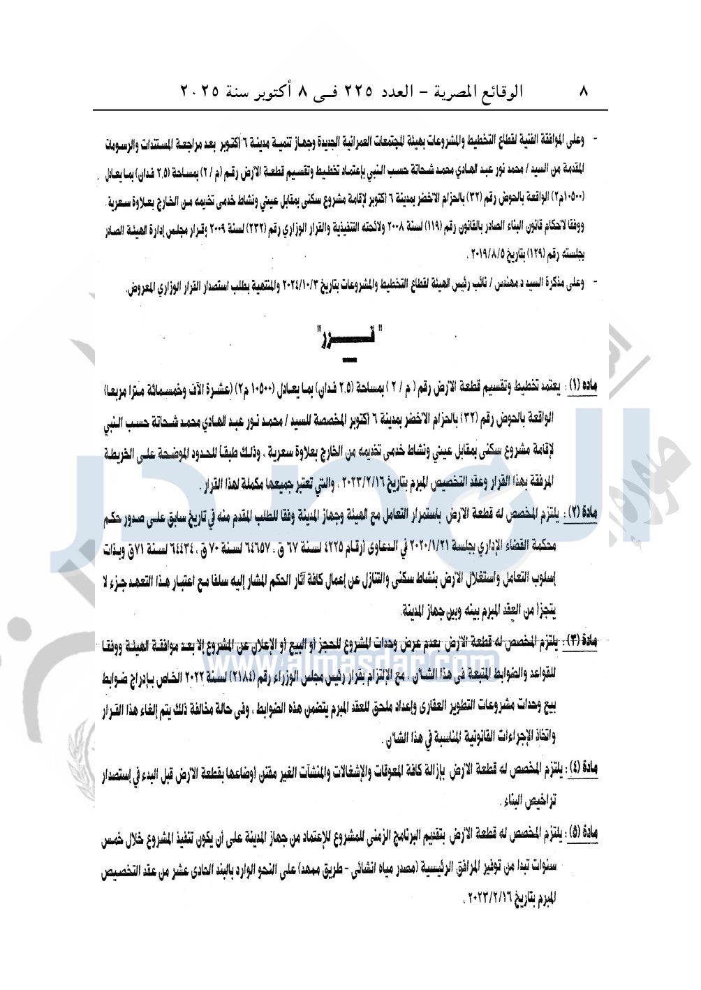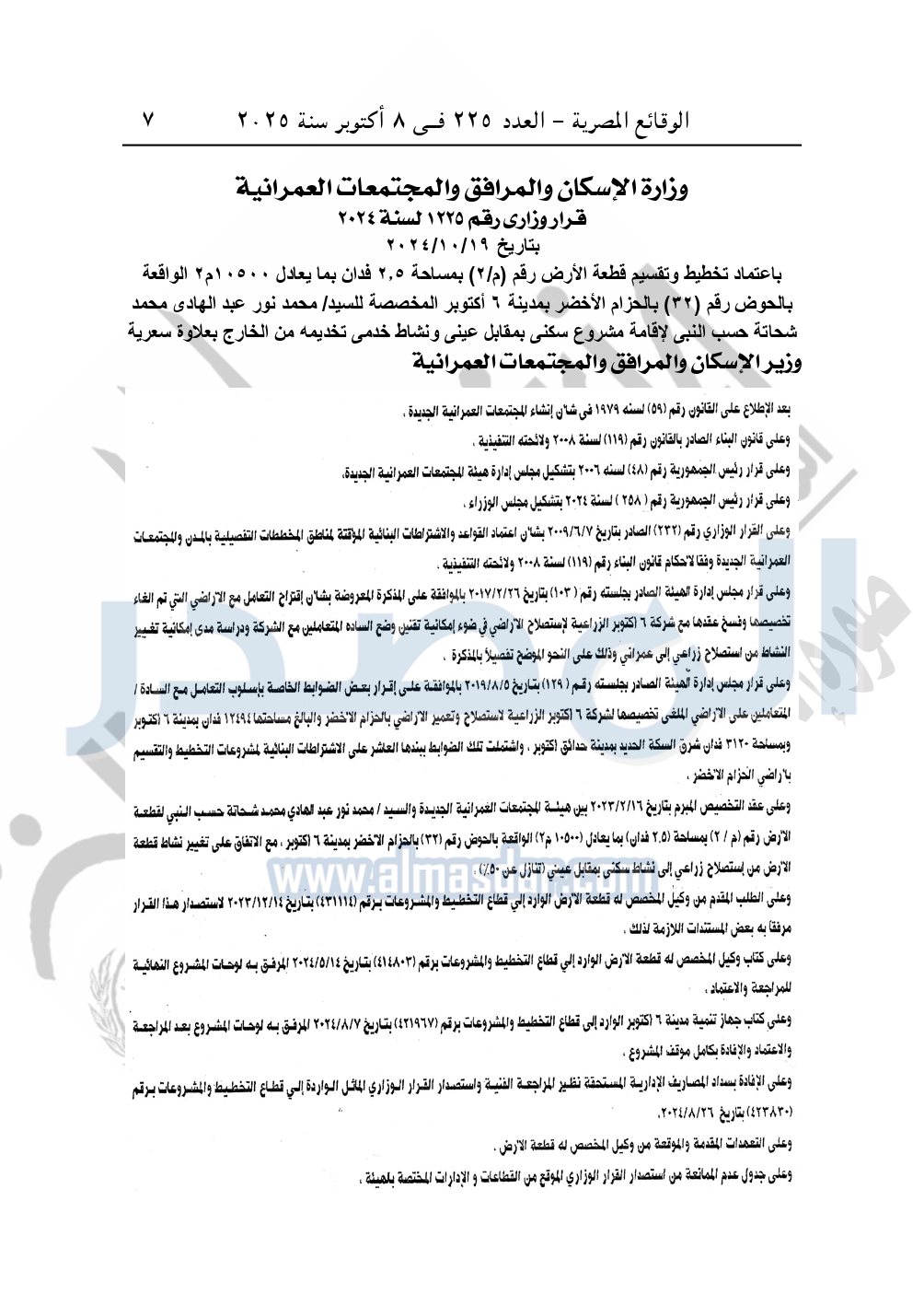 نشرت الوقائع المصرية في العدد 225، الصادر بتاريخ 8 أكتوبر 2025، قرار وزارة الإسكان والمرافق والمجتمعات العمرانية، رقم 1225 لسنة 2024، بتاريخ 19-10-2024، بشأن إعتماد تخطيط وتقسيم قطعة الأرض رقم "م/ 2" بمساحة "2.5 فدان" بما يعادل "10500م2" الواقعة بالحوض رقم "32" بالحزام الأخضر بمدينة 6 أكتوبر المخصصة لـ محمد نور عبد الهادي محمد شحاتة حسب النبي لإقامة مشروع سكنى بمقابل. ونشاط خدمى تخديمه من الخارج بعلاوة سعرية.