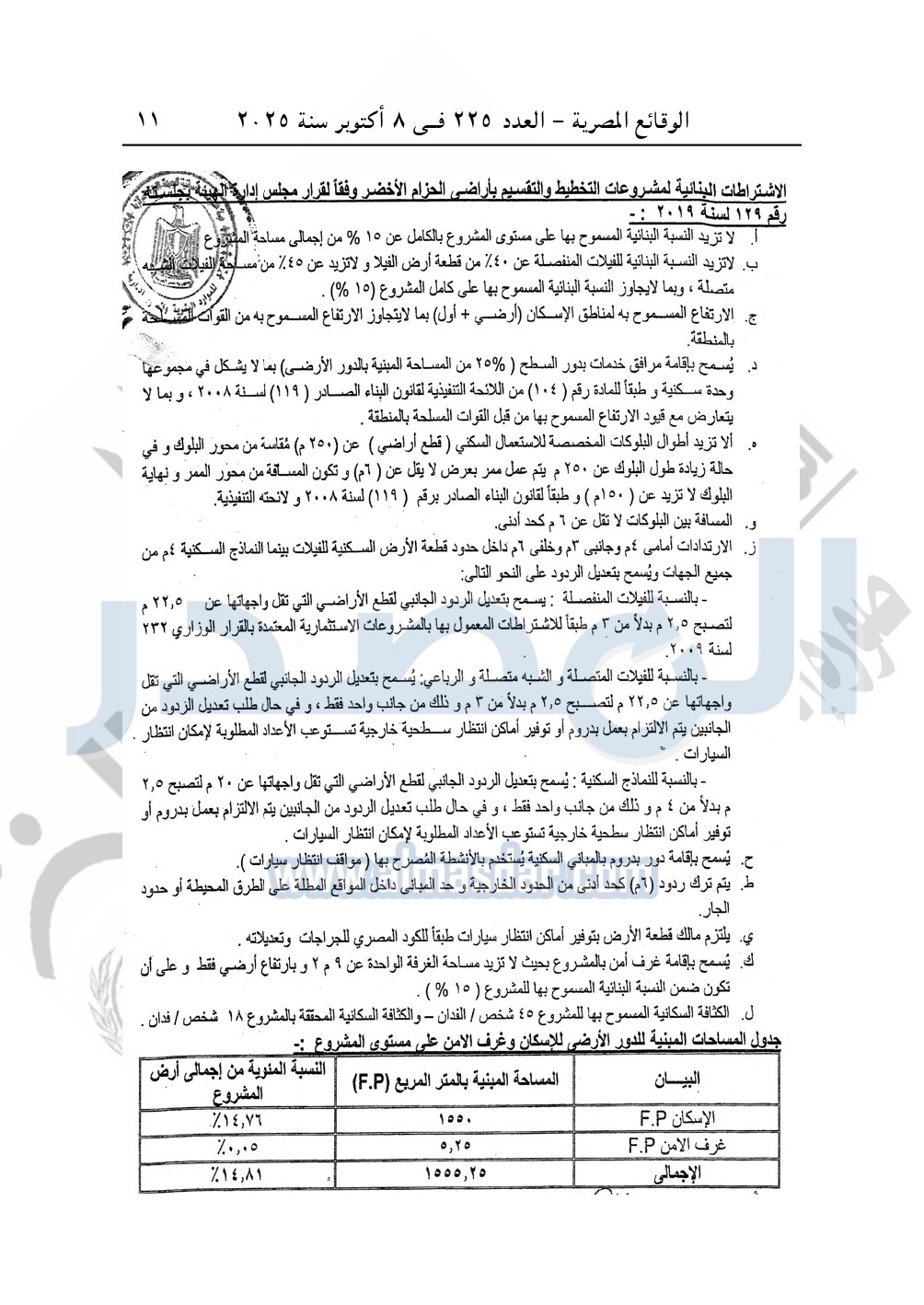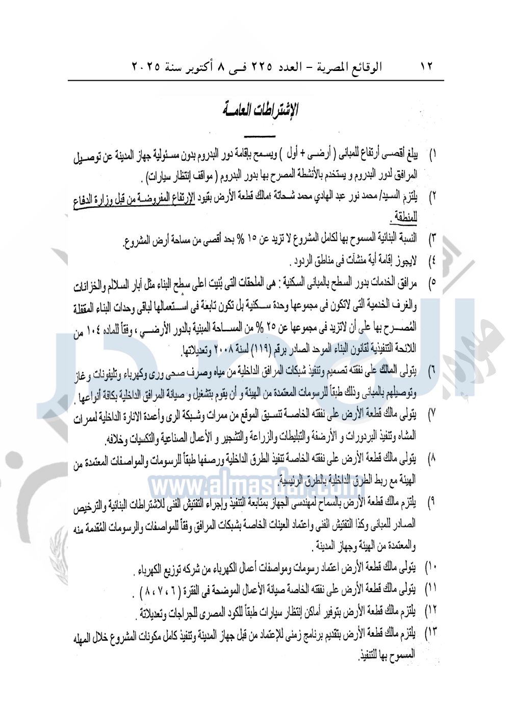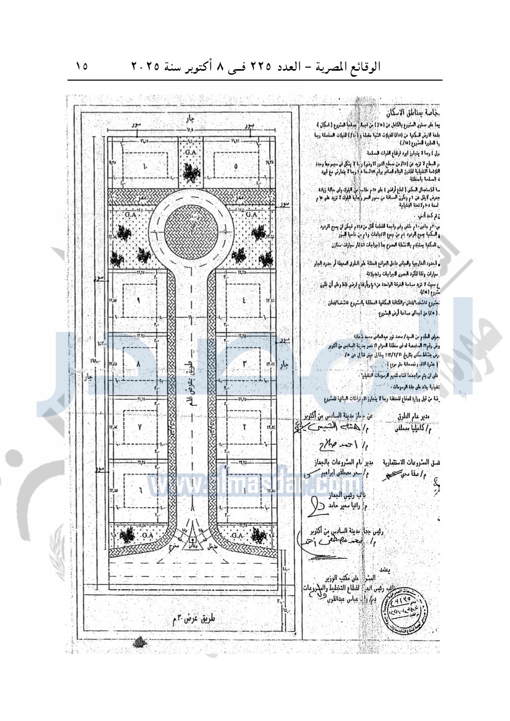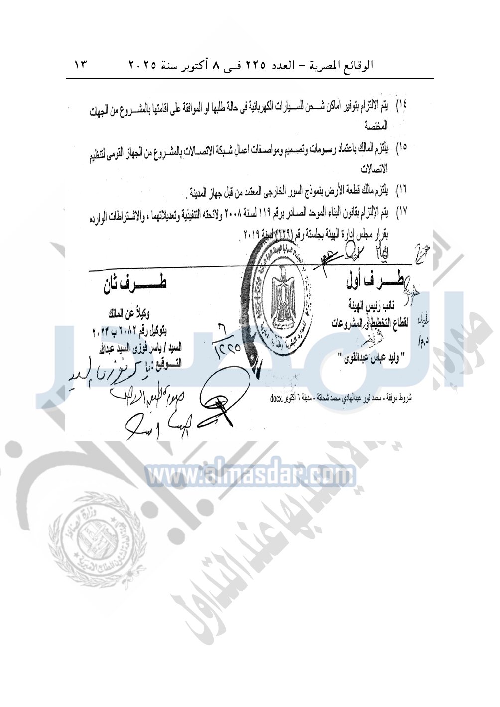 نشرت الوقائع المصرية في العدد 225، الصادر بتاريخ 8 أكتوبر 2025، قرار وزارة الإسكان والمرافق والمجتمعات العمرانية، رقم 1225 لسنة 2024، بتاريخ 19-10-2024، بشأن إعتماد تخطيط وتقسيم قطعة الأرض رقم "م/ 2" بمساحة "2.5 فدان" بما يعادل "10500م2" الواقعة بالحوض رقم "32" بالحزام الأخضر بمدينة 6 أكتوبر المخصصة لـ محمد نور عبد الهادي محمد شحاتة حسب النبي لإقامة مشروع سكنى بمقابل. ونشاط خدمى تخديمه من الخارج بعلاوة سعرية.
