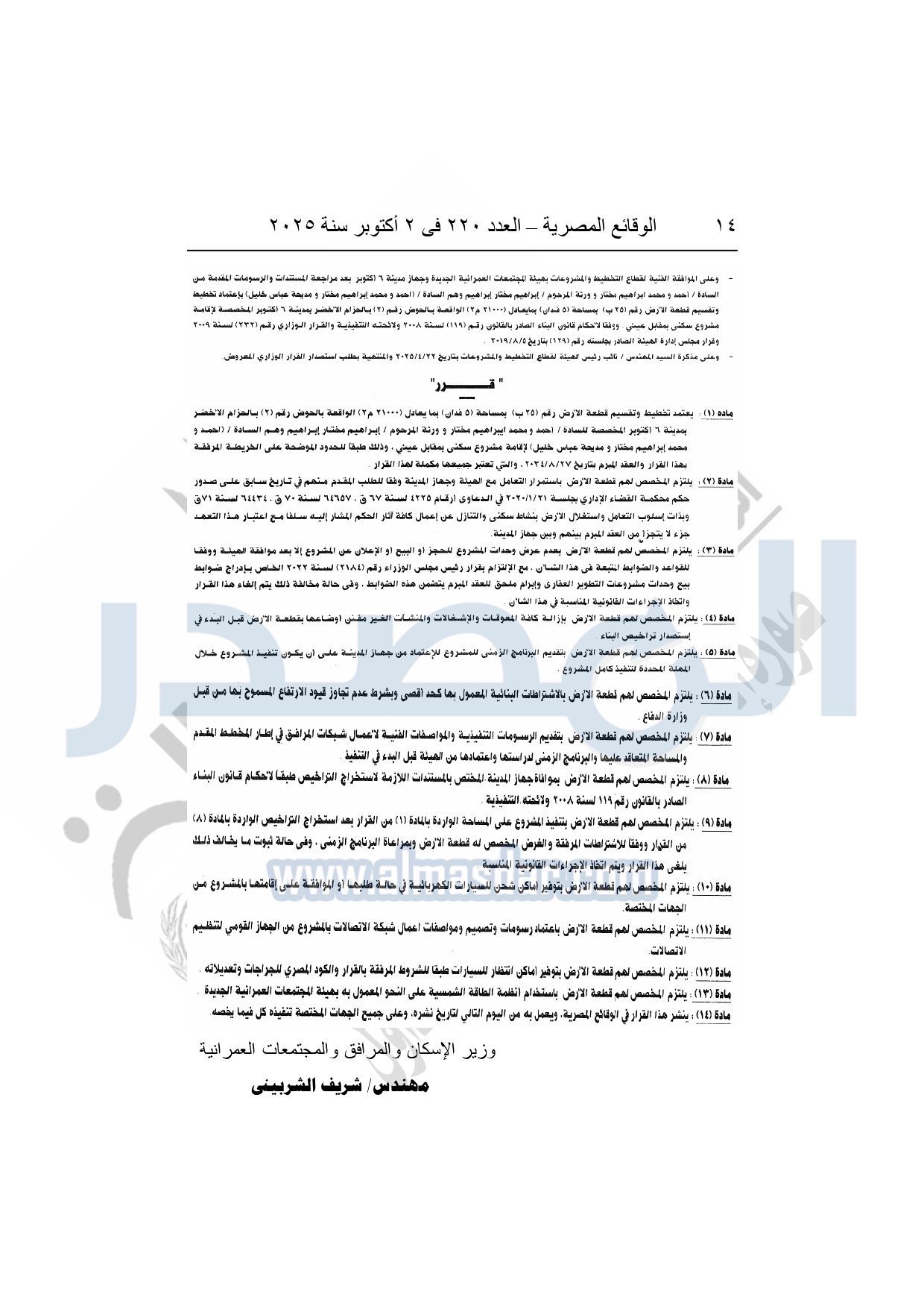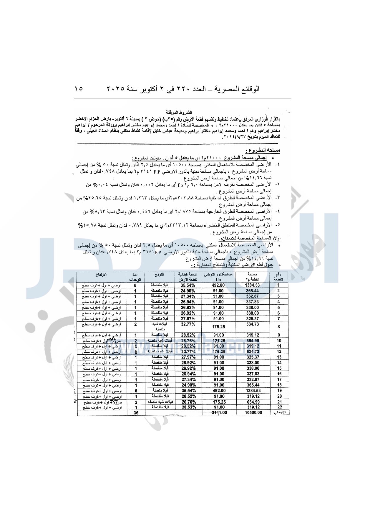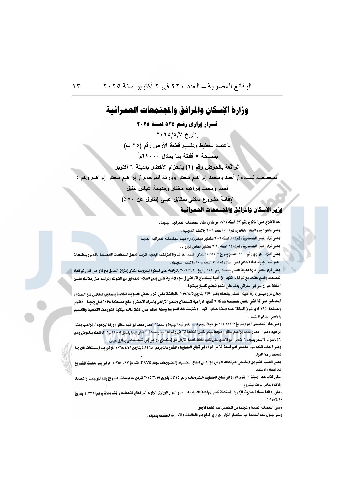 كما نشرت الوقائع المصرية في العدد 220، الصادر بتاريخ 2 أكتوبر 2025، قرار وزارة الإسكان والمرافق والمجتمعات العمرانية، رقم 534 لسنة 2025، بتاريخ 7-5-2025، بشأن إعتماد تخطيط وتقسيم قطعة الأرض رقم "25 ب" بمساحة 5 أفدنة بما يعادل 21000م2 الواقعة بالحوض رقم "2" بالحزام الأخضر بمدينة 6 أكتوبر المخصصة لـ أحمد ومحمد إبراهيم مختار وورثة المرحوم إبراهيم مختار إبراهيم وهم: أحمد ومحمد إبراهيم مختار ومديحة عباس خليل لإقامة مشروع سكنى بمقابل عينى "تنازل عن 50%".