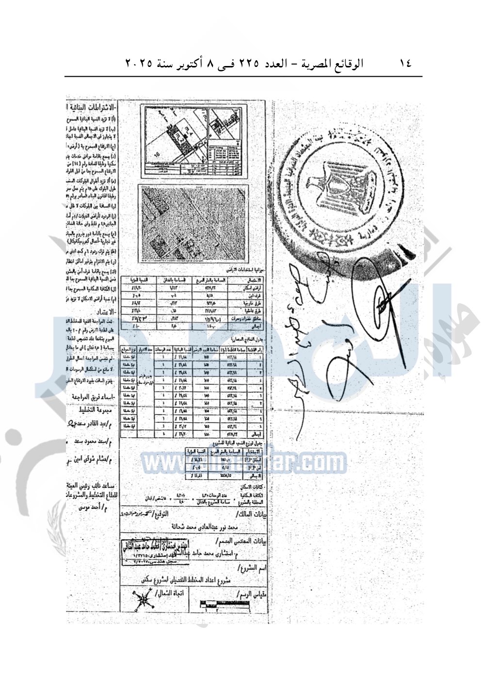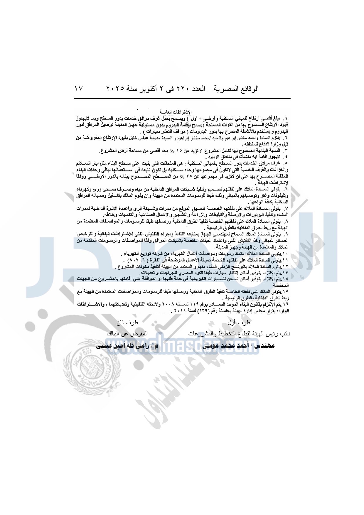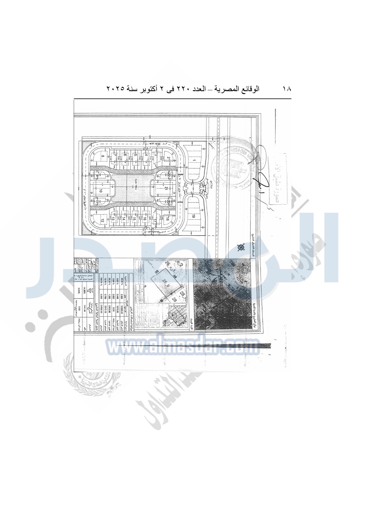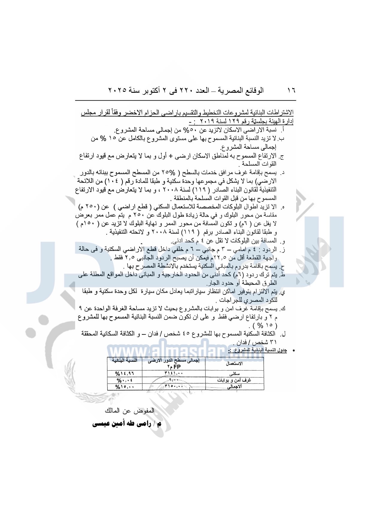 كما نشرت الوقائع المصرية في العدد 220، الصادر بتاريخ 2 أكتوبر 2025، قرار وزارة الإسكان والمرافق والمجتمعات العمرانية، رقم 534 لسنة 2025، بتاريخ 7-5-2025، بشأن إعتماد تخطيط وتقسيم قطعة الأرض رقم "25 ب" بمساحة 5 أفدنة بما يعادل 21000م2 الواقعة بالحوض رقم "2" بالحزام الأخضر بمدينة 6 أكتوبر المخصصة لـ أحمد ومحمد إبراهيم مختار وورثة المرحوم إبراهيم مختار إبراهيم وهم: أحمد ومحمد إبراهيم مختار ومديحة عباس خليل لإقامة مشروع سكنى بمقابل عينى "تنازل عن 50%".