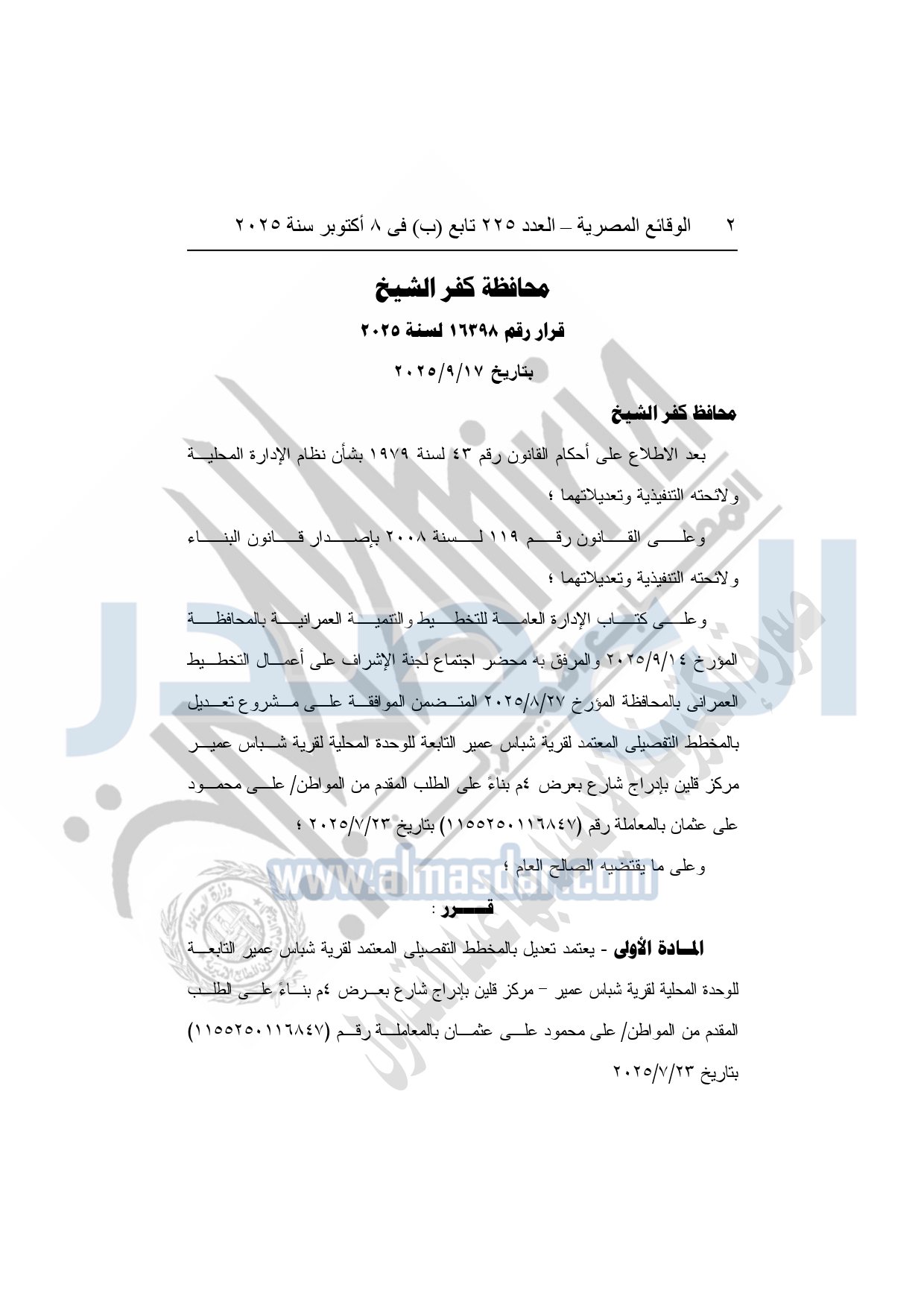 نشرت الوقائع المصرية في العدد 225 تابع "ب"، الصادر بتاريخ 8 أكتوبر 2025، قرار محافظة كفر الشيخ، رقم 16398 لسنة 2025، بتاريخ 17-9-2025، بشأن إعتماد تعديل بالمخطط التفصيلي المعتمد لقرية شباس عمير.