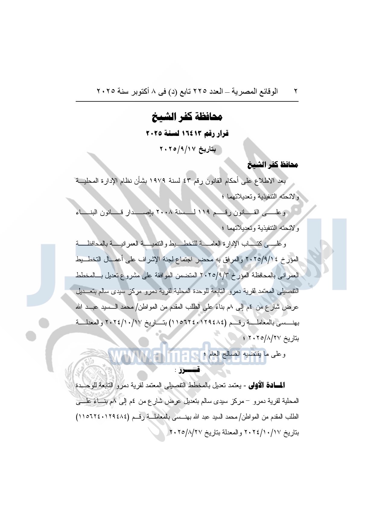 يعتمد تعديل بالمخطط التفصيلي المعتمد لقرية دمرو التابعة للوحدة المحلية لقرية دمرو – مركز سيدى سالم بتعديل عرض شارع من 4م إلى 8م بناء على الطلب المقدم من المواطن محمد السيد عبد الله بهنسى بالمعاملة رقم "1156240129484" بتاريخ 17-10-2024 والمعدلة بتاريخ 27-8-2025.