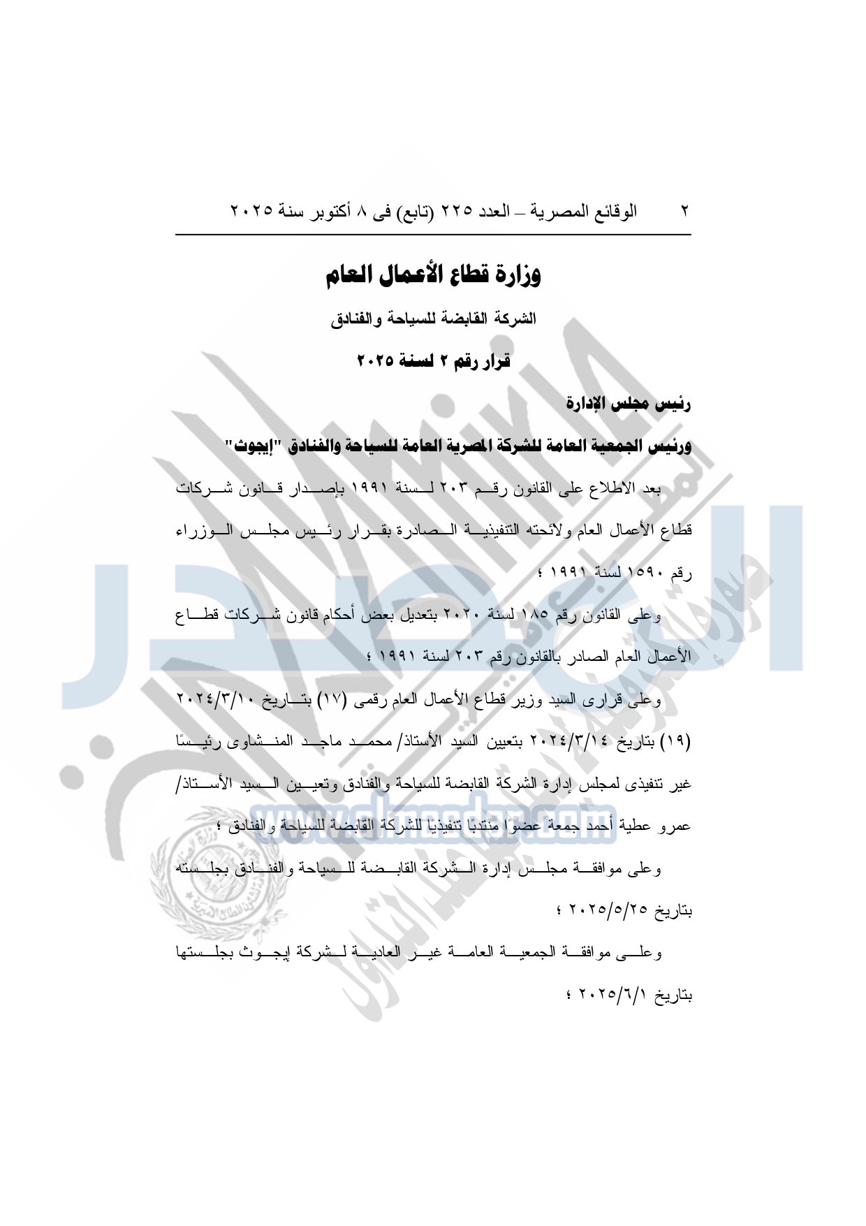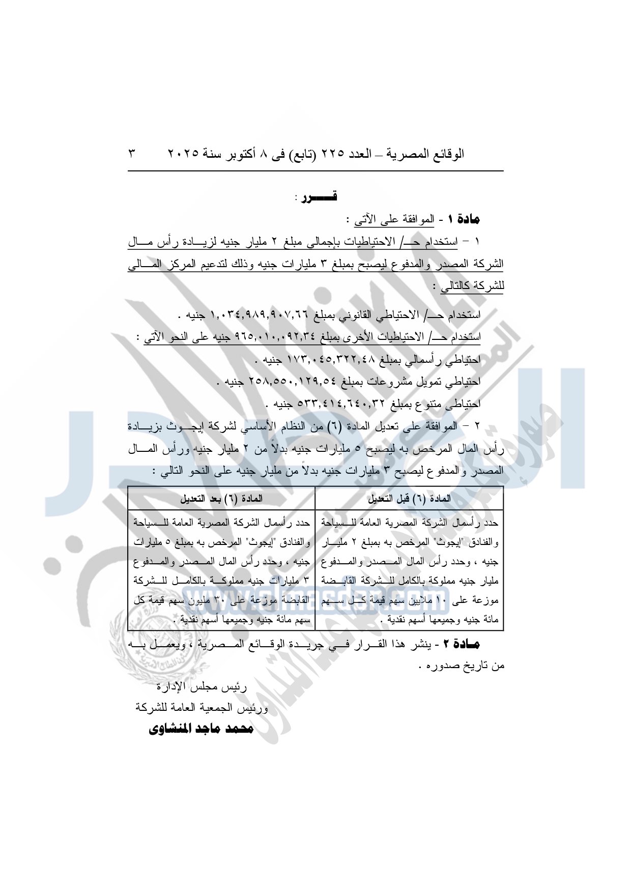 نشرت الوقائع المصرية في العدد 225 "تابع"، الصادر بتاريخ 8 أكتوبر 2025، قرار وزارة قطاع الأعمال العام، الشركة القابضة للسياحة والفنادق، قرار رقم 2 لسنة 2025، بشأن الموافقة على تعديل المادة "6" من النظام الأساسي لشركة إيجوث.