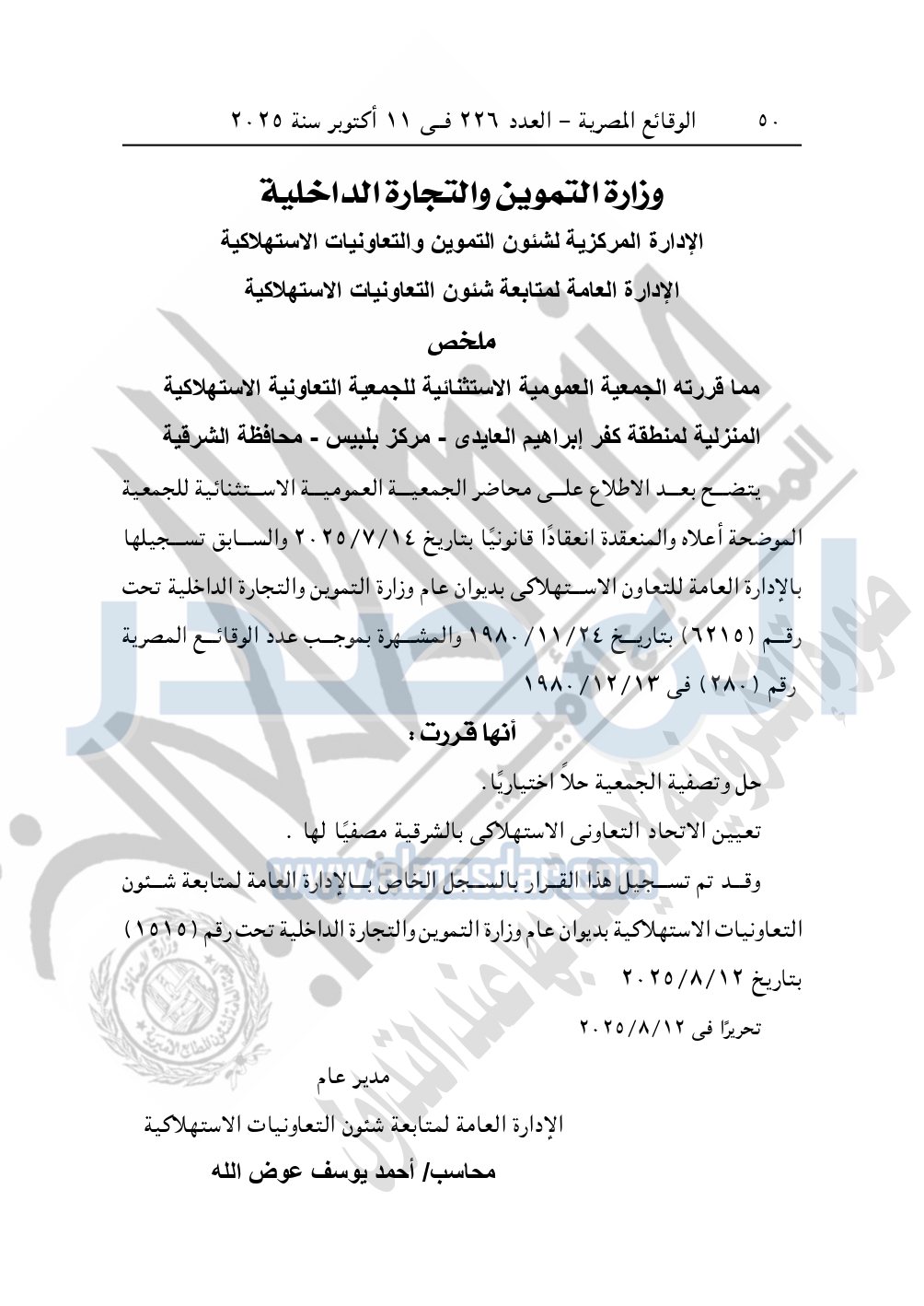 نشرت الوقائع المصرية في العدد 226، بتاريخ 11 أكتوبر 2025، قرار وزارة التموين والتجارة الداخلية، الإدارة المركزية لشئون التموين والتعاونيات الاستهلاكية، الإدارة العامة لمتابعة شئون التعاونيات الاستهلاكية، بشأن ملخص مما قررته الجمعية العمومية الاستثنائية للجمعية التعاونية الاستهلاكية المنزلية لمنطقة كفر إبراهيم العايدى - مركز بلبيس - محافظة الشرقية.