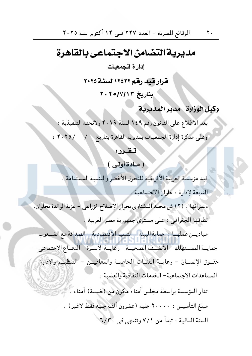 نشرت الوقائع المصرية في العدد 227، بتاريخ 12 أكتوبر 2025، قرار مديرية التضامن الاجتماعي بالقاهرة، قيد رقم 12422 لسنة 2025، بتاريخ 13-7-2025، بشأن قيد مؤسسة العربية الأفريقية للتحول الأخضر والتنمية المستدامة.
