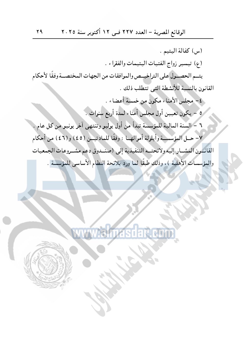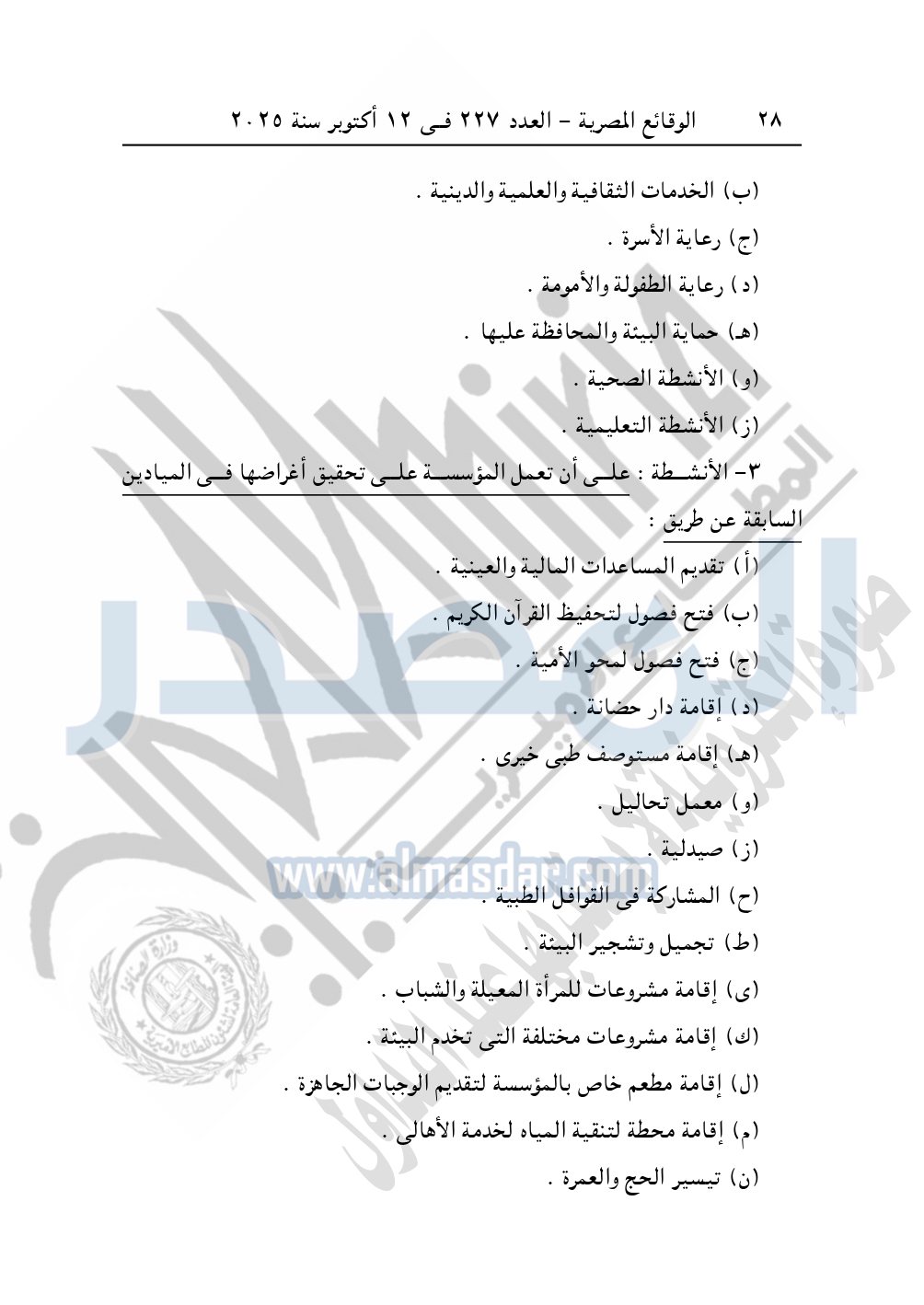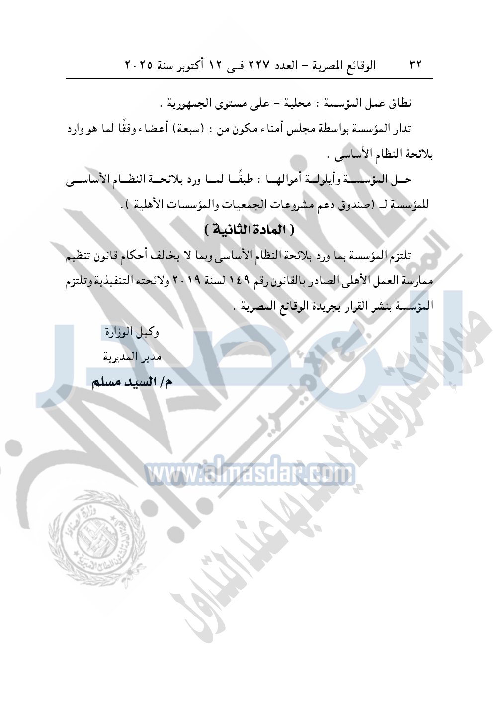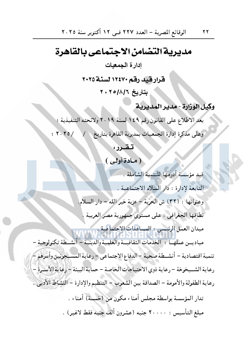 كما نشرت الوقائع المصرية في العدد 227، بتاريخ 12 أكتوبر 2025، قرار مديرية التضامن الاجتماعي بالقاهرة، قيد رقم 12470 لسنة 2025، بتاريخ 6-8-2025، بشأن قيد مؤسسة أدومها للتنمية الشاملة.