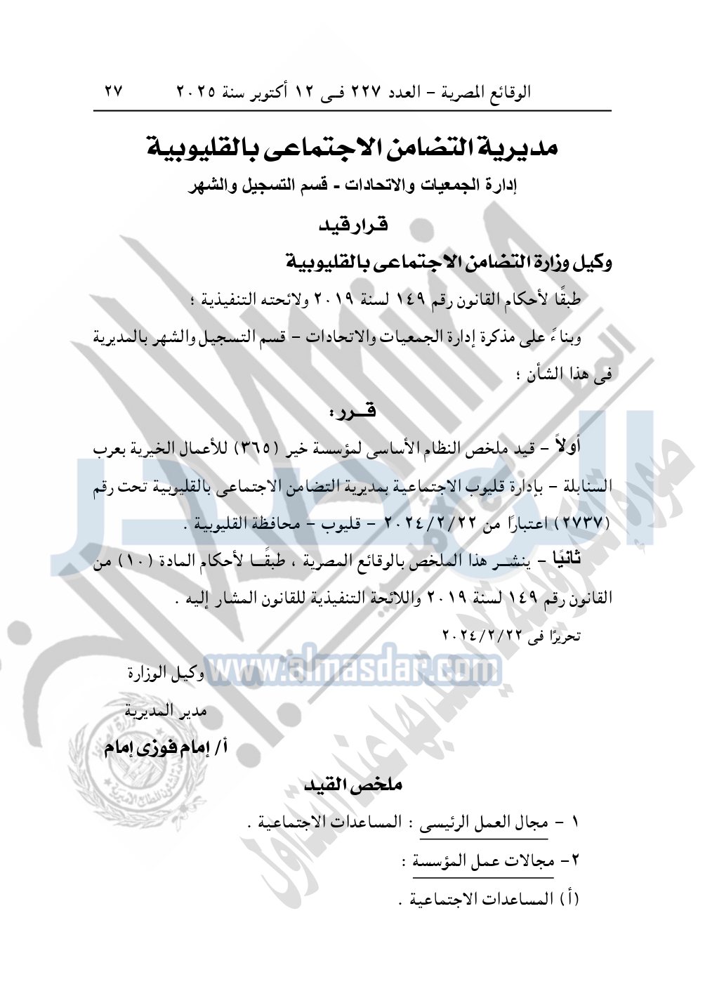 وأيضا نشرت الوقائع المصرية في العدد 227، بتاريخ 12 أكتوبر 2025، قرار مديرية التضامن الاجتماعي بالقليوبية، قيد رقم 2737، بشأن قيد مؤسسة خير "365" للأعمال الخيرية بعرب السنابلة.