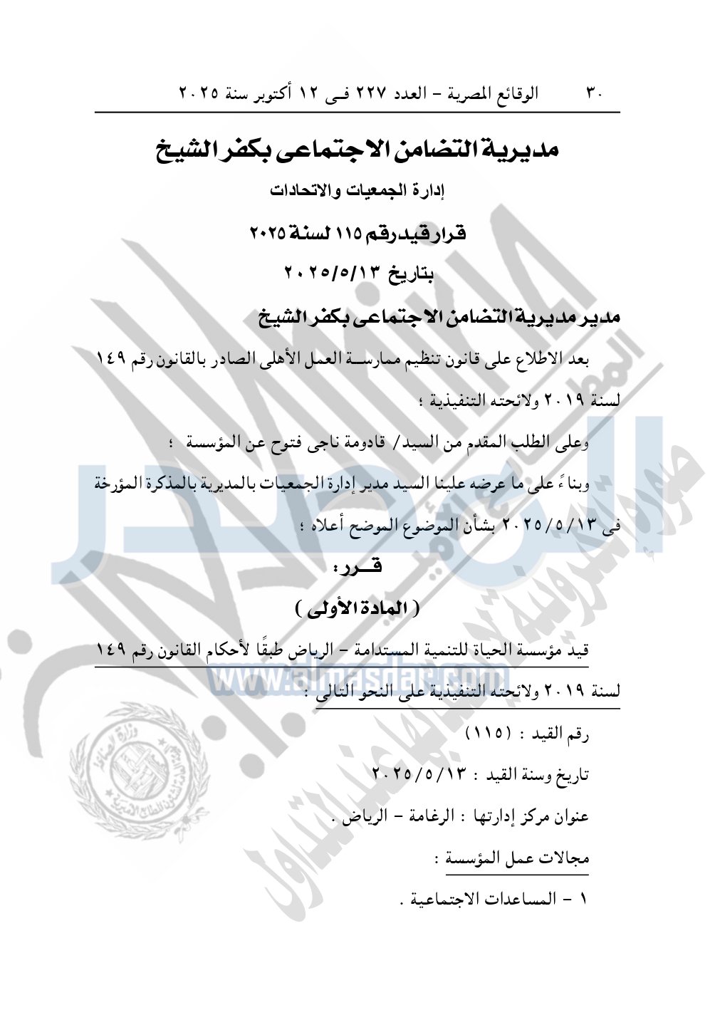 ونشرت الوقائع المصرية في العدد 227، بتاريخ 12 أكتوبر 2025، قرار مديرية التضامن الاجتماعي بكفر الشيخ، قيد رقم 115 لسنة 2025، بتاريخ 13-5-2025، بشأن قيد مؤسسة الحياة للتنمية المستدامة.