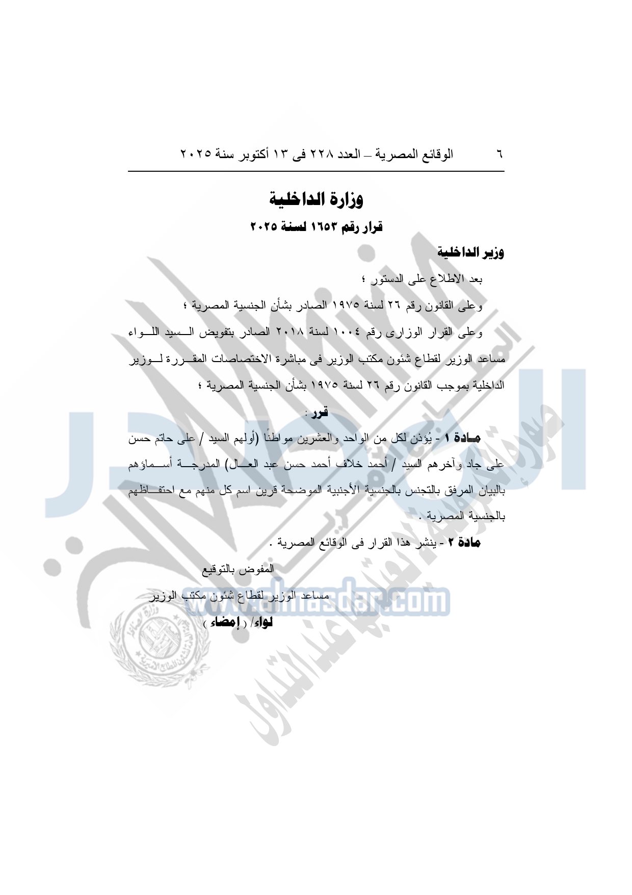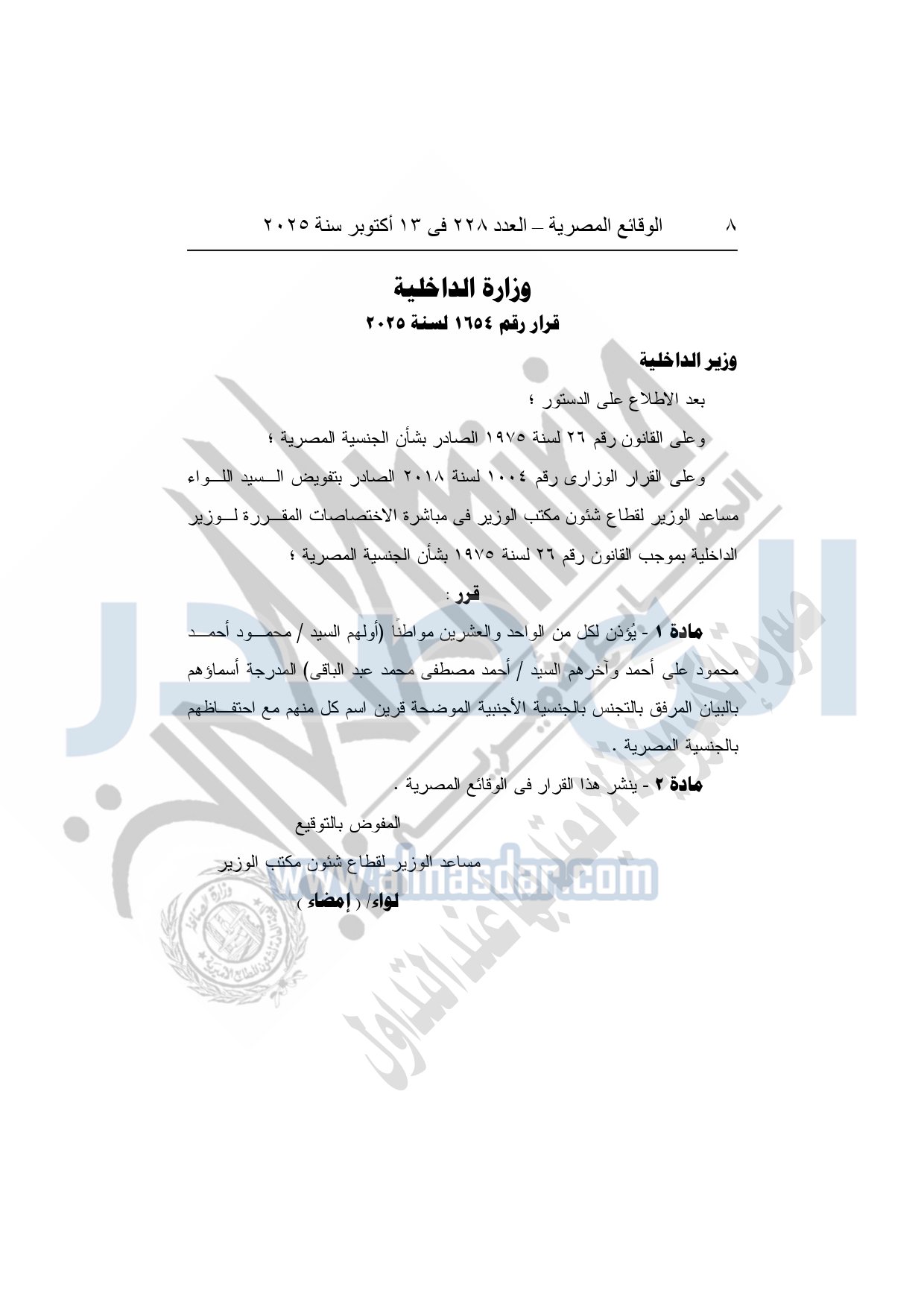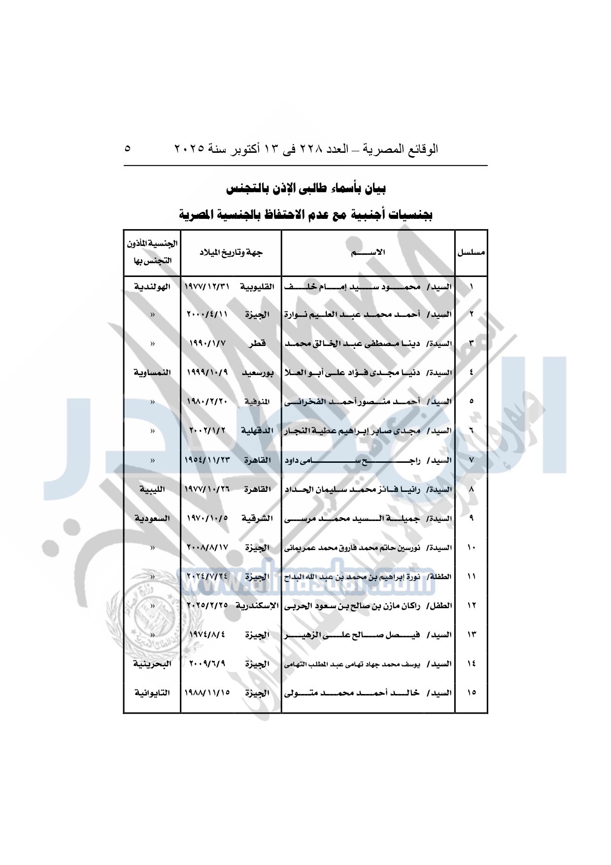 نشرت الوقائع المصرية في العدد 228 الصادر في 13 أكتوبر سنة 2025، قرار وزارة الداخلية، رقم 1652 لسنة 2025، بشأن الإذن للخمسة عشر مواطن بالحصول على الجنسية الأجنبية مع احتفاظهم بالجنسية المصرية.
