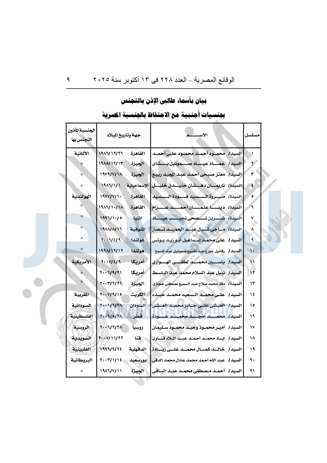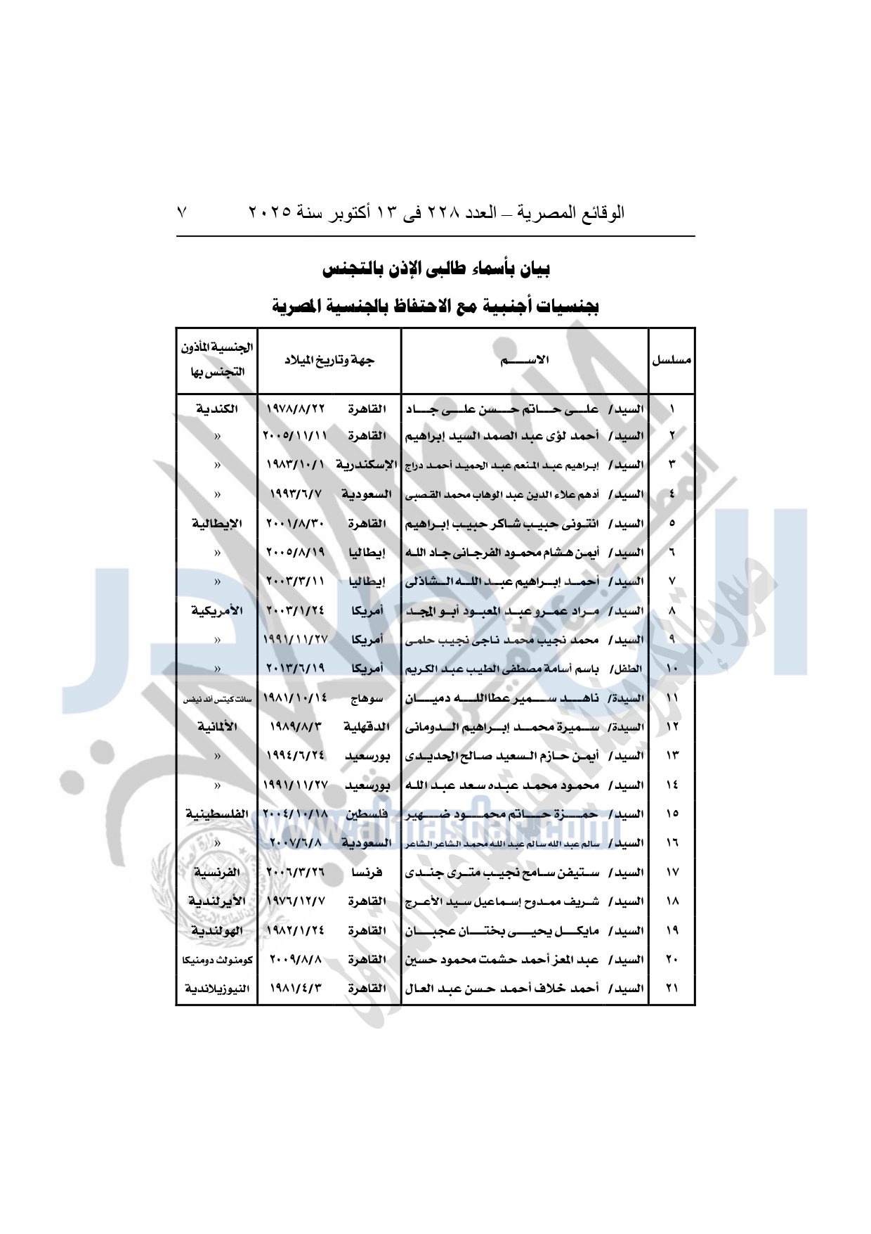 كما نشرت الوقائع المصرية أيضًا في العدد 228 الصادر في 13 أكتوبر سنة 2025، قرار وزارة الداخلية، رقم 1654 لسنة 2025، بشأن الإذن لواحد وعشرين مواطن بالحصول على الجنسية الأجنبية مع احتفاظهم بالجنسية المصرية.