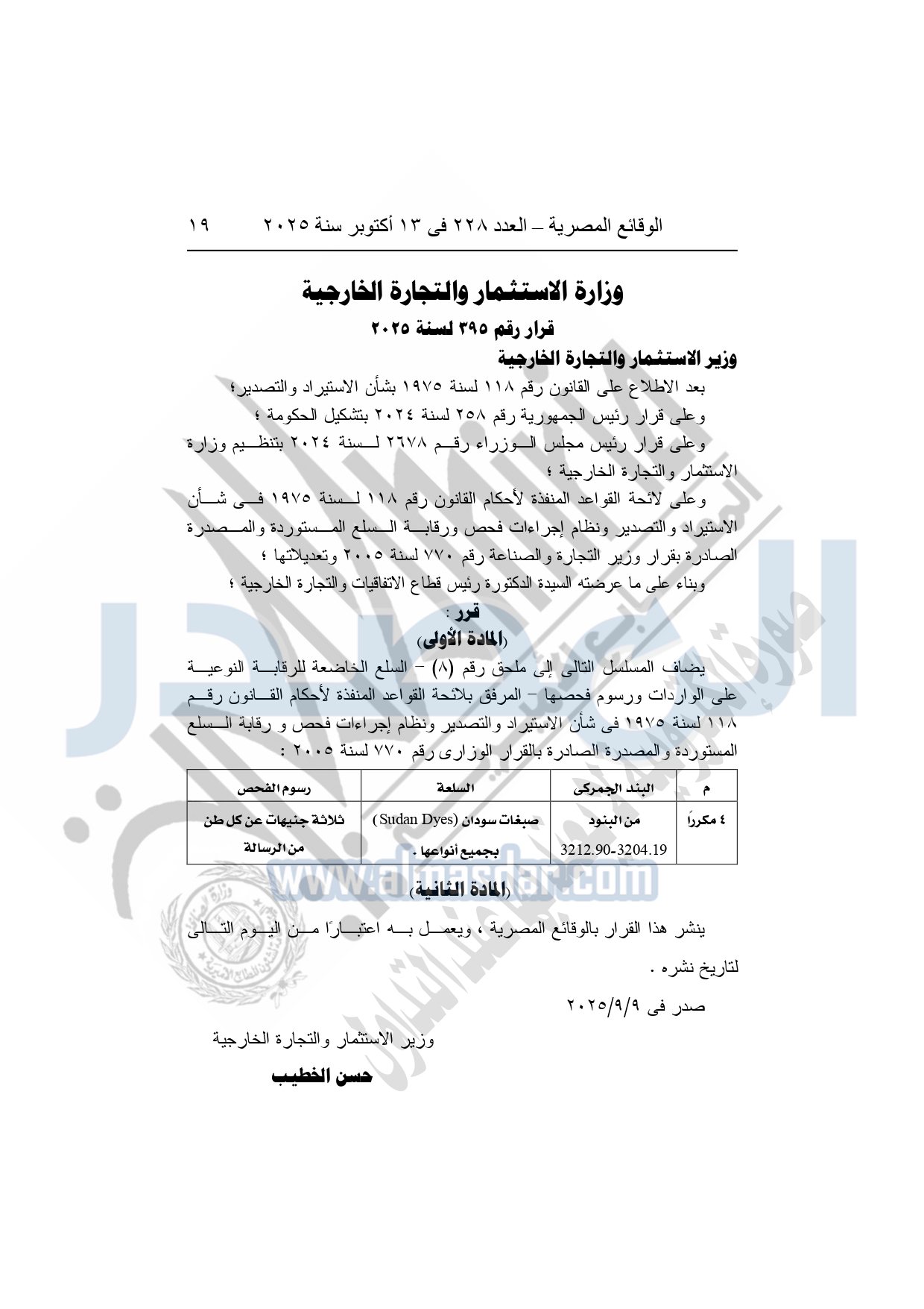 نشرت الوقائع المصرية في العدد 228 الصادر في 13 أكتوبر سنة 2025، قرار وزارة الاستثمار والتجارة الخارجية، رقم 395 لسنة 2025، بشأن إعلان رسوم فحص واردات «صبغات سودان» بجميع أنواعها.