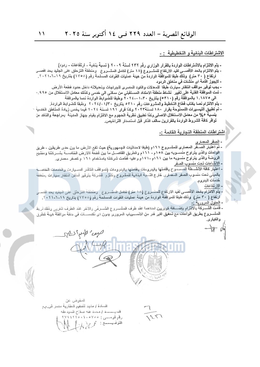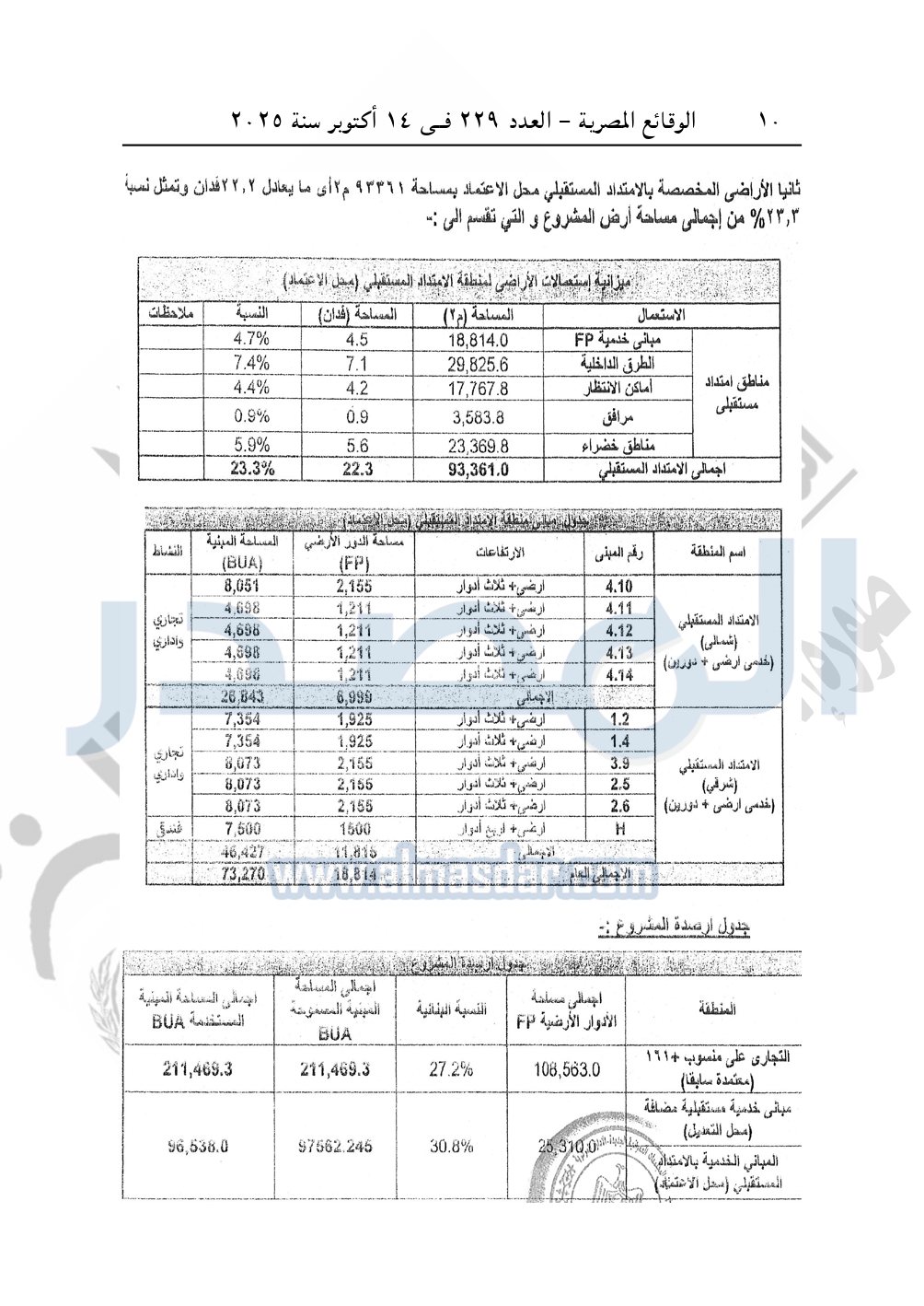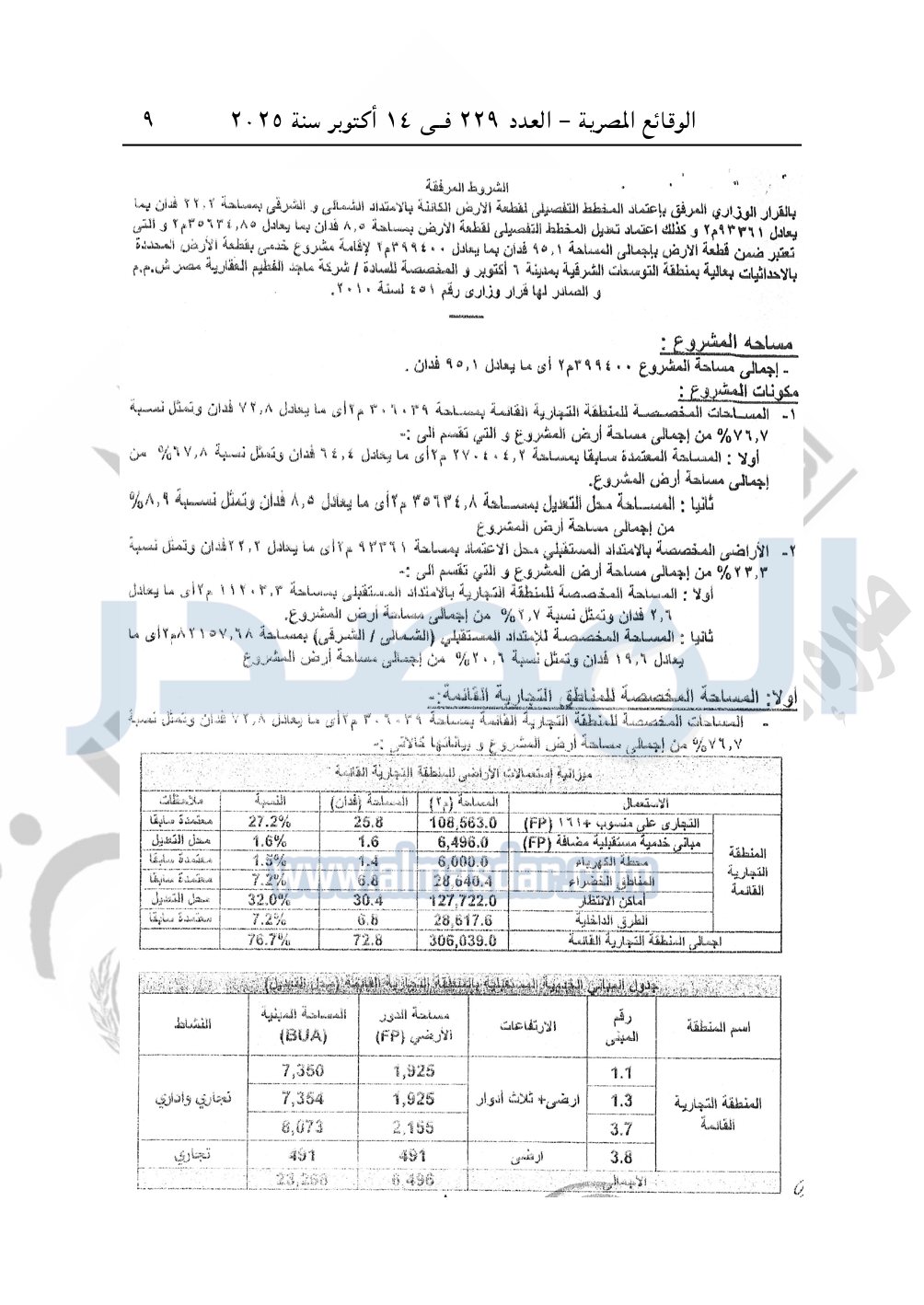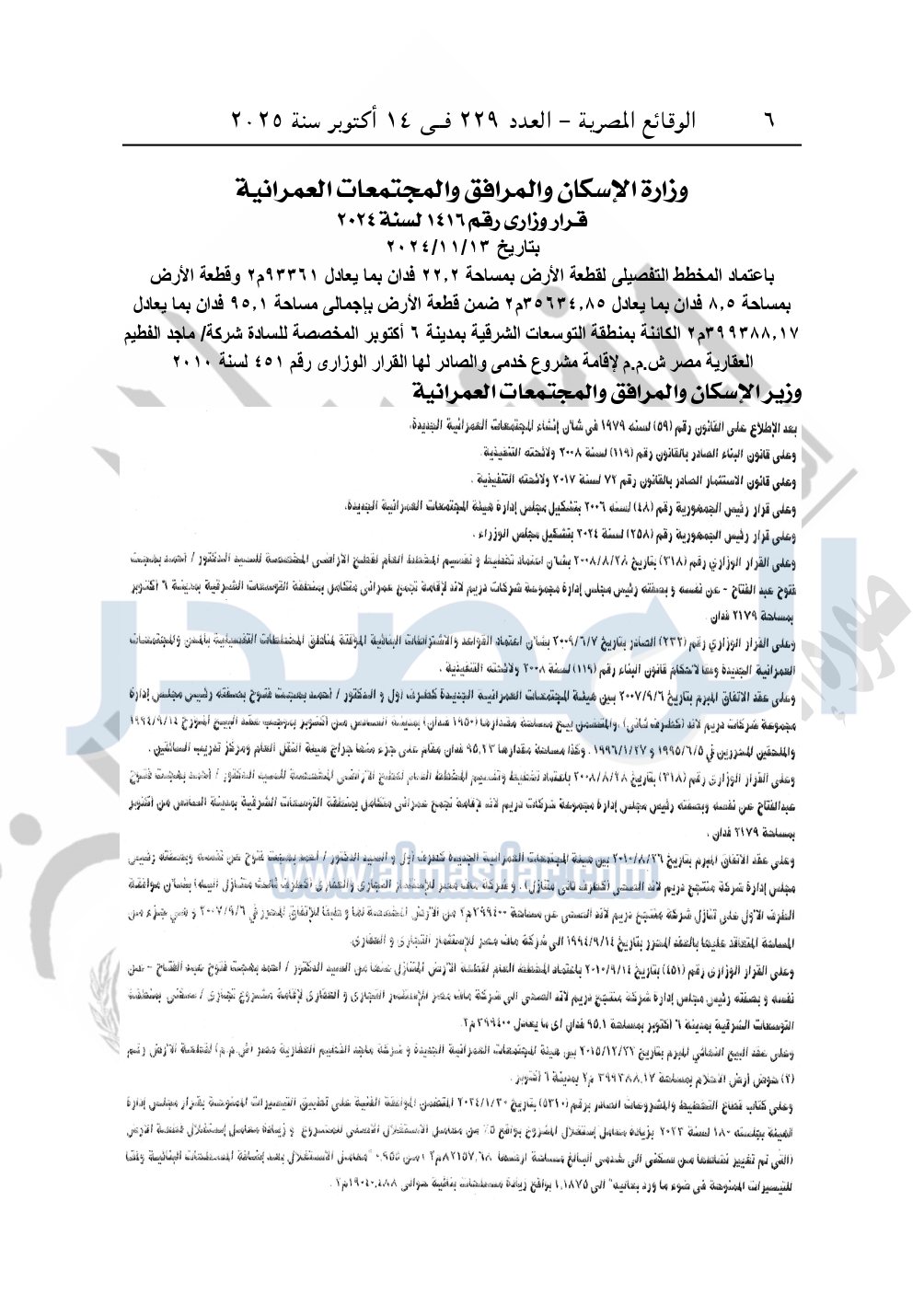نشرت الوقائع المصرية في العدد 229 الصادر في 14 أكتوبر سنة 2025، قرار وزارة الإسكان والمرافق والمجتمعات العمرانية، رقم 1416 لسنة 2024، بتاريخ 13-11-2024، بشأن اعتماد المخطط التفصيلي لقطعة الأرض بمساحة 22.2 فدان بما يعادل 93361م2 وقطعة الأرض بمساحة 8.5 فدان بما يعادل 35634.85م2 بمنطقة التوسعات الشرقية بمدينة 6 أكتوبر المخصصة لشركة ماجد الفطيم العقارية مصر.