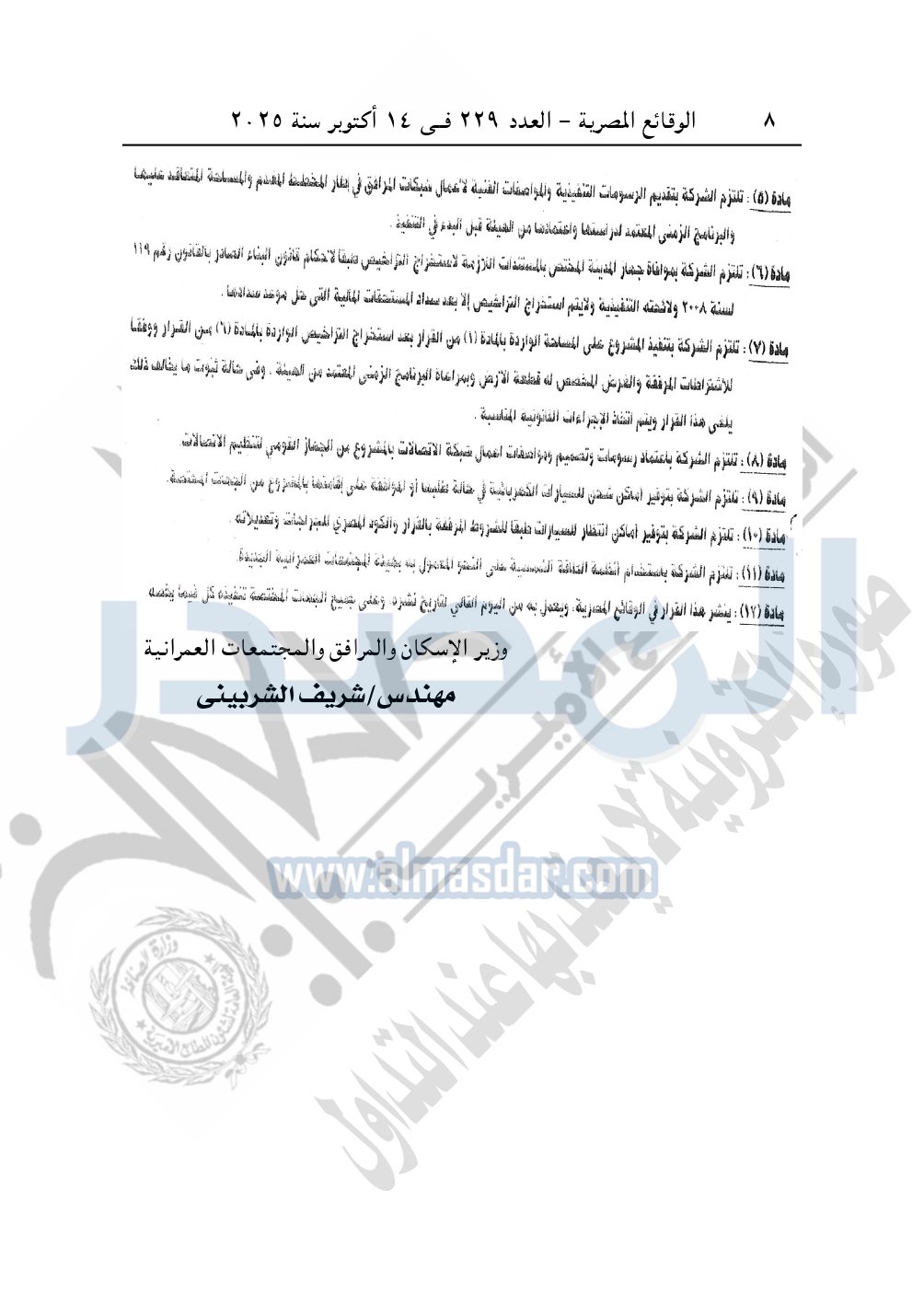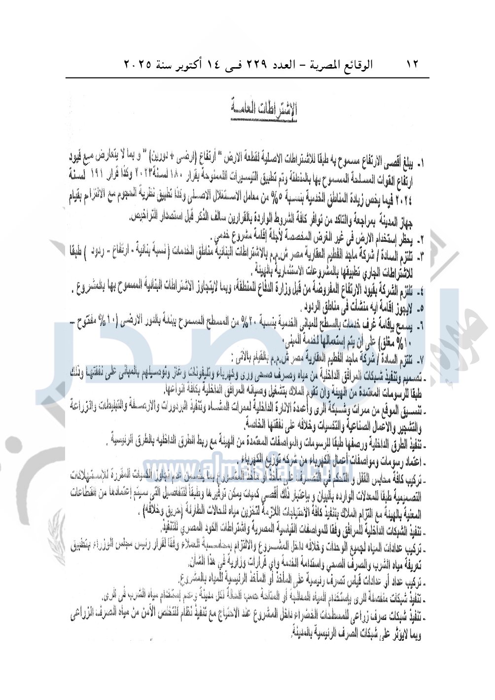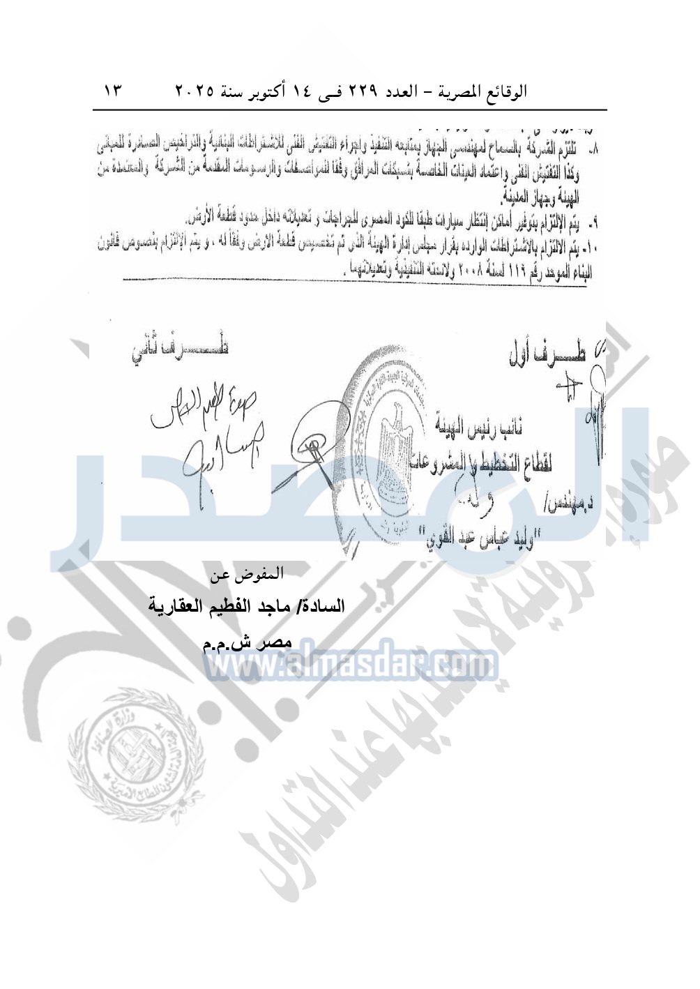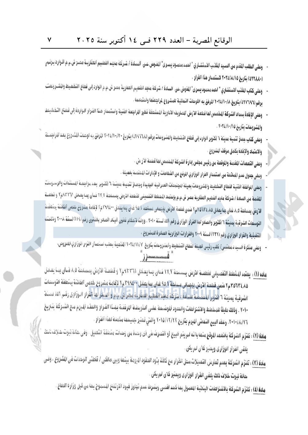 نشرت الوقائع المصرية في العدد 229 الصادر في 14 أكتوبر سنة 2025، قرار وزارة الإسكان والمرافق والمجتمعات العمرانية، رقم 1416 لسنة 2024، بتاريخ 13-11-2024، بشأن اعتماد المخطط التفصيلي لقطعة الأرض بمساحة 22.2 فدان بما يعادل 93361م2 وقطعة الأرض بمساحة 8.5 فدان بما يعادل 35634.85م2 بمنطقة التوسعات الشرقية بمدينة 6 أكتوبر المخصصة لشركة ماجد الفطيم العقارية مصر.