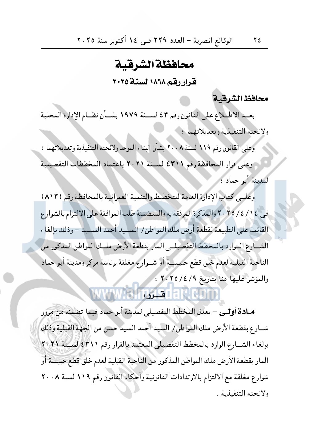 نشرت الوقائع المصرية في العدد 229 الصادر في 14 أكتوبر سنة 2025، قرار محافظة الشرقية، رقم 1868 لسنة 2025، بشأن تعديل المخطط التفصيلى لمدينة أبو حماد.