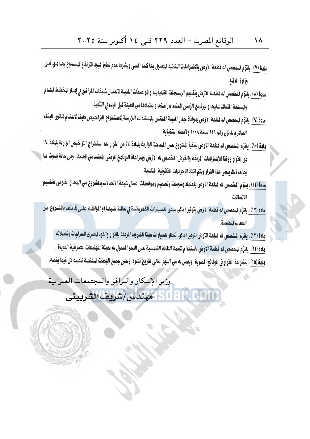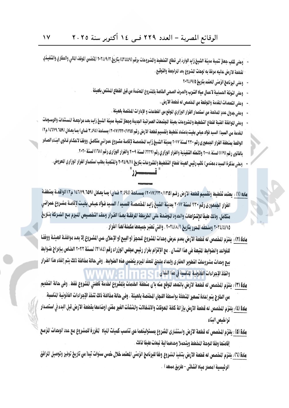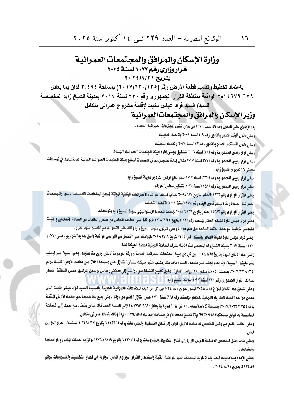نشرت الوقائع المصرية في العدد 229 الصادر في 14 أكتوبر سنة 2025، قرار وزارة الإسكان والمرافق والمجتمعات العمرانية، رقم 1077 لسنة 2024، بتاريخ 21-9-2024، بشأن اعتماد تخطيط وتقسيم قطعة أرض بمساحة 3.494 فدان بمدينة الشيخ زايد المخصصة لإقامة مشروع عمراني متكامل.