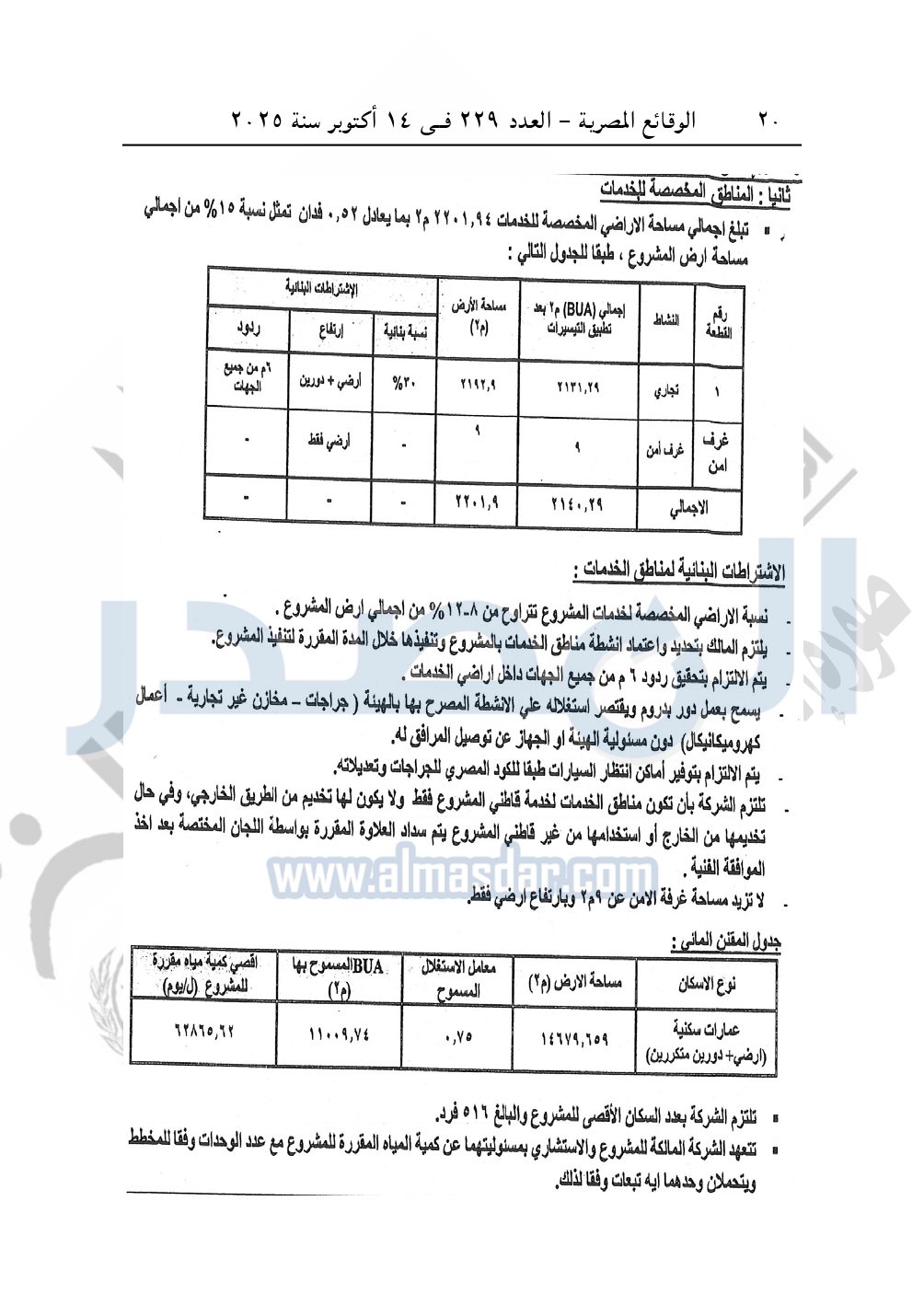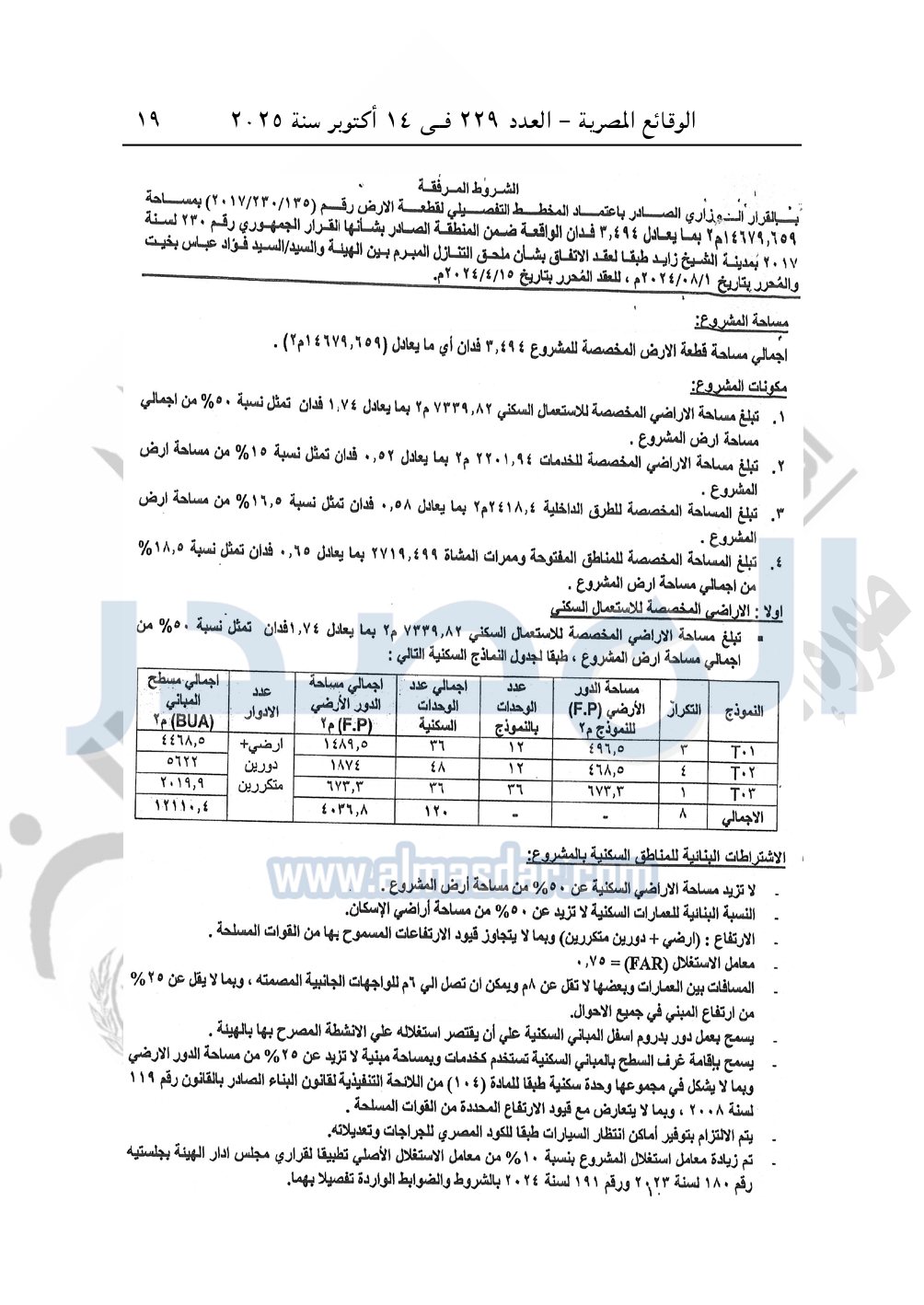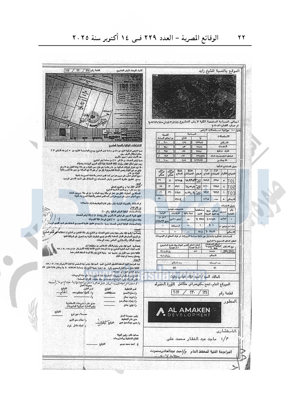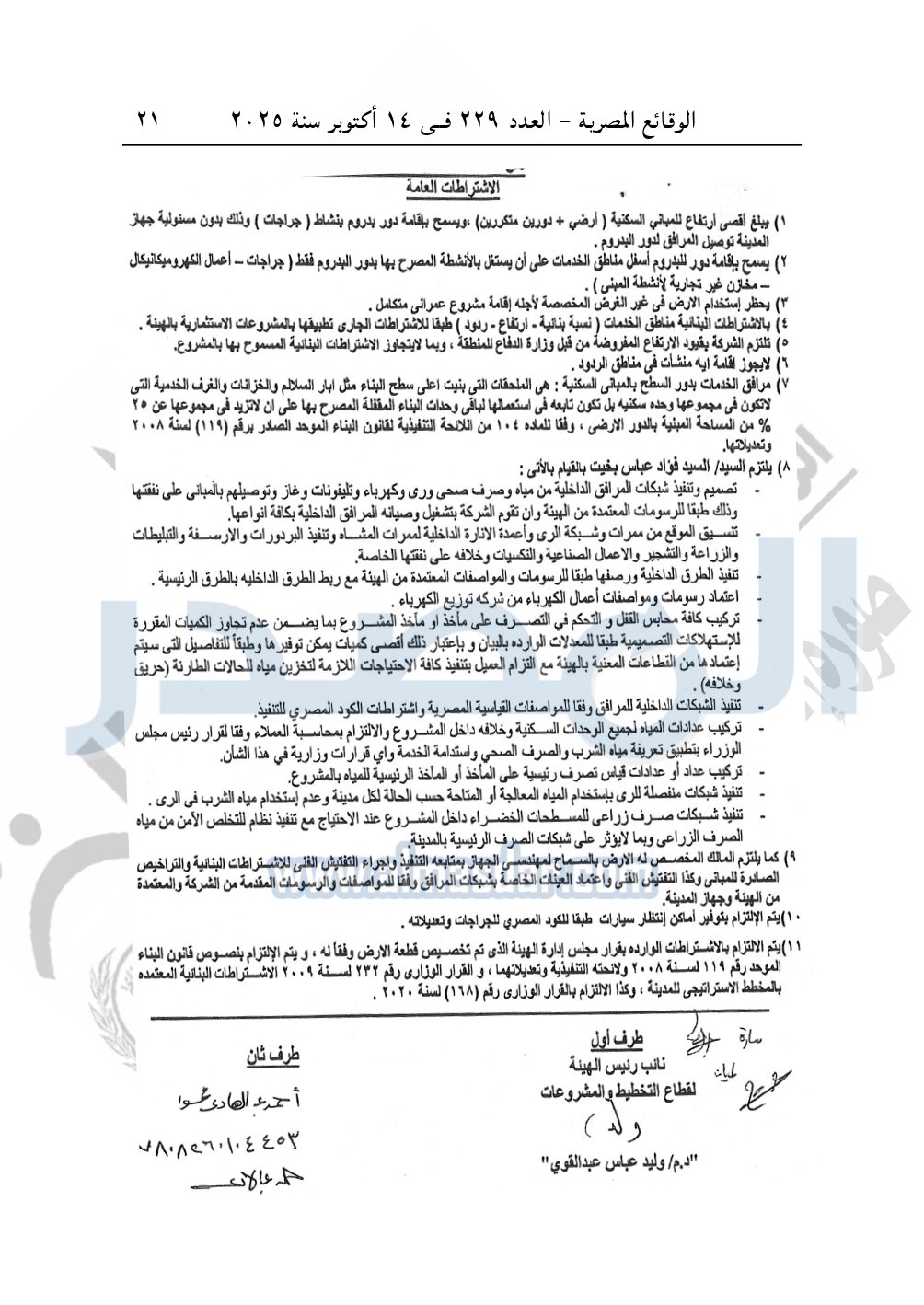 نشرت الوقائع المصرية في العدد 229 الصادر في 14 أكتوبر سنة 2025، قرار وزارة الإسكان والمرافق والمجتمعات العمرانية، رقم 1077 لسنة 2024، بتاريخ 21-9-2024، بشأن اعتماد تخطيط وتقسيم قطعة أرض بمساحة 3.494 فدان بمدينة الشيخ زايد المخصصة لإقامة مشروع عمراني متكامل.