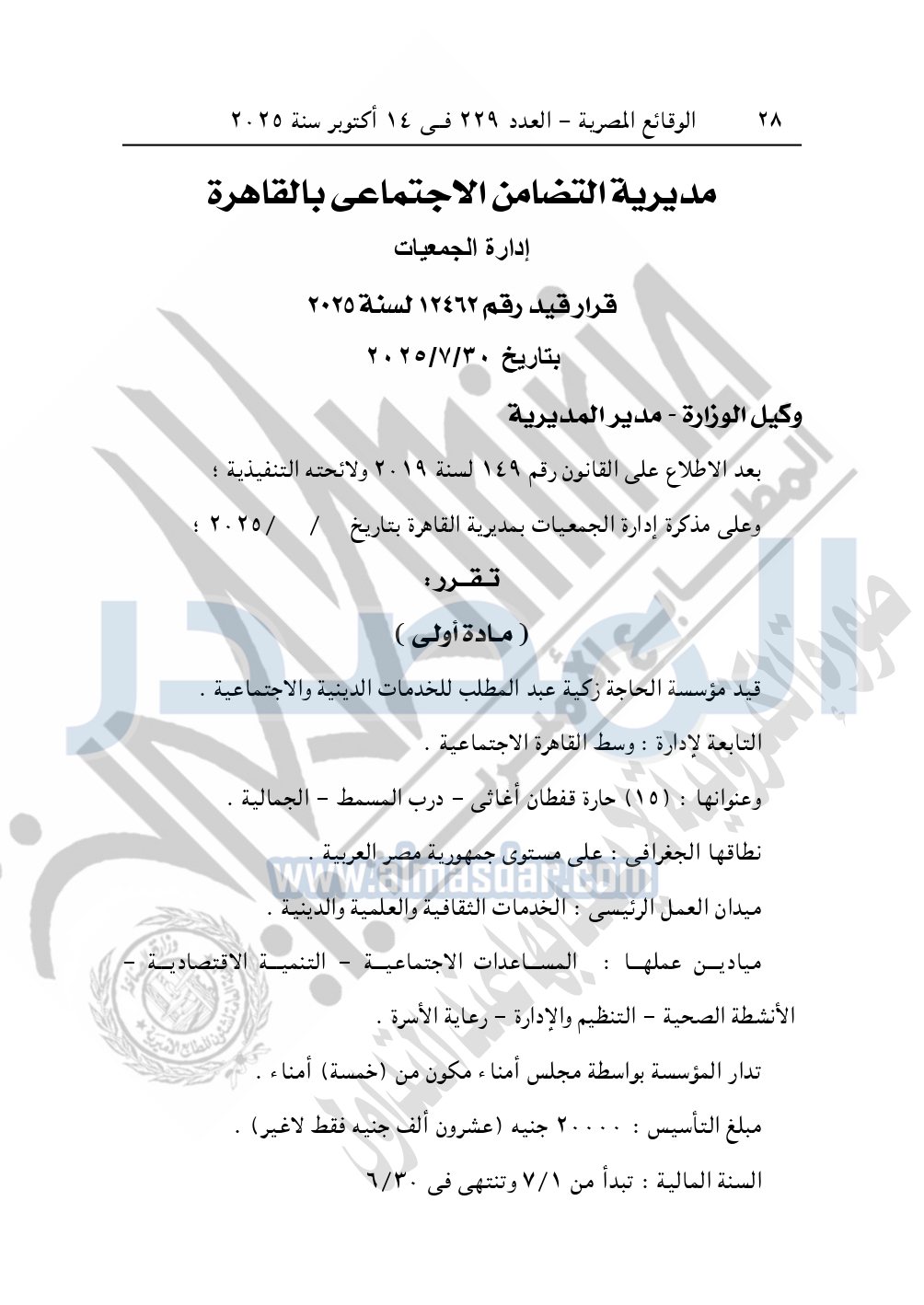 نشرت الوقائع المصرية في العدد 229، بتاريخ 14 أكتوبر 2025، قرار مديرية التضامن الاجتماعي بالقاهرة، قيد رقم 12462 لسنة 2025، بتاريخ 30-7-2025، بشأن قيد مؤسسة الحاجة زكية عبد المطلب للخدمات الدينية والاجتماعية.