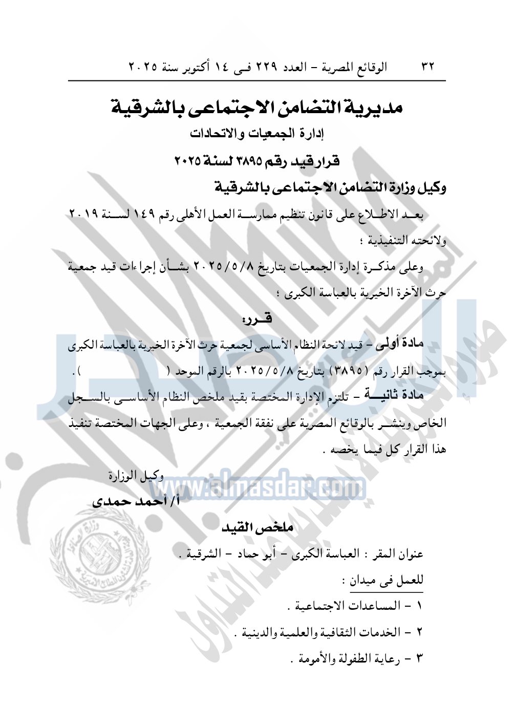 كما نشرت الوقائع المصرية في العدد 229، بتاريخ 14 أكتوبر 2025، قرار مديرية التضامن الاجتماعي الشرقية، قيد رقم 3895 لسنة 2025، بشأن قيد جمعية حرث الآخرة الخيرية بالعباسة الكبرى.