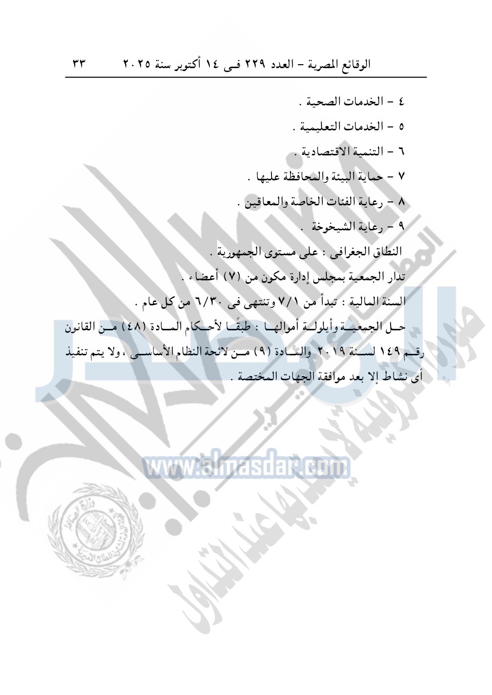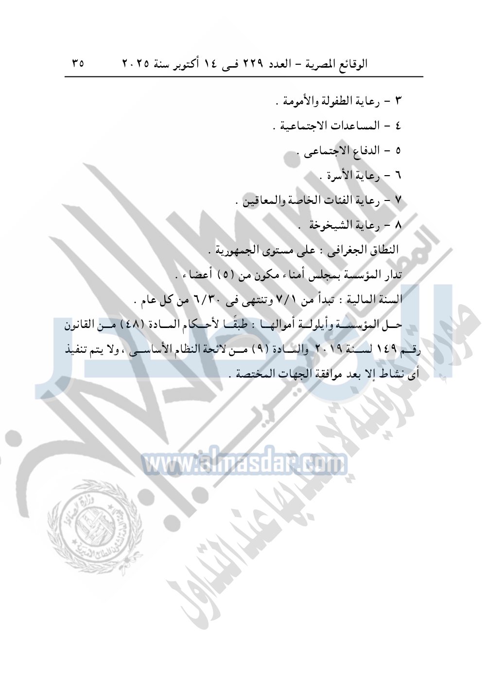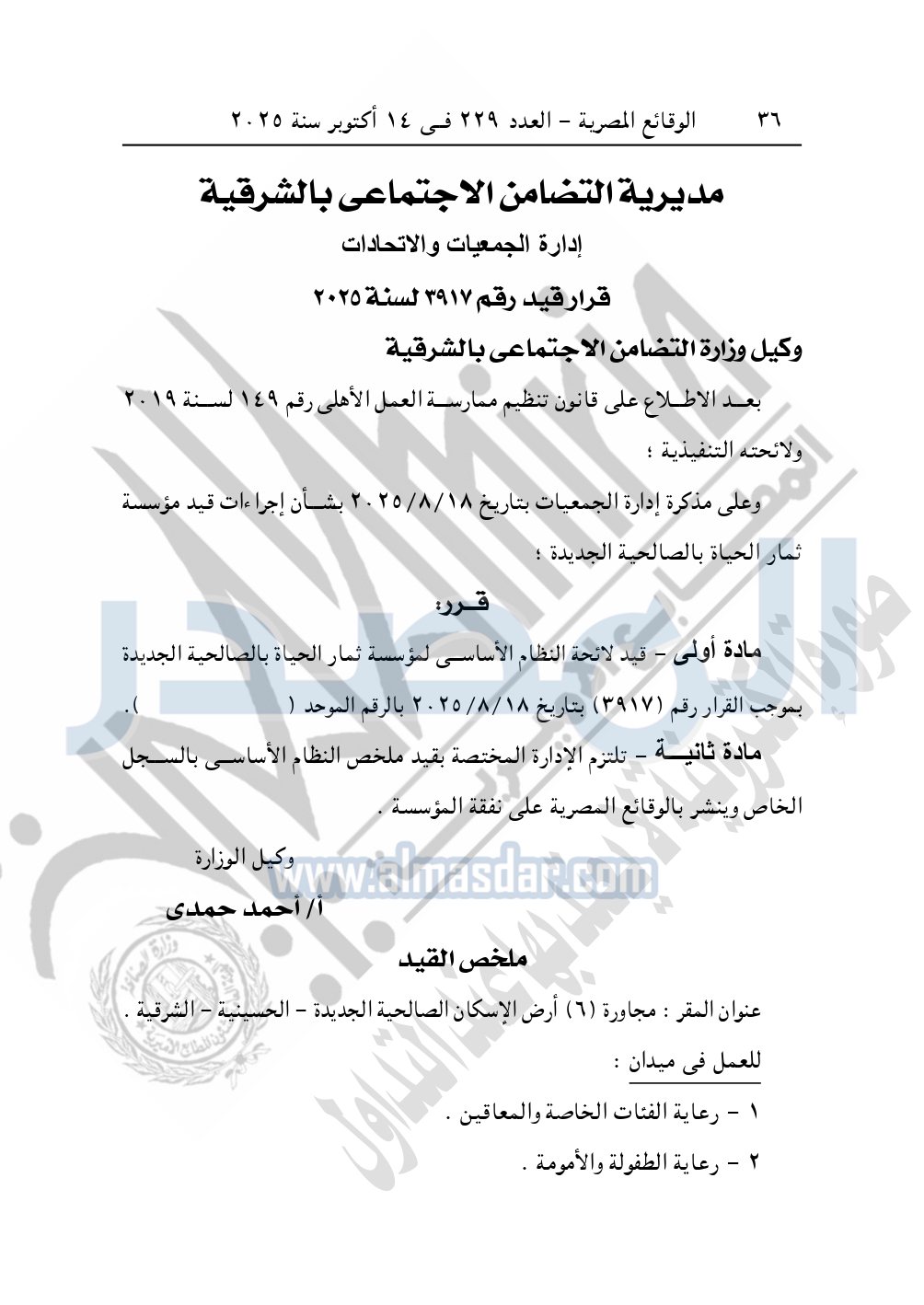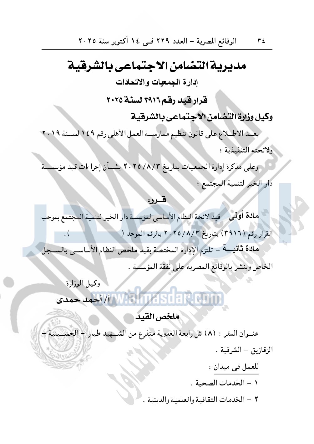 وأيضا نشرت الوقائع المصرية في العدد 229، بتاريخ 14 أكتوبر 2025، قرار مديرية التضامن الاجتماعي بالشرقية، قيد رقم 3916 لسنة 2025، بشأن قيد مؤسسة دار الخير لتنمية المجتمع.