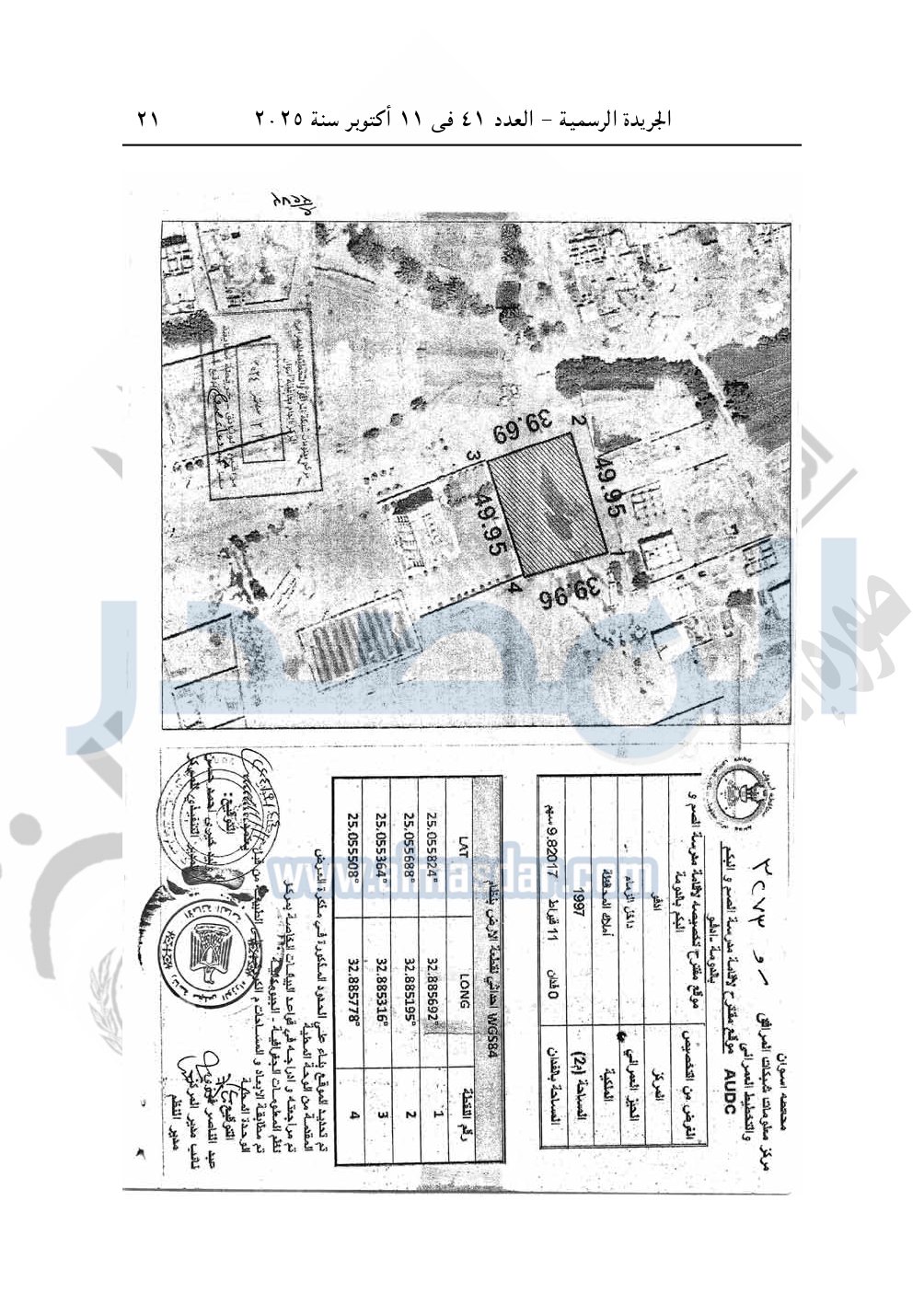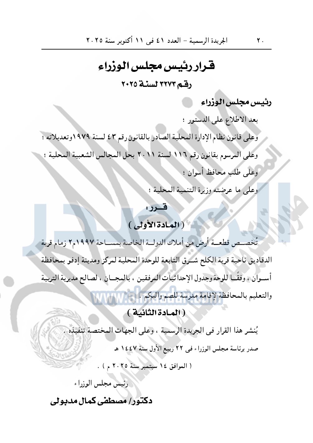 نشرت الجريدة الرسمية في العدد 41، بتاريخ 11 أكتوبر 2025، قرار رئيس مجلس الوزراء، رقم 3273 لسنة 2025، بشأن تخصيص قطعة أرض لصالح مديرية التربية والتعليم بمحافظة أسوان.
