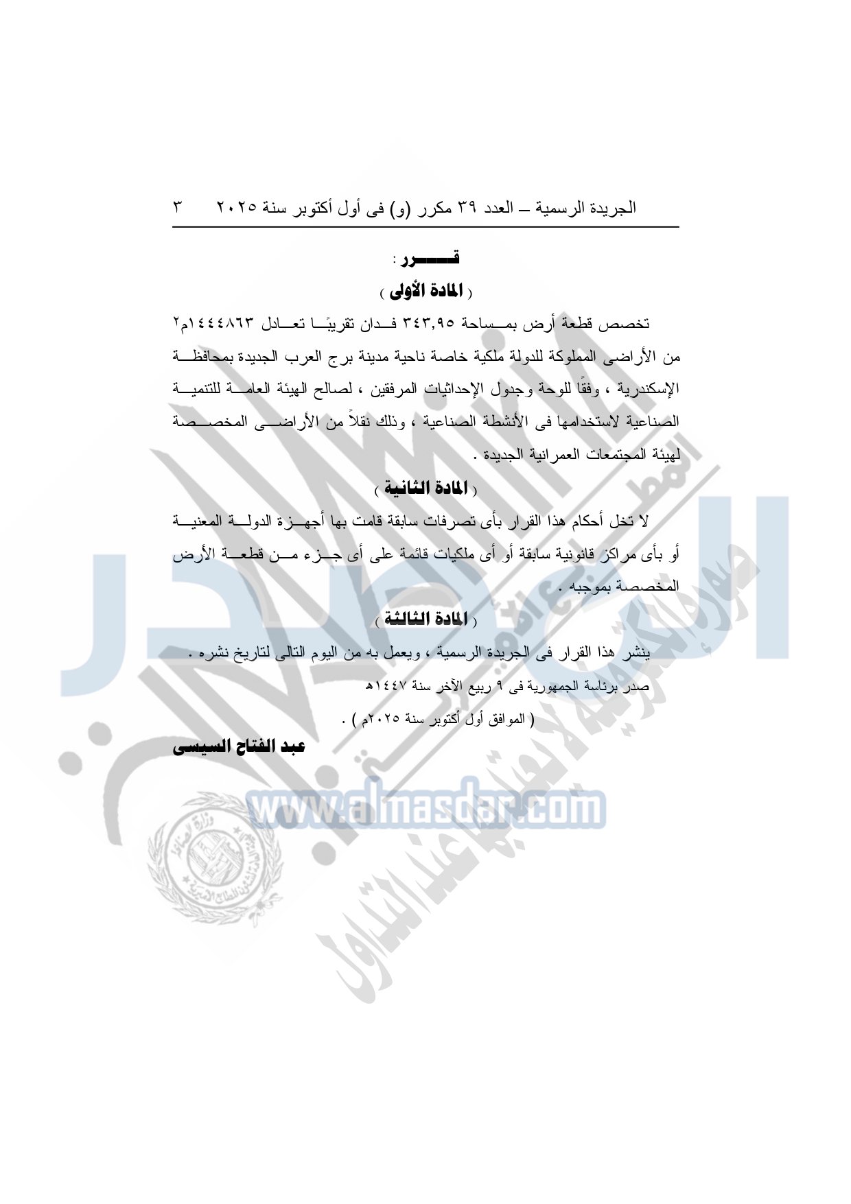 تخصص قطعة أرض بمساحة 343.95 فدان تقريبًا تعادل 1444863م2 من الأراضي المملوكة للدولة ملكية خاصة ناحية مدينة برج العرب الجديدة بمحافظة الإسكندرية، وفقا للوحة وجدول الإحداثيات المرفقين، لصالح الهيئة العامة للتنمية الصناعية لاستخدامها في الأنشطة الصناعية، وذلك نقلاً من الأراضي المخصصة لهيئة المجتمعات العمرانية الجديدة.