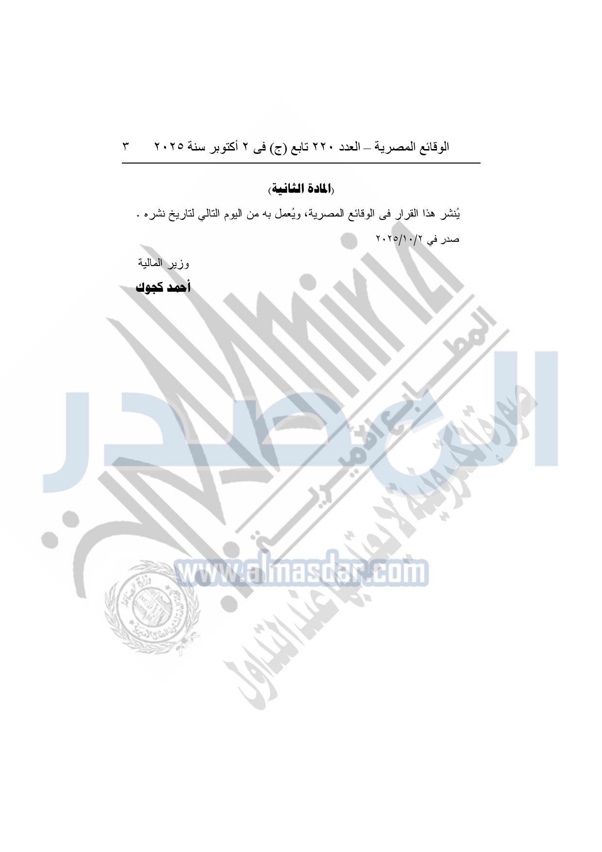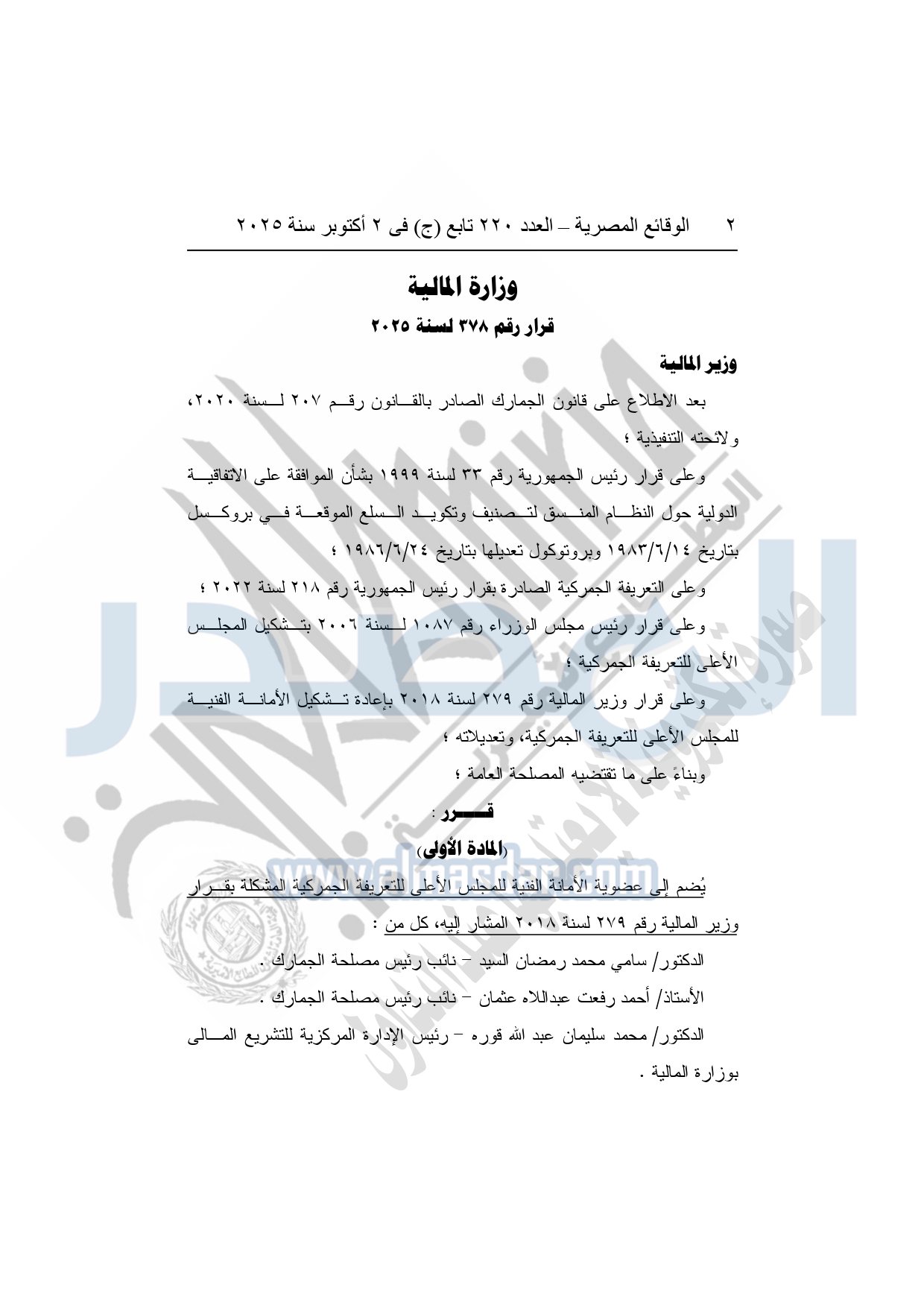 نشرت الوقائع المصرية في العدد 220 تابع "ج"، بتاريخ 2 أكتوبر 2025، قرار وزارة المالية، رقم 378 لسنة 2025، بشأن إعادة تشكيل الأمانة الفنية للمجلس الأعلى للتعريفة الجمركية.