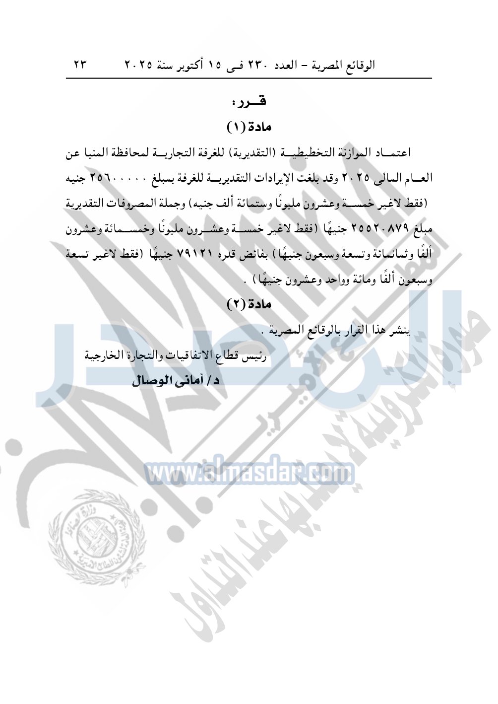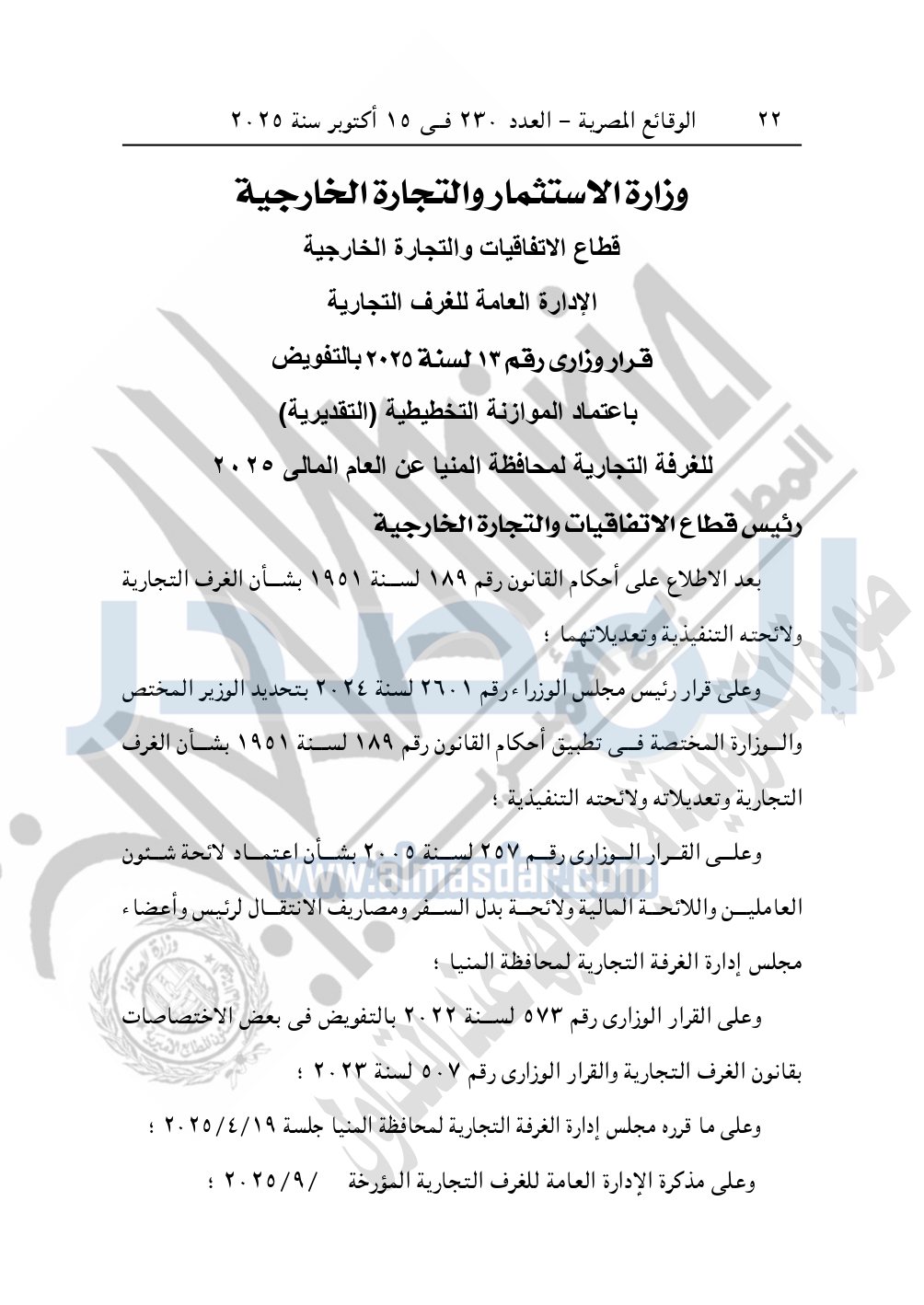 نشرت الوقائع المصرية في العدد 230، الصادر بتاريخ 15 أكتوبر 2025، قرار وزارة الاستثمار والتجارة الخارجية، قطاع الاتفاقيات والتجارة الخارجية، الإدارة العامة للغرف التجارية، قرار وزاري رقم 13 لسنة 2025، بشأن التفويض باعتماد الموازنة التخطيطية "التقديرية" للغرفة التجارية لمحافظة المنيا عن العام المالي 2025.