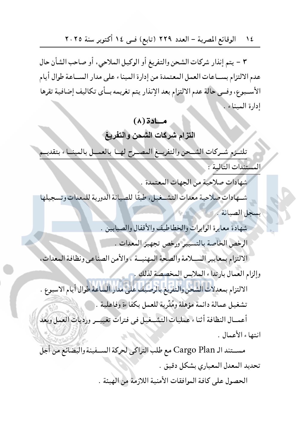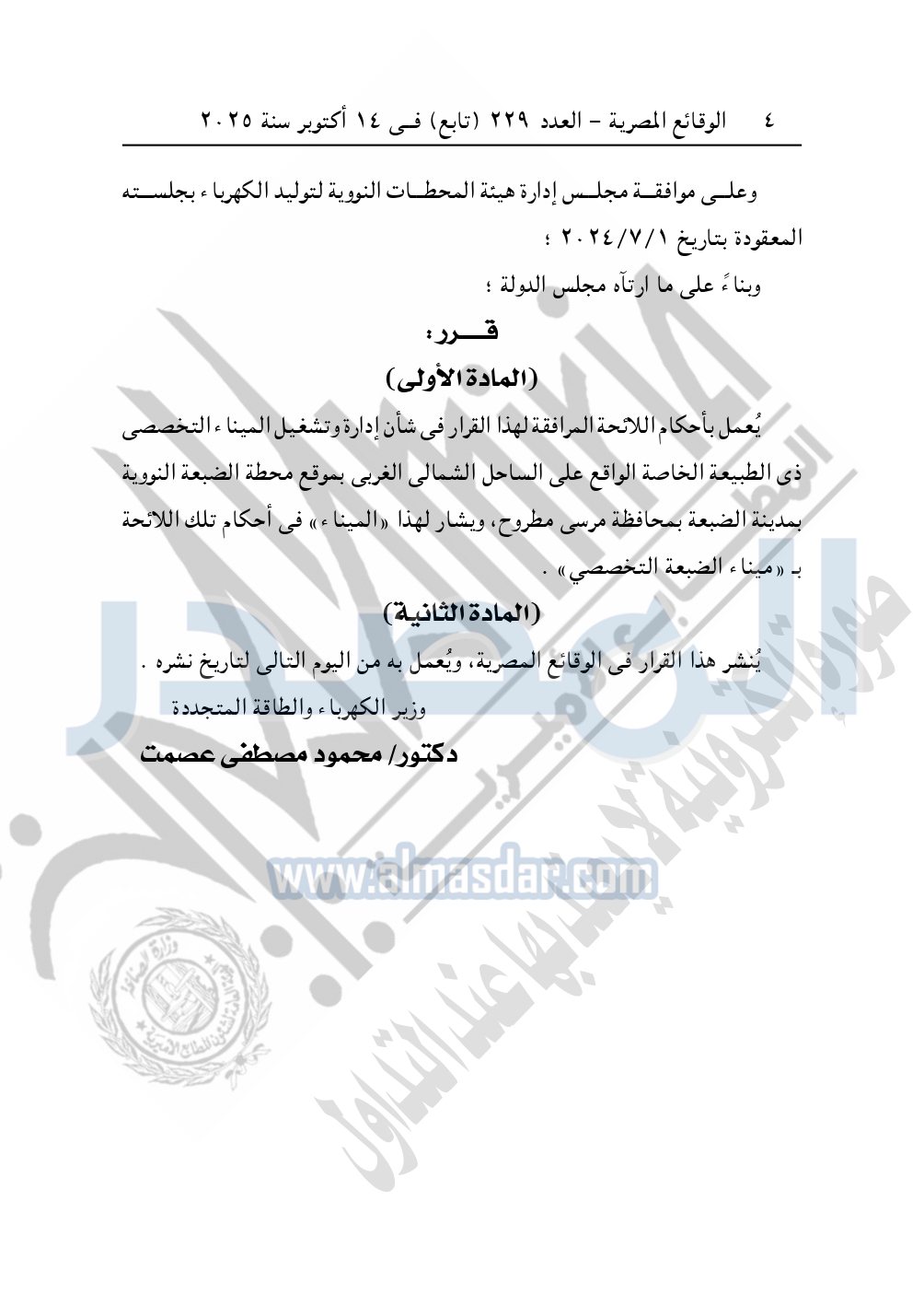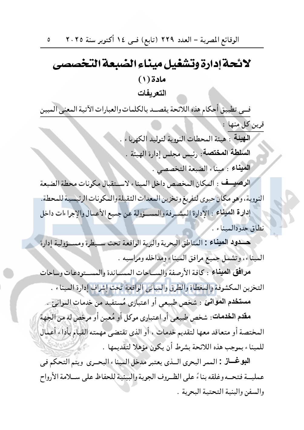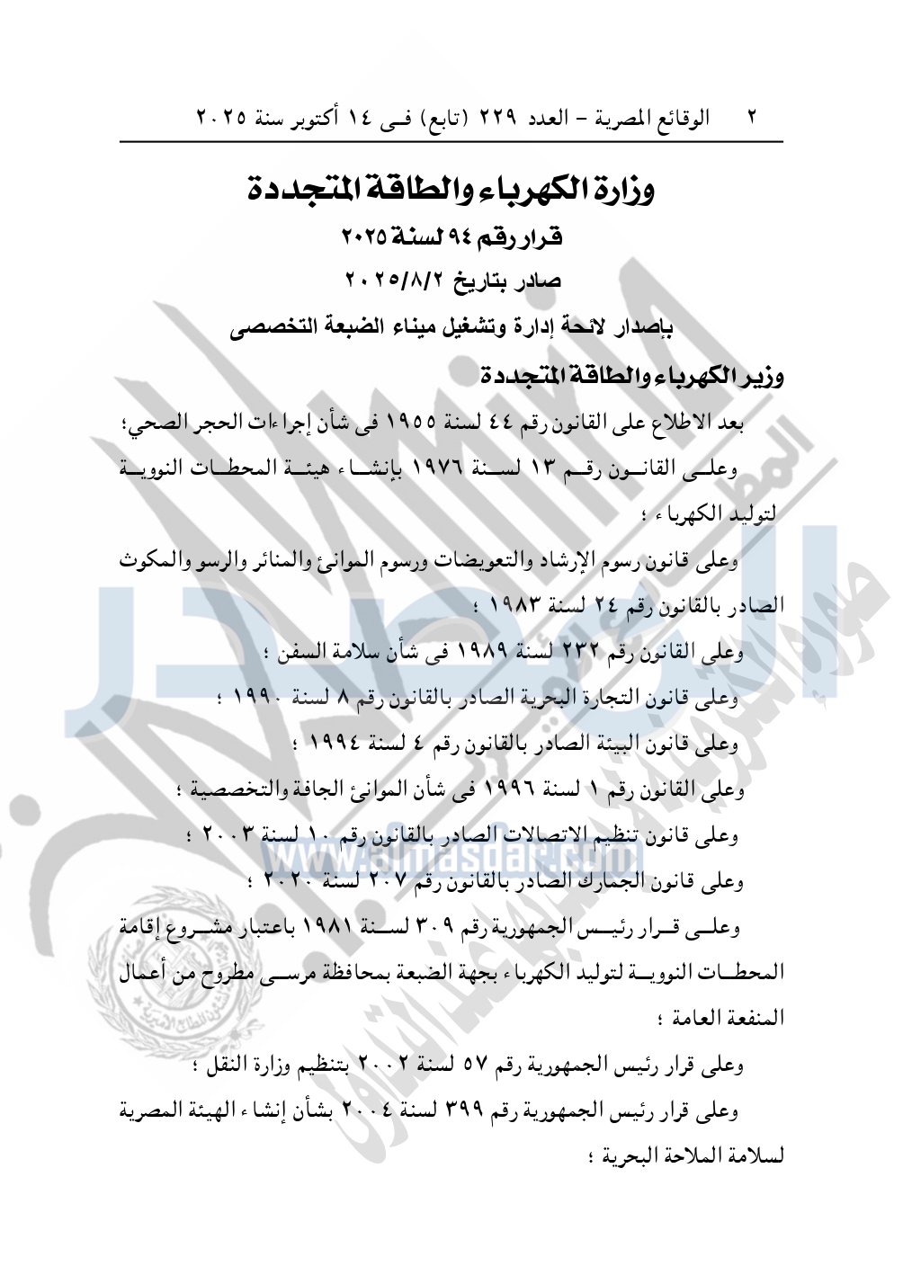 نشرت الوقائع المصرية في العدد 229 "تابع"، الصادر بتاريخ 14 أكتوبر 2025، قرار وزارة الكهرباء والطاقة المتجددة، رقم 94 لسنة 2025، صادر بتاريخ 2-8-2025، بشأن إصدار لائحة إدارة وتشغيل ميناء الضبعة التخصصي.
